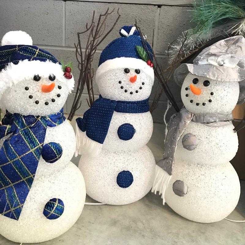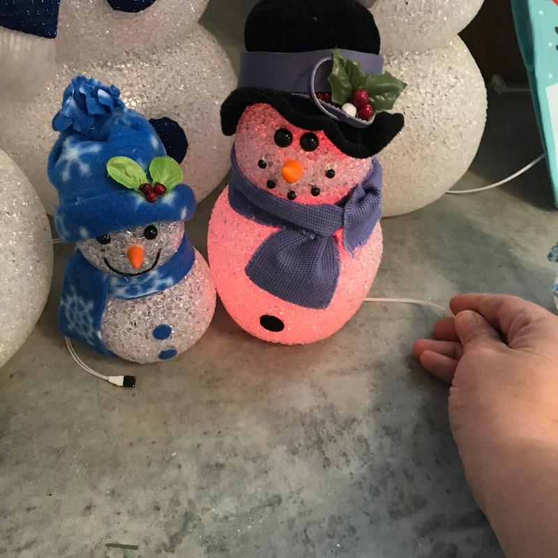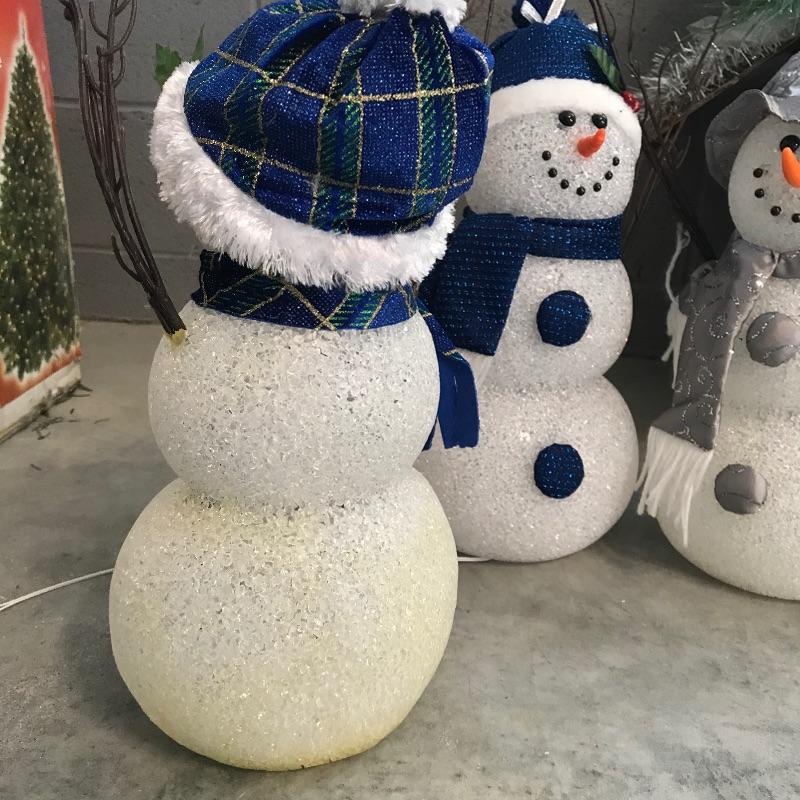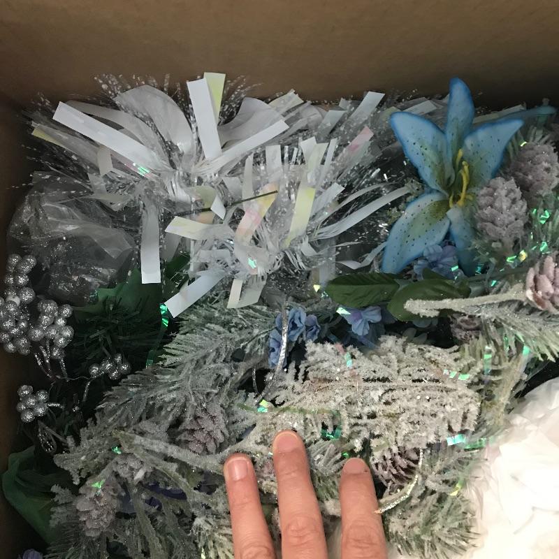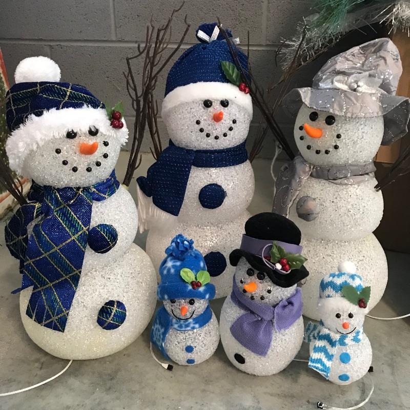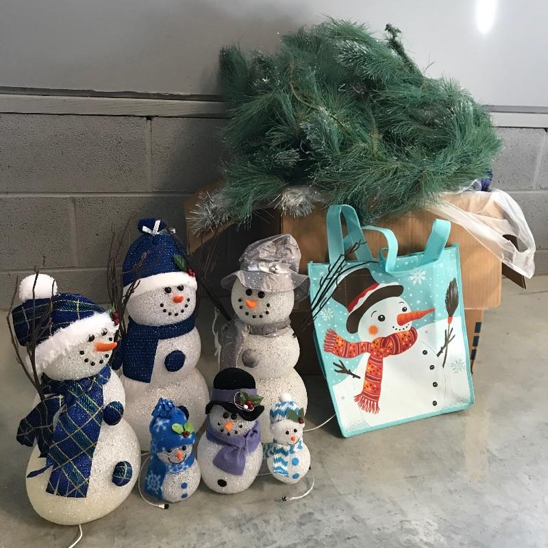 Three large and three small snow people that have light-up capabilities. Only one snow child had a battery installed, he has a rotating palate of colors. The working condition of the others will remain unknown until batteries are installed. The taller snowmen are about 16”, one has a mild yellow coloring on the bottom. We’ve paired this cute family with a big box full of holiday spirit! Christmas and holiday garland, beads and floral. See photos. No shipping.