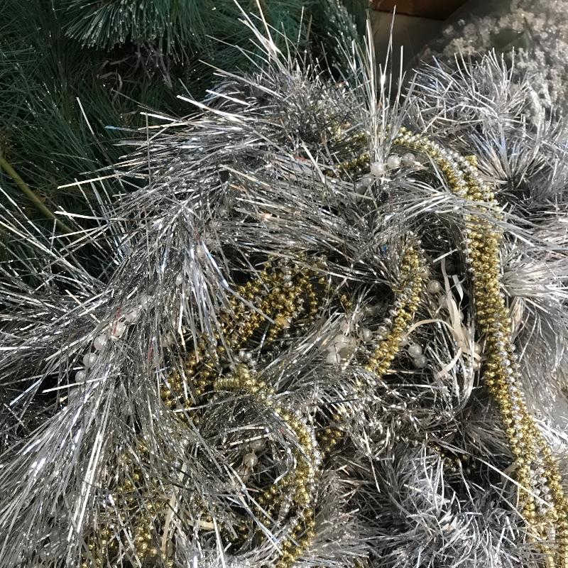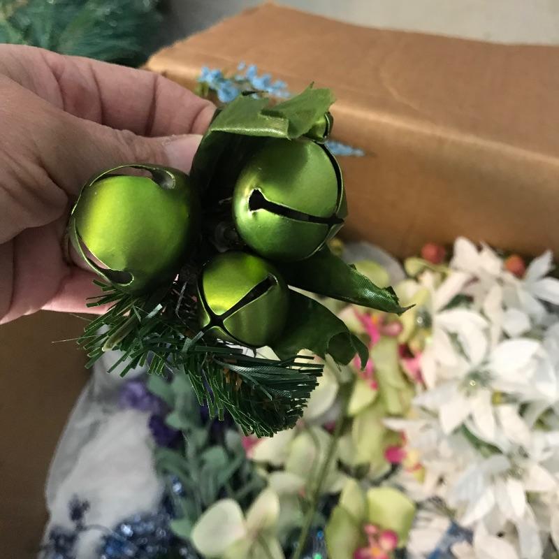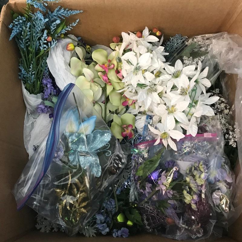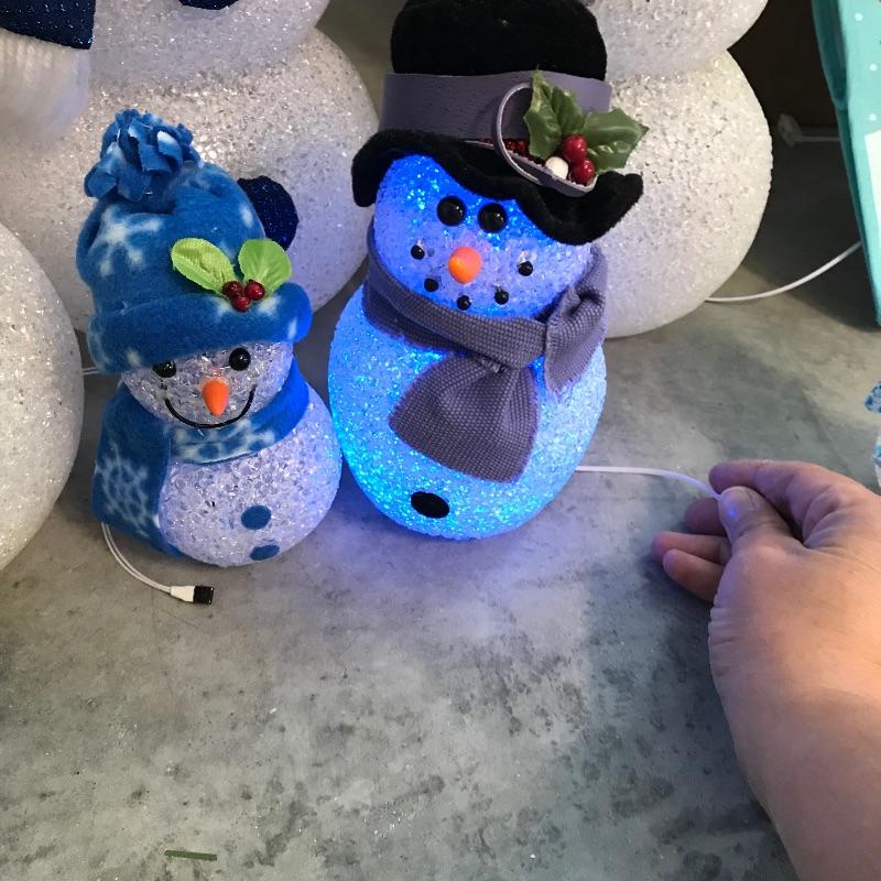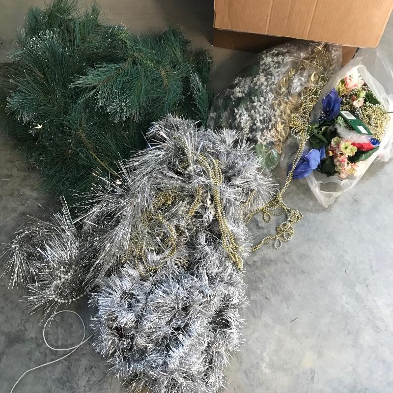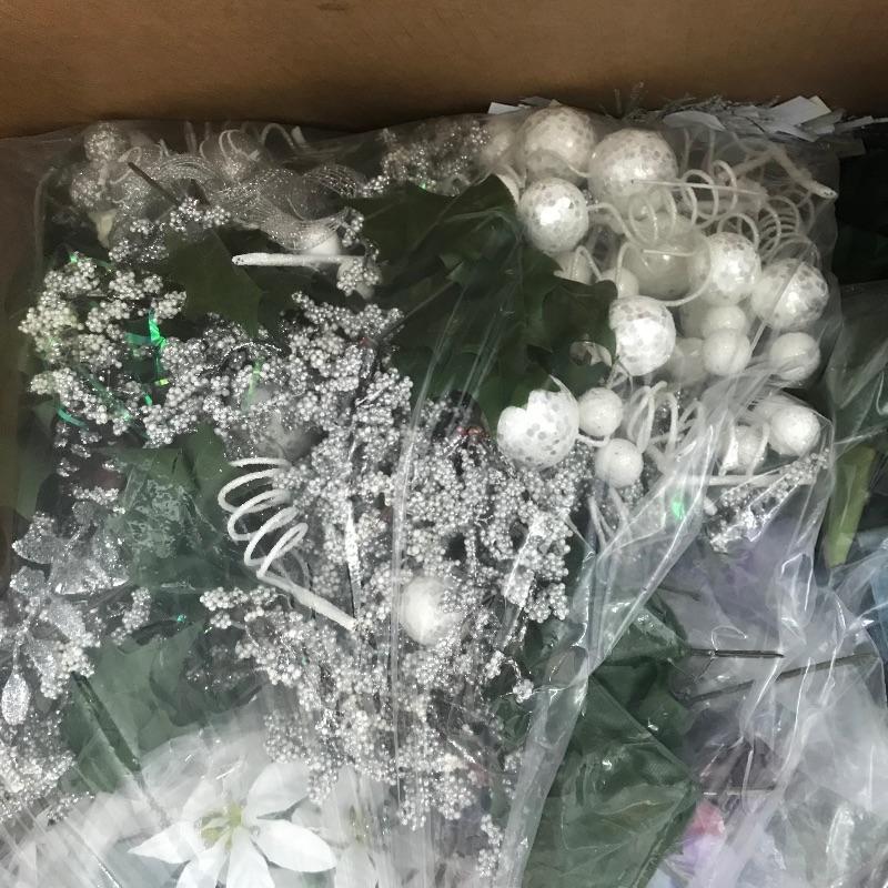 Three large and three small snow people that have light-up capabilities. Only one snow child had a battery installed, he has a rotating palate of colors. The working condition of the others will remain unknown until batteries are installed. The taller snowmen are about 16”, one has a mild yellow coloring on the bottom. We’ve paired this cute family with a big box full of holiday spirit! Christmas and holiday garland, beads and floral. See photos. No shipping.