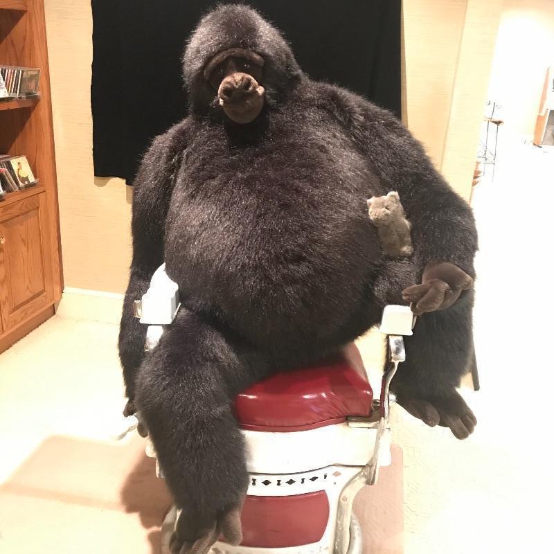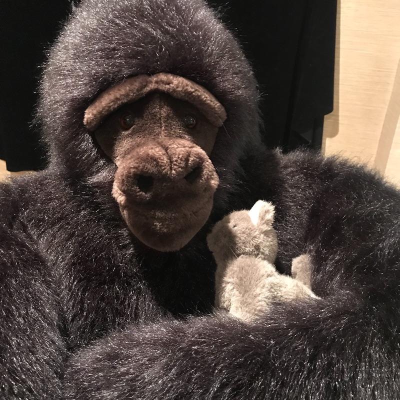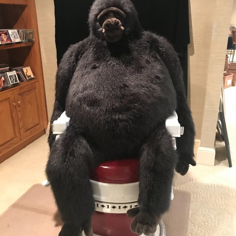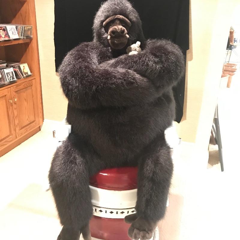 Koko, the gorilla that learned signed language! This stuffed animal is in honor of the gorilla and her kitten that she received on her birthday in 1984. Koko named her new Manx kitten “All Ball”. This nearly life sized gorilla and tiny kitten are a sweet display and reminder of wonderful scientific study from the 80’s. Local pick up only.