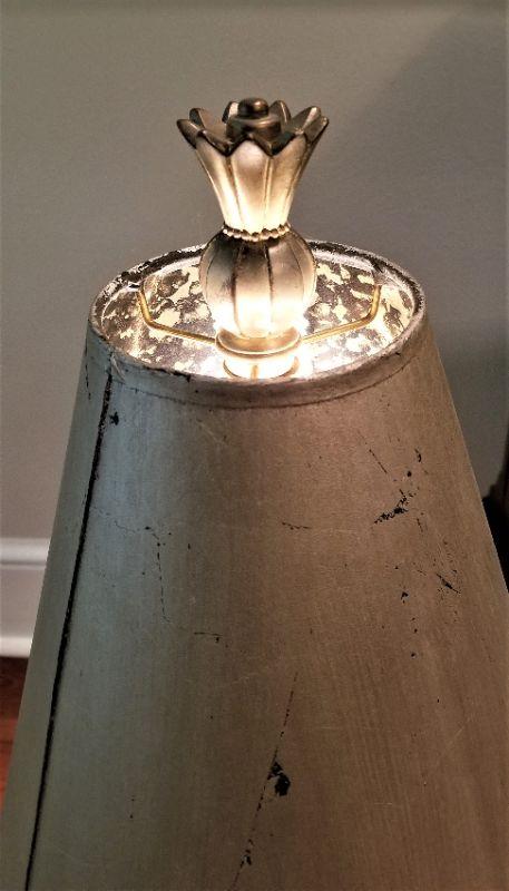 Interesting table lamp, brass base, pineapple finial. 6" across at the base, 34" tall. Good working condition.