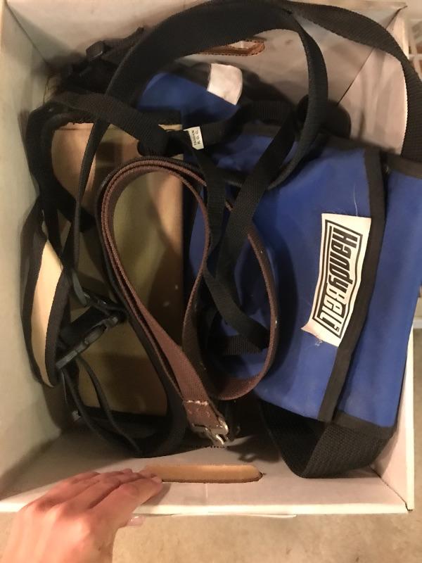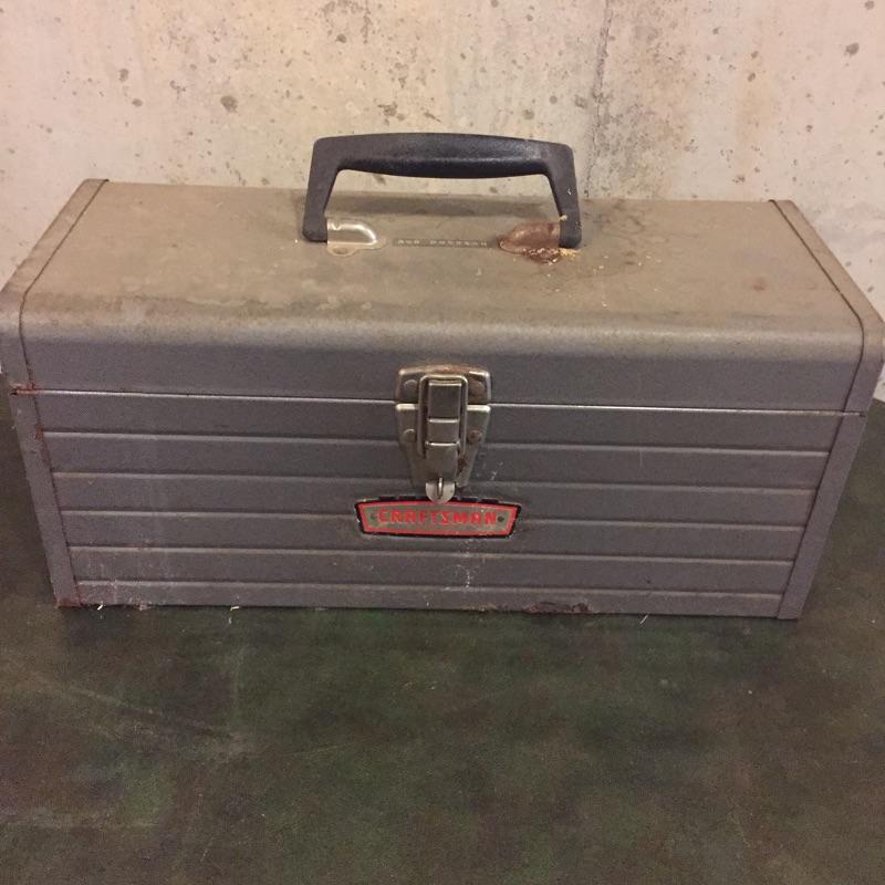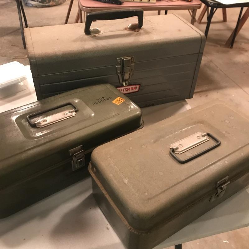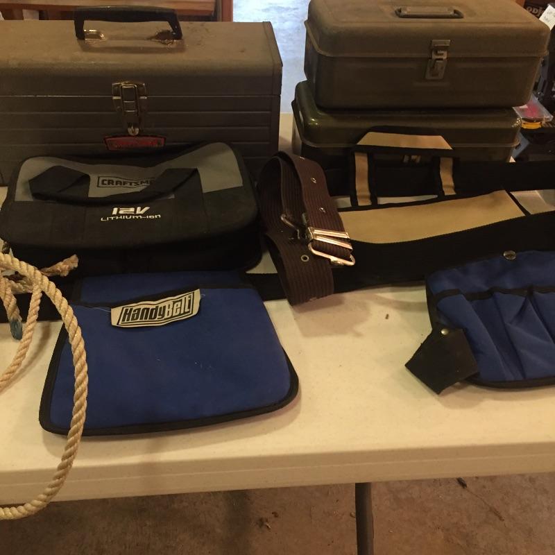 Three toolboxes one is a Craftsman , HandyBelt tool belt and others. Craftsman toolbox measures 7” x 17” x 7.5”.