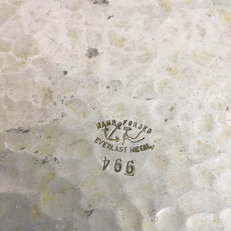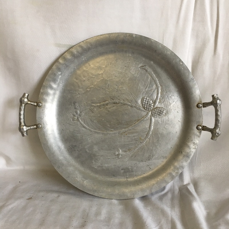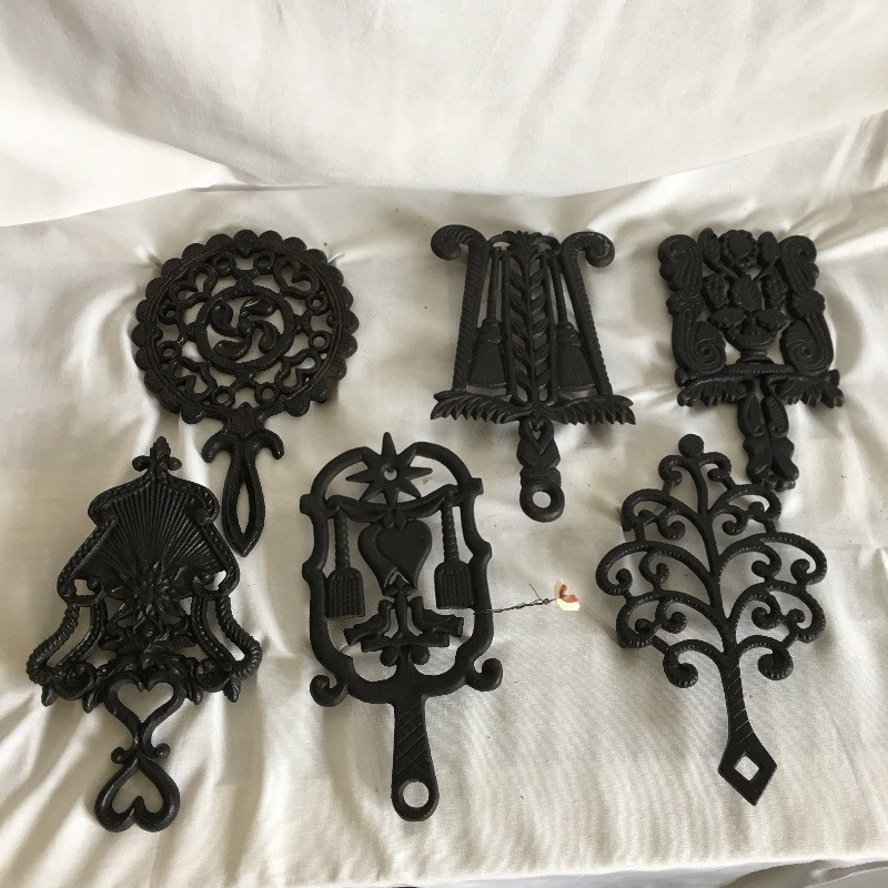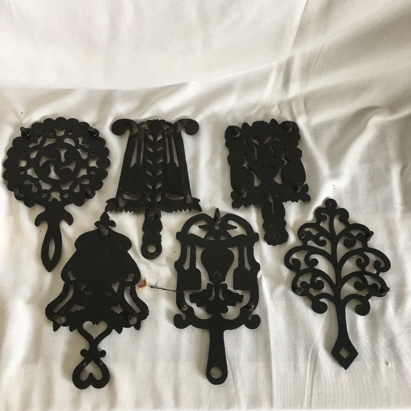 Six beautiful flack trivets and a pewter serving tray with an intricate unusual motif.