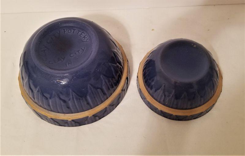 I just love these old mixing bowls - this lot has two nice cobalt blue ones from Clay City Pottery. Larger one is 6.75" across, 3" tall, smaller is 5" across and 2.5" tall.
