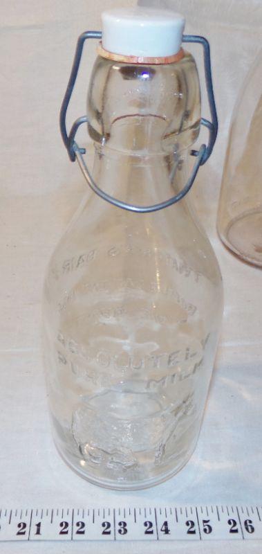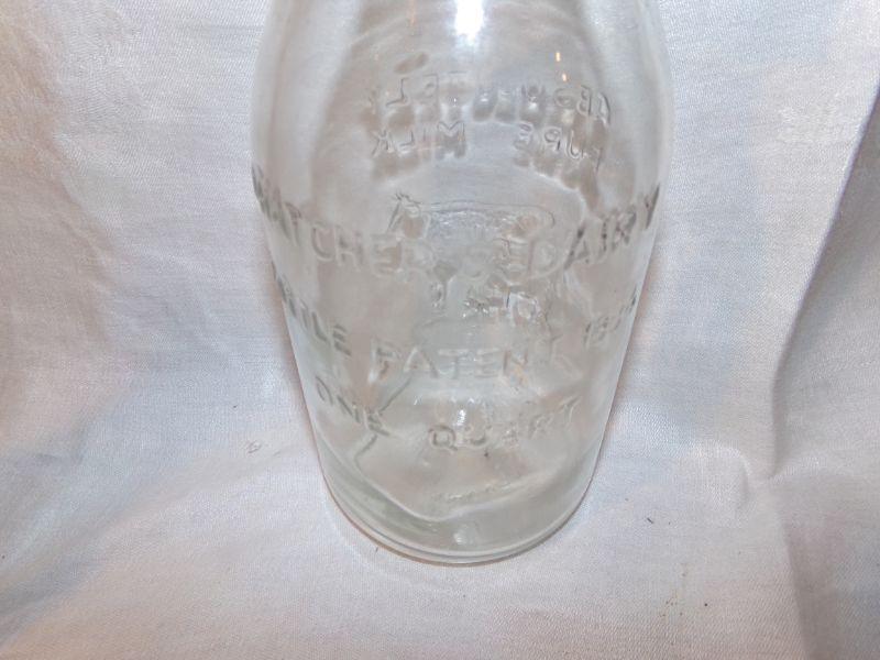 BOTTLE WITH HINGED LID READS, "ABSOLUTELY PURE MILK" ON THE OTHER SIDE IT READS, "THATCHER'S DAIRY BOTTLE PAT. 1884 ONE QUART"
