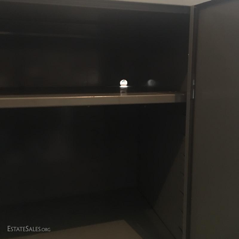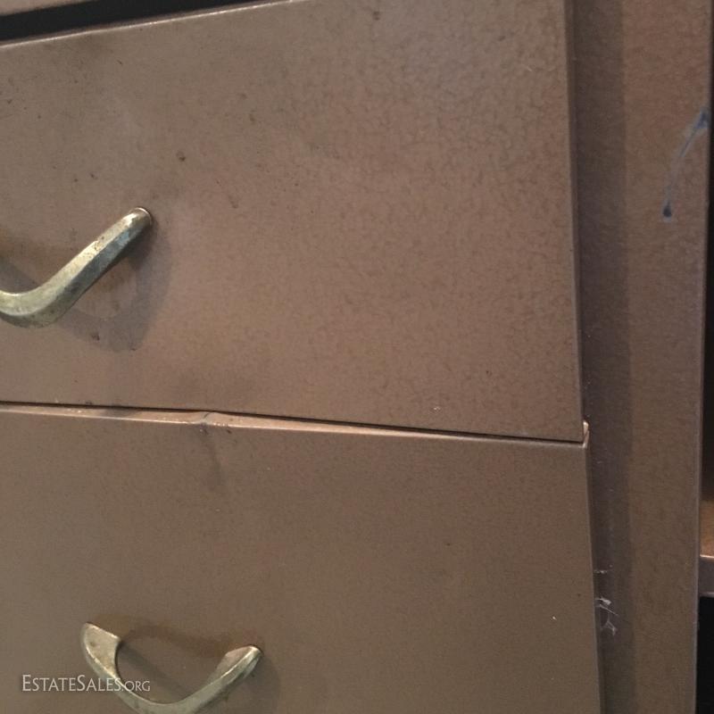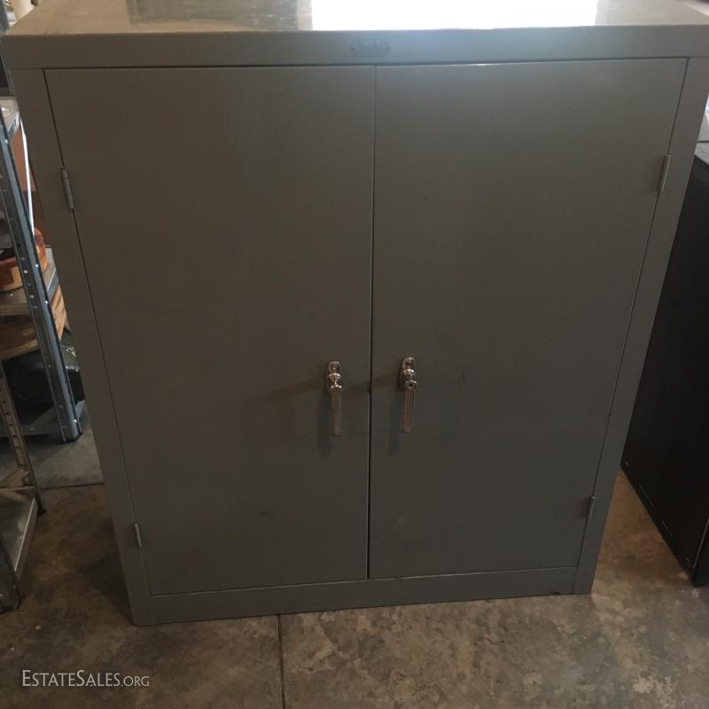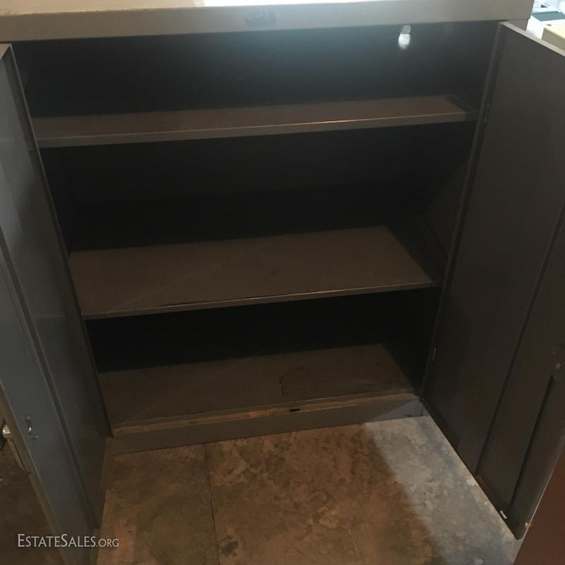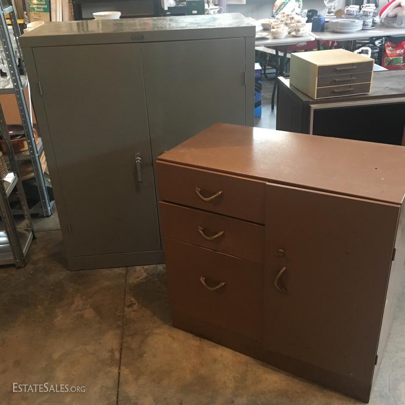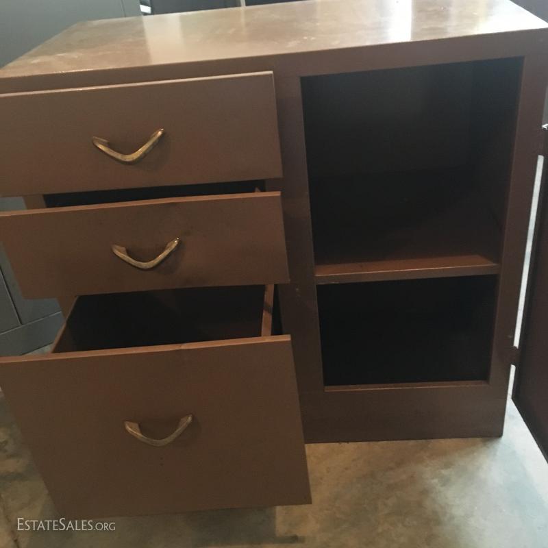 Brown metal cabinet with 3 drawers and cabinet (does lock) and a grey metal cabinet with 3 shelves and a locking door (no key).