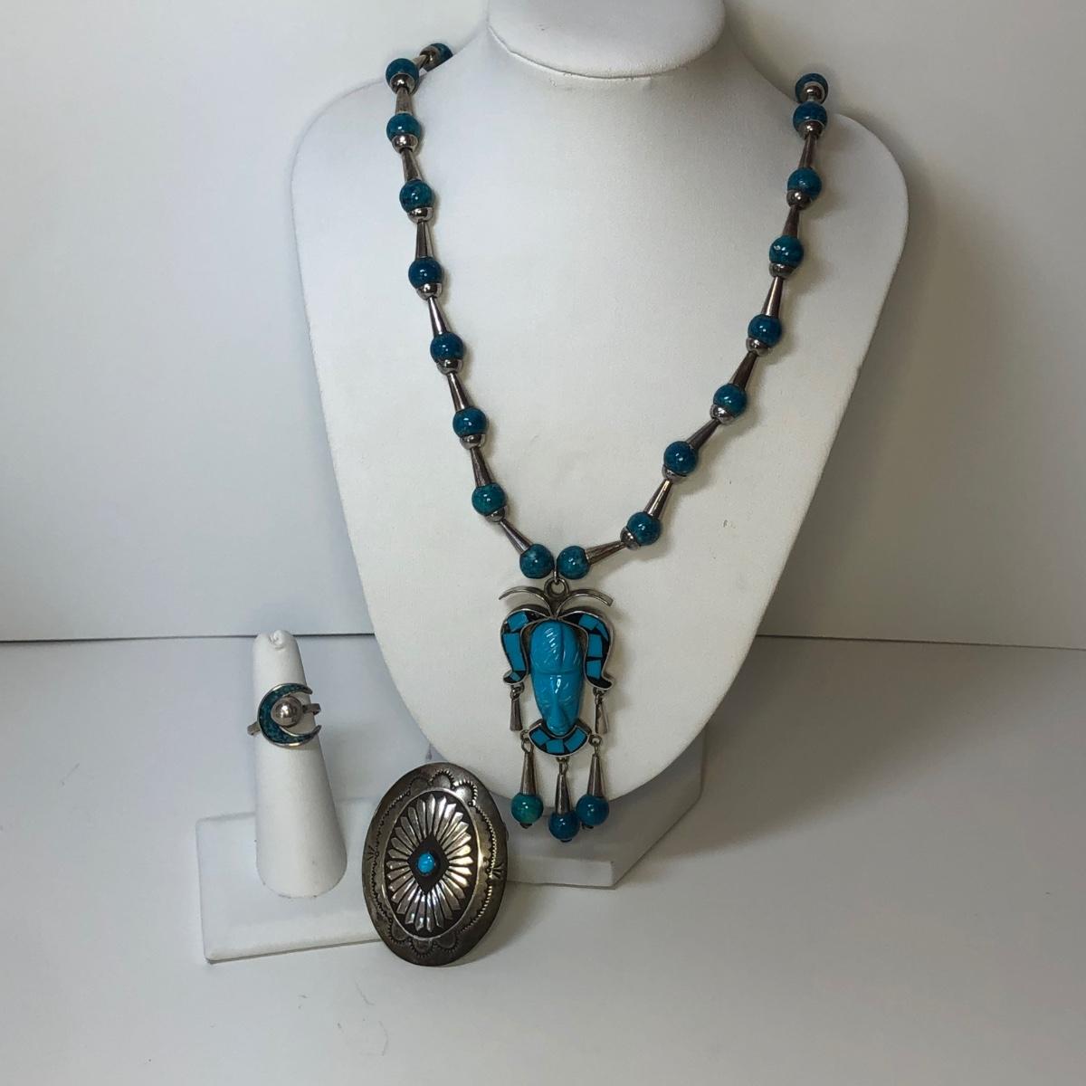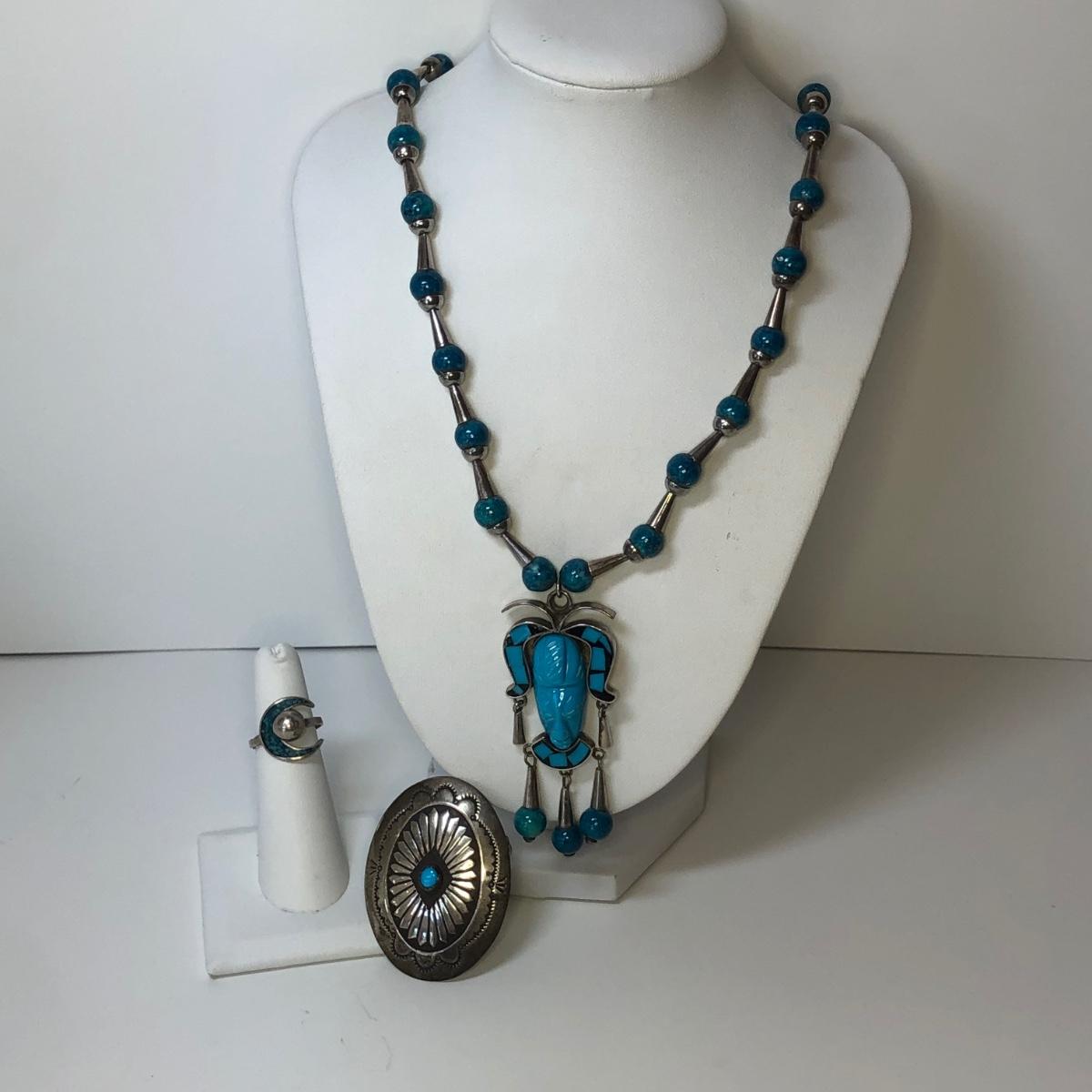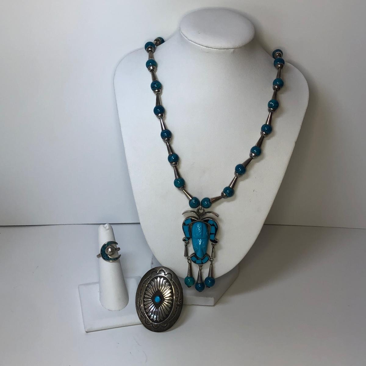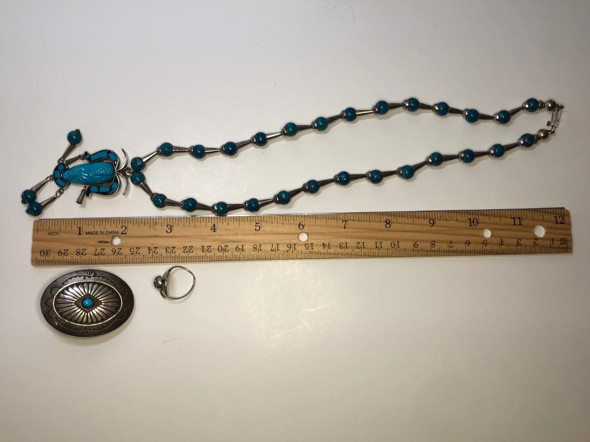 LOT 161M: Sterling Silver Necklace, Belt Buckle, & Ring