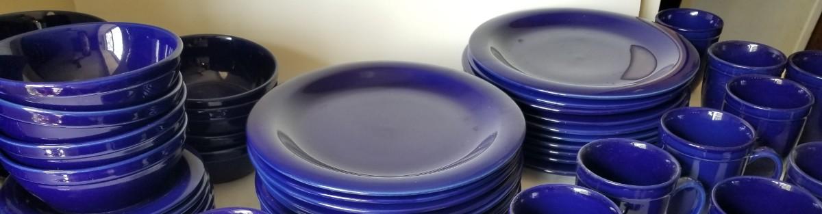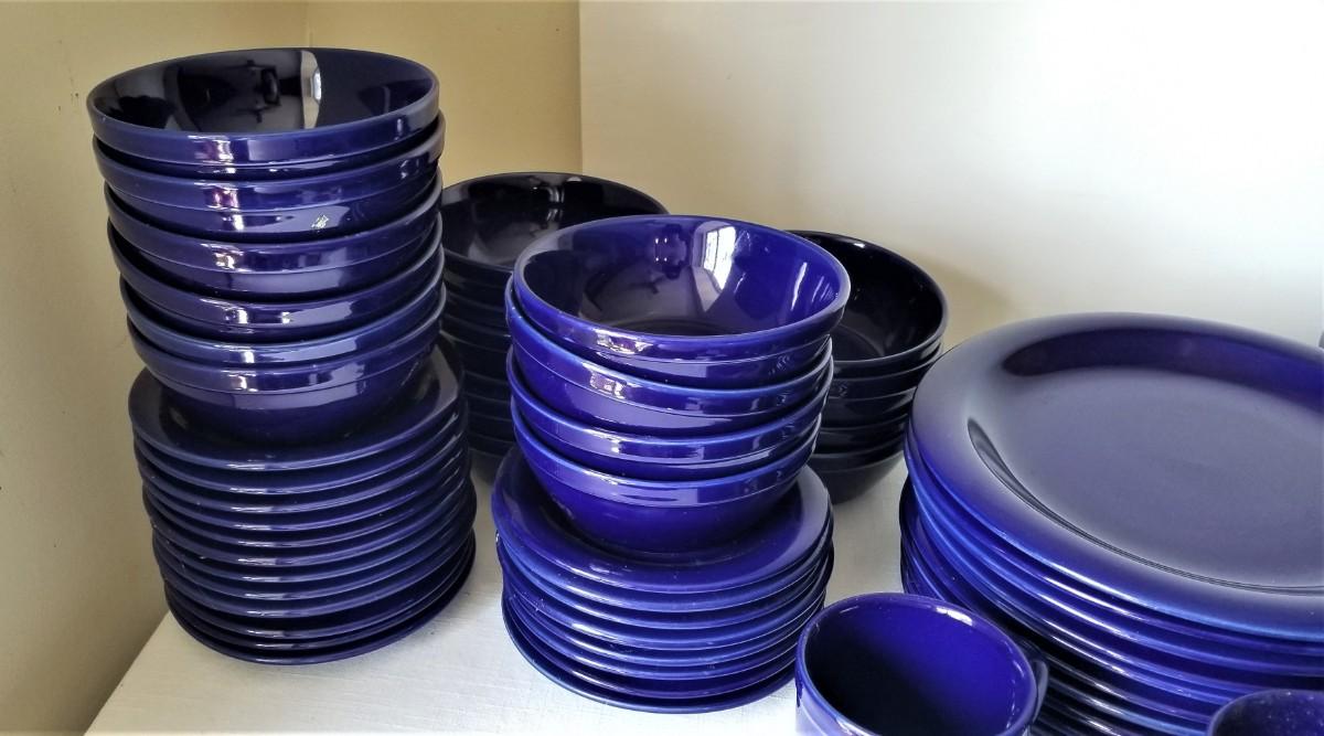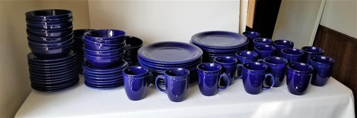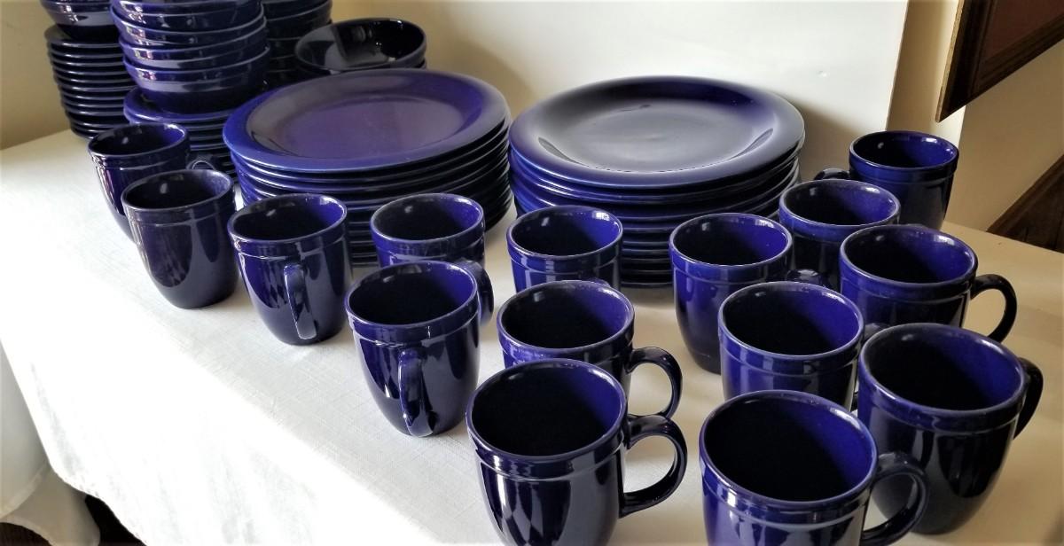 Large set of heavy duty cobalt blue dinnerware. You get all you see here - 20 plates (each 10.75" acros), 15 cups/20 saucers, 20 bowls, etc. All in good used condition.