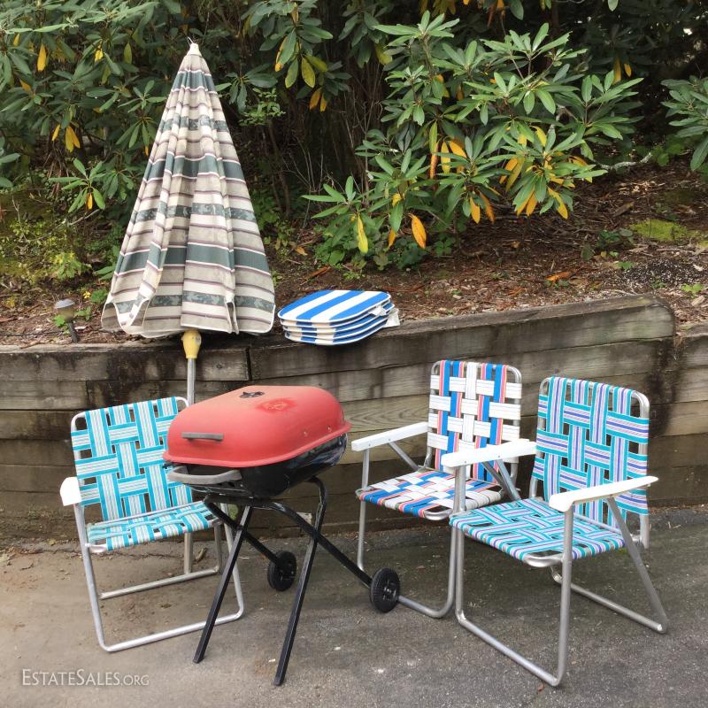 Get ready for the beach or camping, or just set up your back yard hang out. This lot includes charcoal grill and a few unopened bags of charcoal. Also includes an umbrella (need stand or table) and three folding chairs and seat cushions. See photos. No Shipping. Only local pick up in Flat Rock, NC.