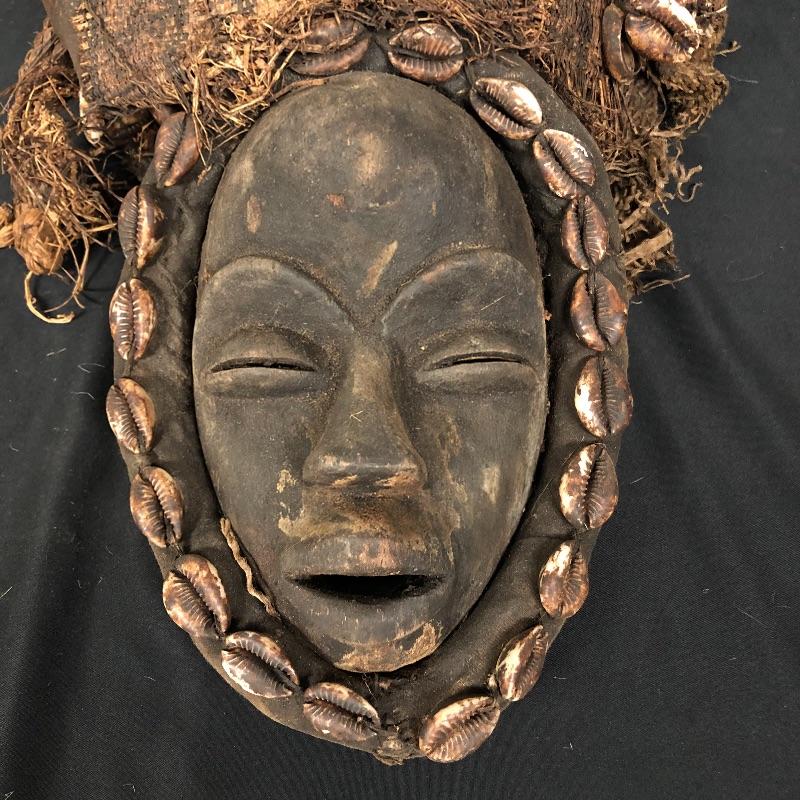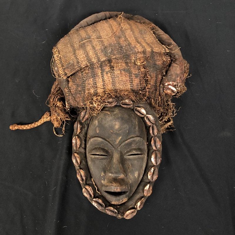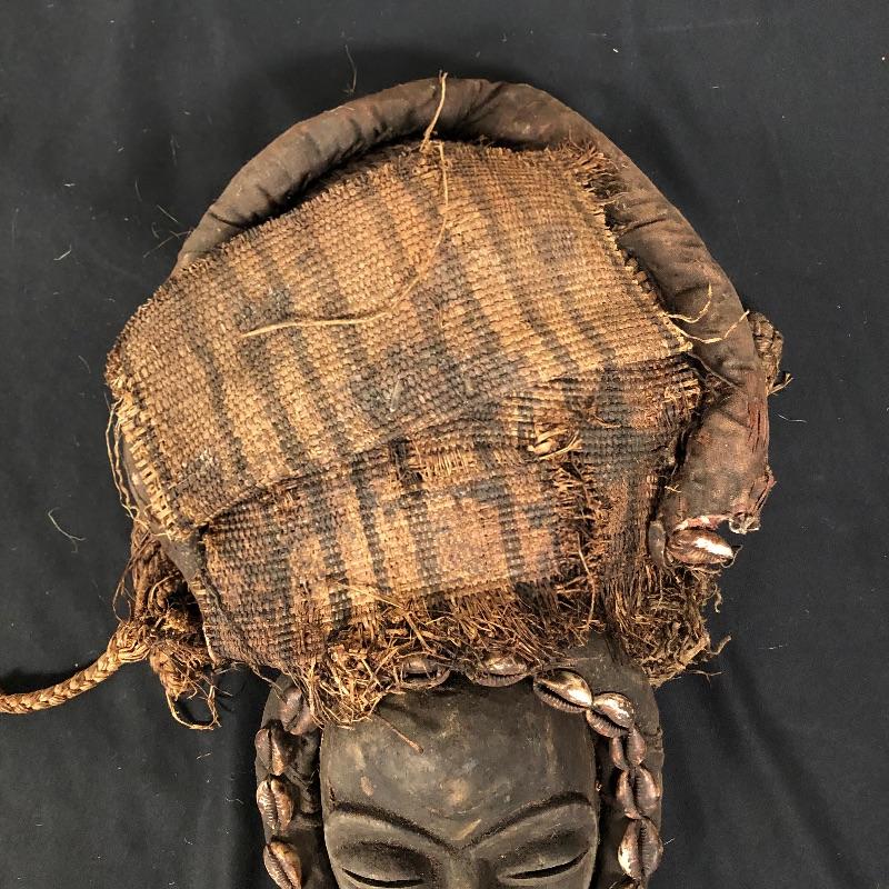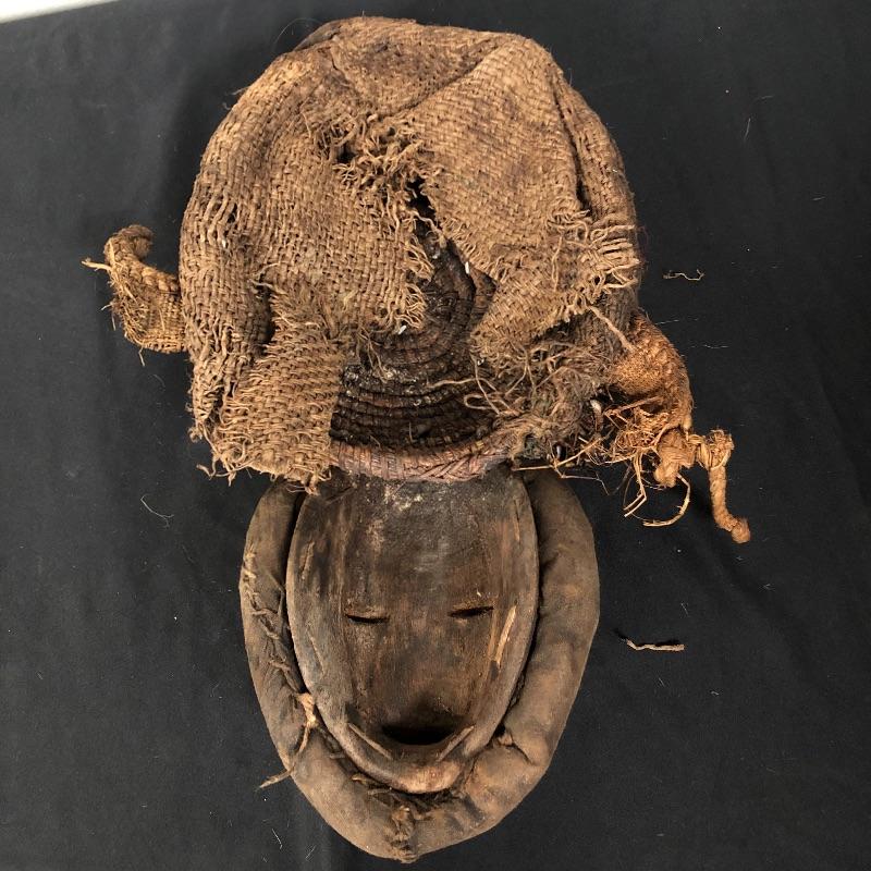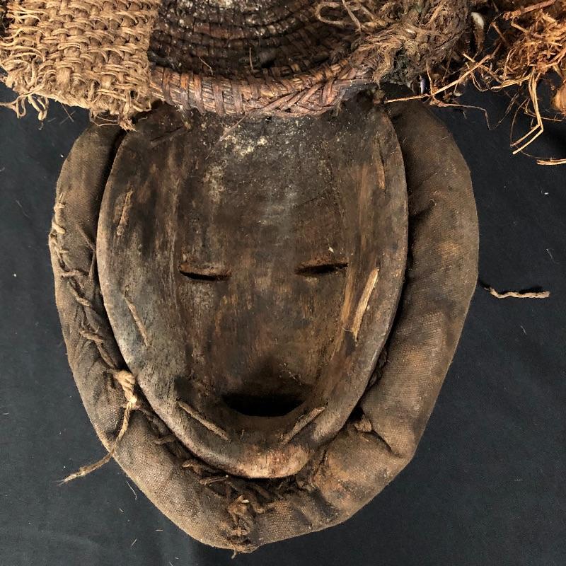 This mask (8” x 15”) is framed with shells and has a head piece that seems to be some sort of woven basket with a burlap sac over it. Unique and beautiful design