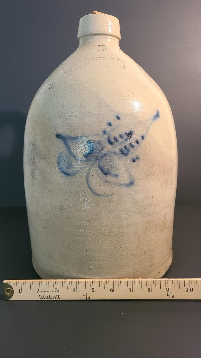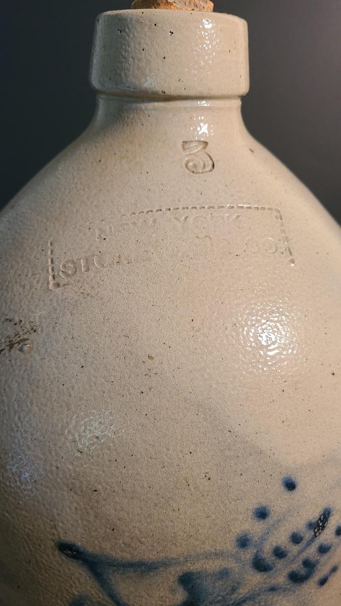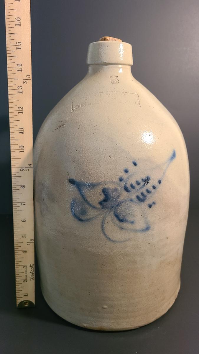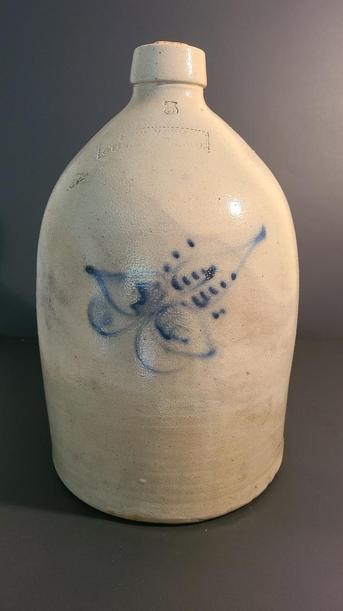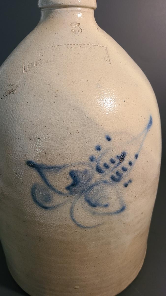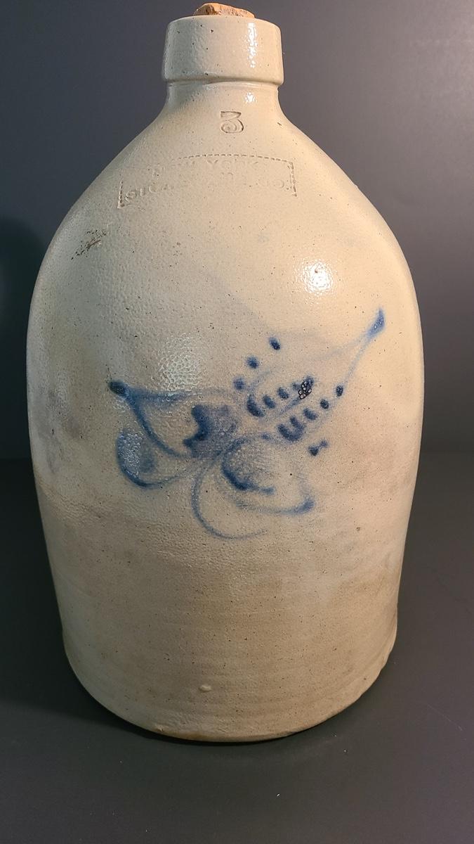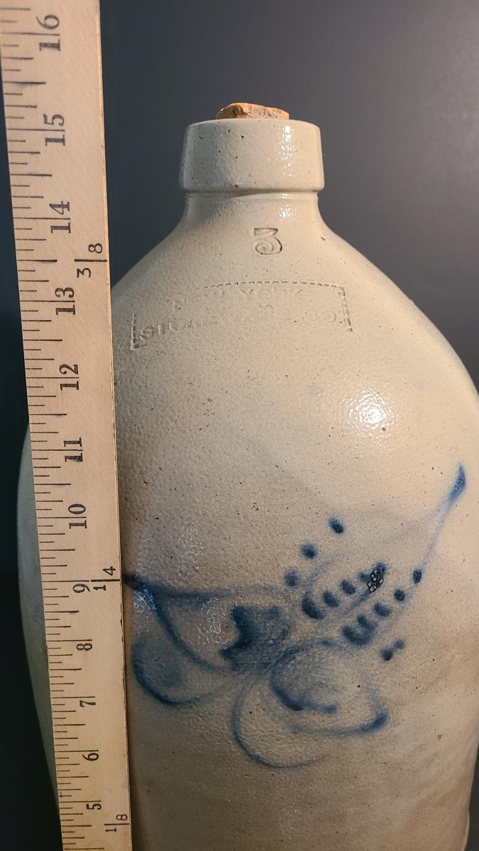 Antique salt glaze jug with cobalt blue design, stamped New York Stoneware Co 3. Please see pictures as they are the best representation of the item, the condition of the item, and the size of the item.