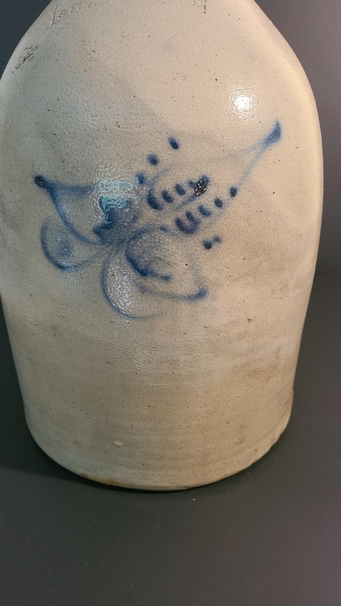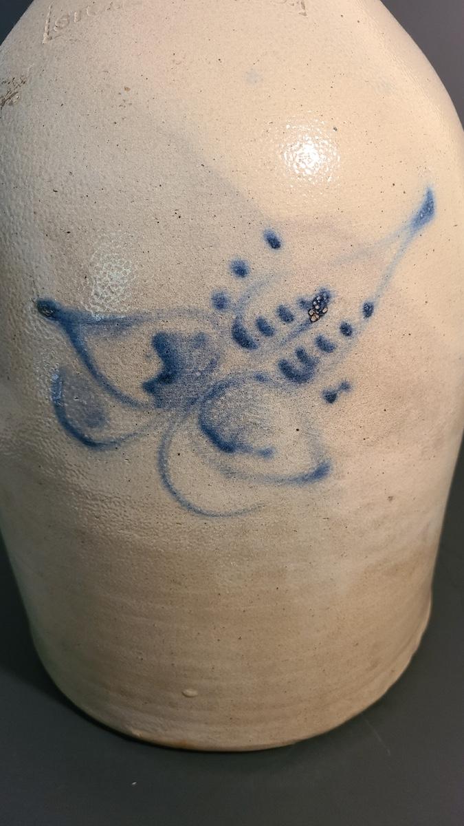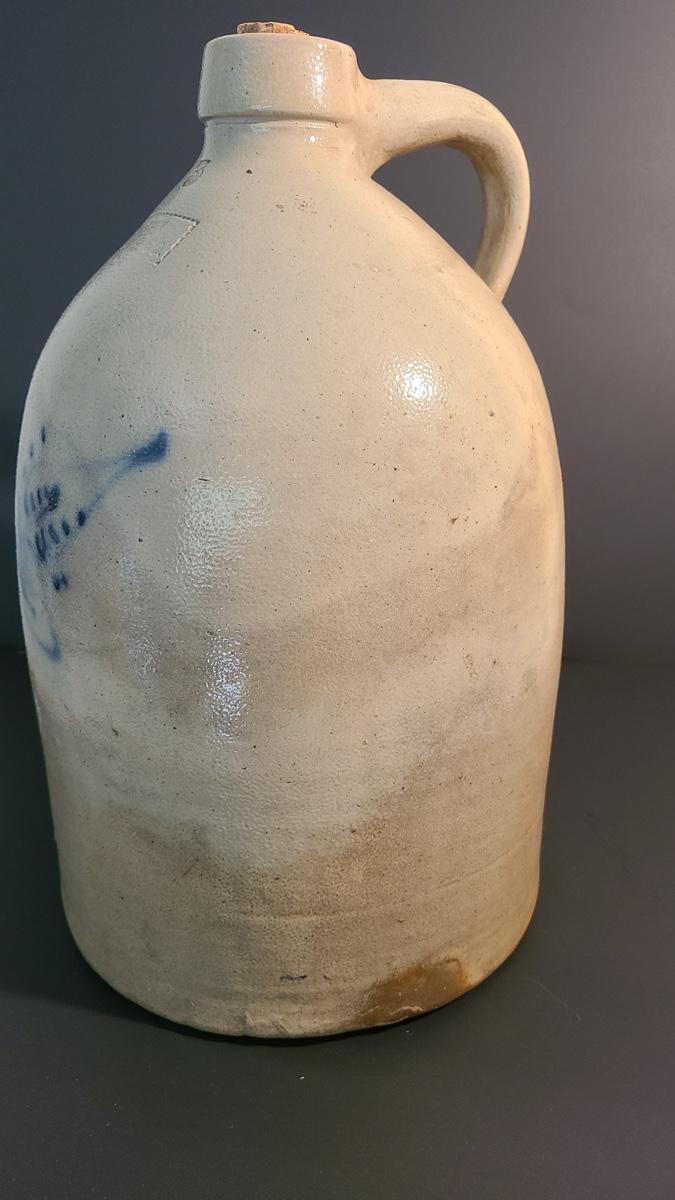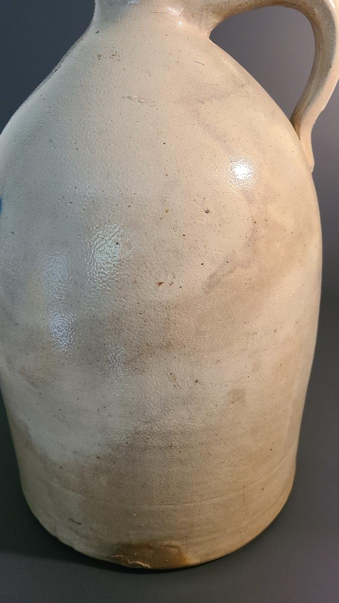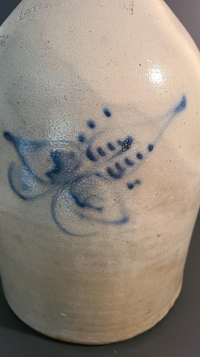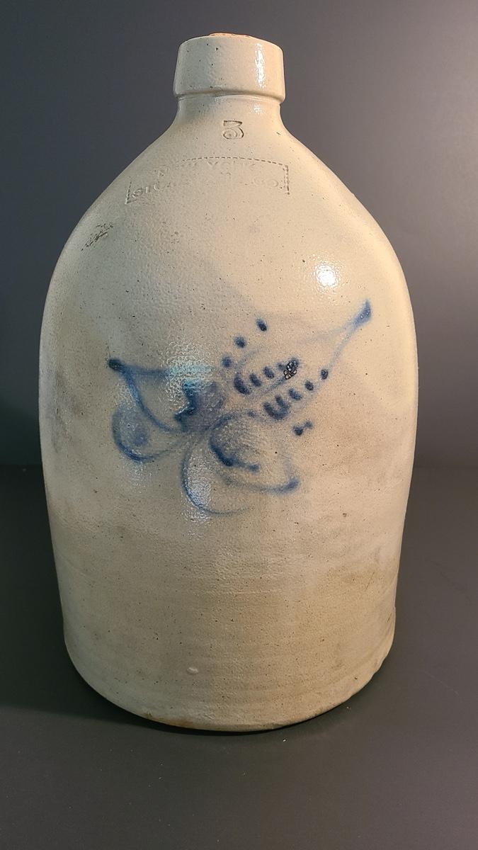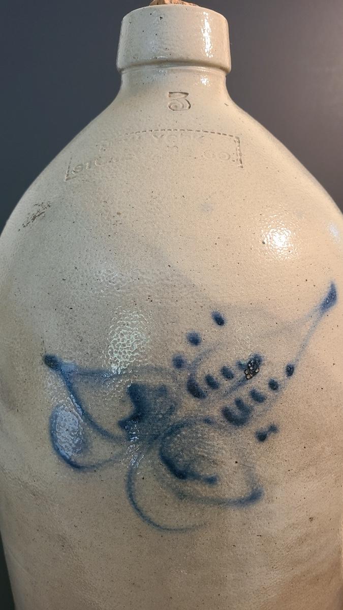 Antique salt glaze jug with cobalt blue design, stamped New York Stoneware Co 3. Please see pictures as they are the best representation of the item, the condition of the item, and the size of the item.