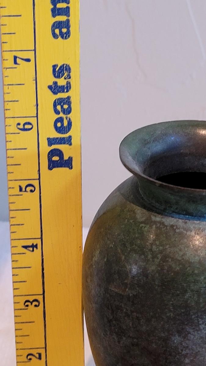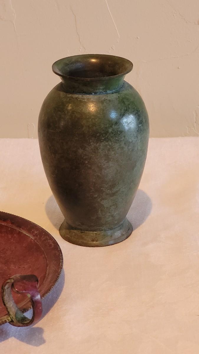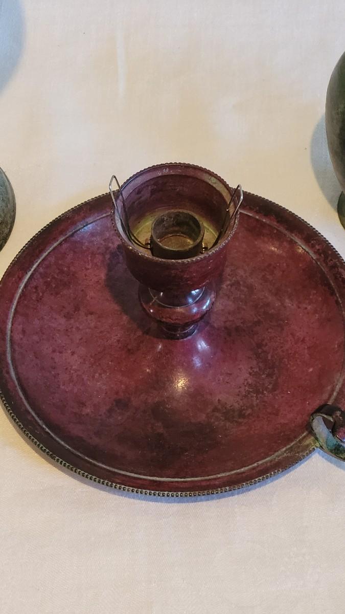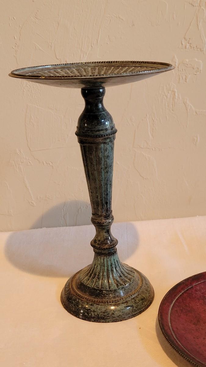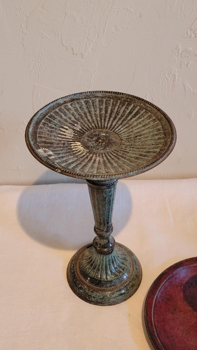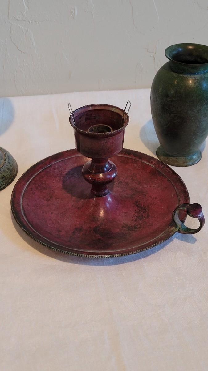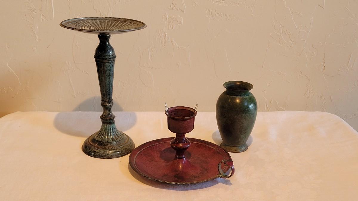Lot 162: Red Metal Candleholder, Patina Metal Vase and Pedestal Deco