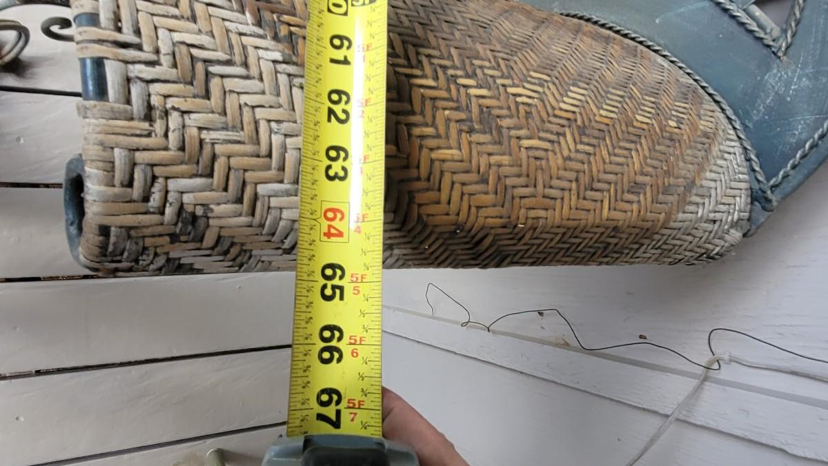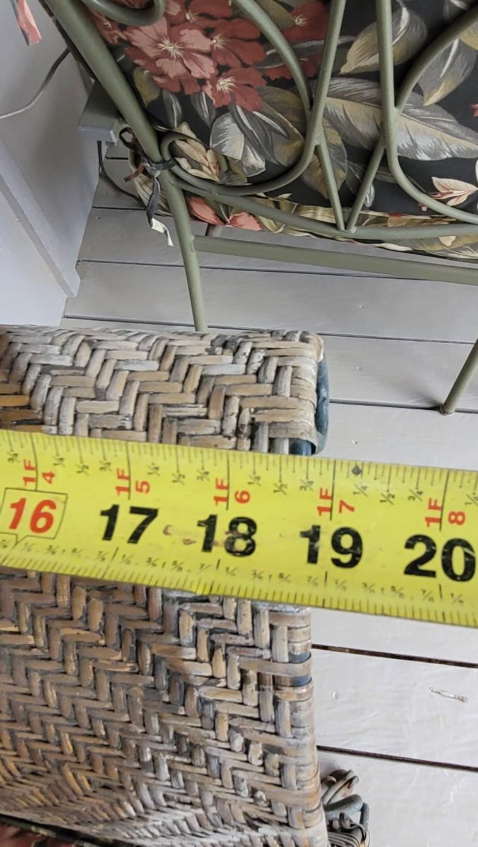 Has been enjoyed on a covered deck. Has some broken wicker by the metal. Still has life left!