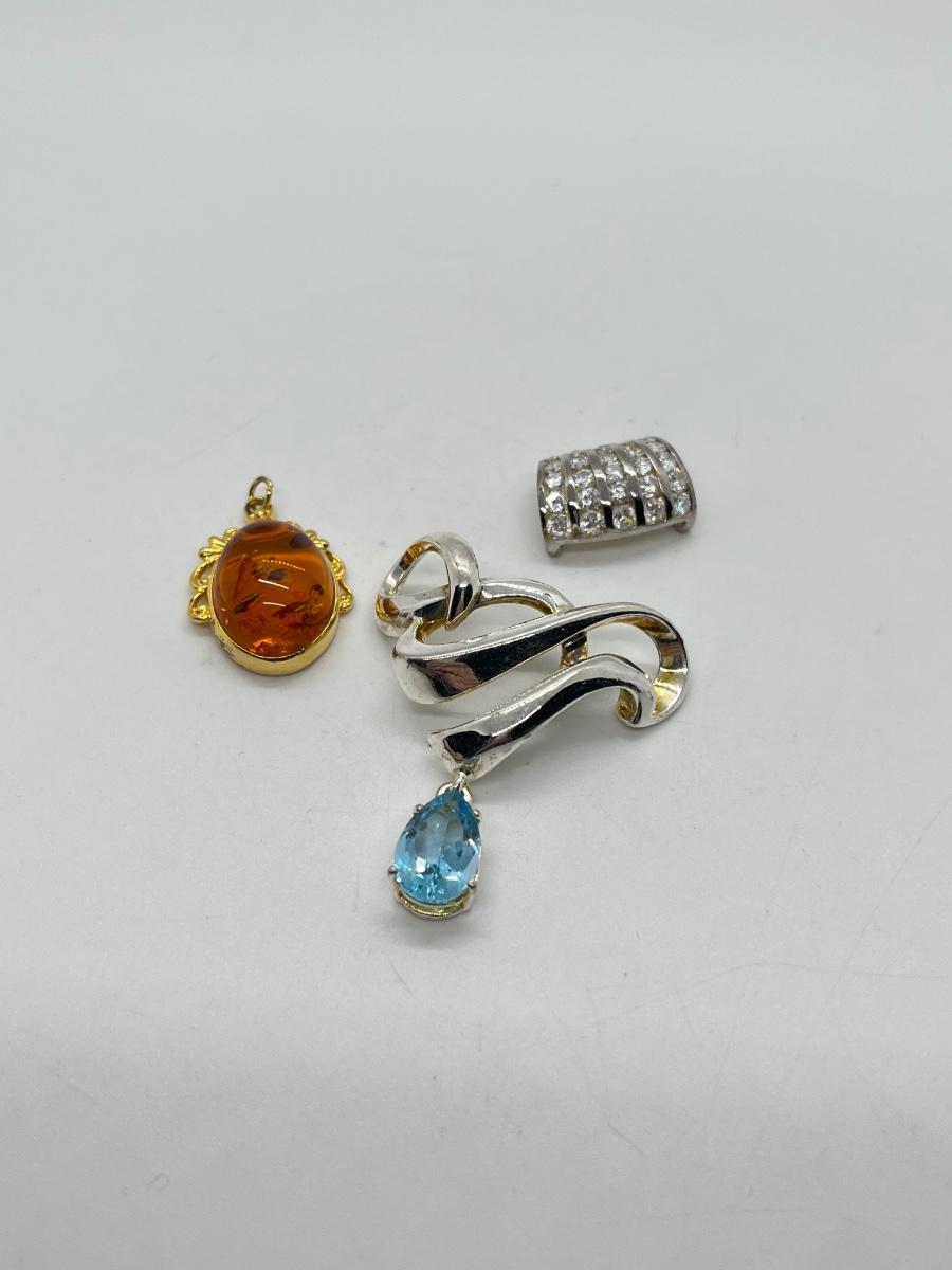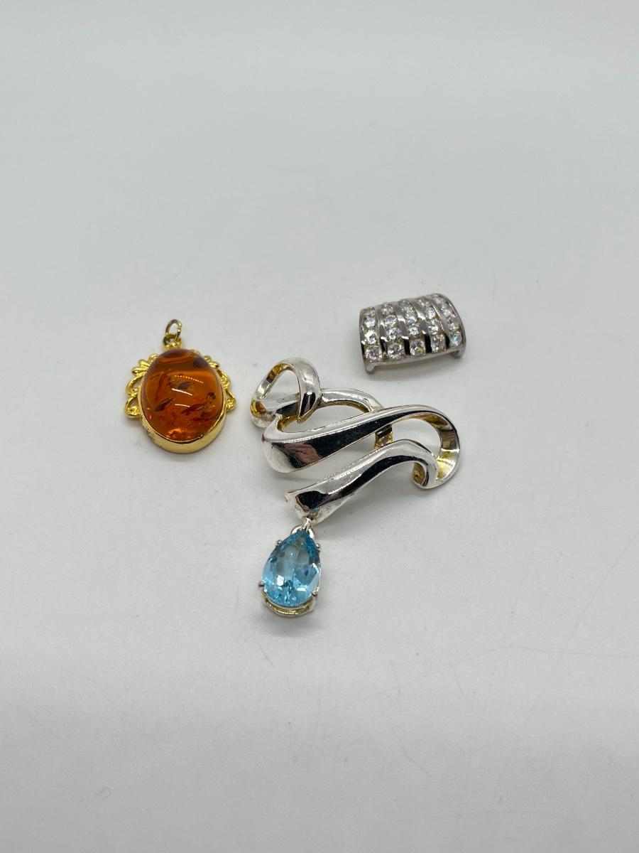LOT 162: Amber 925 Pendant, Sterling Silver and CZ Pendant + Unmarked Faux Topaz Pendant