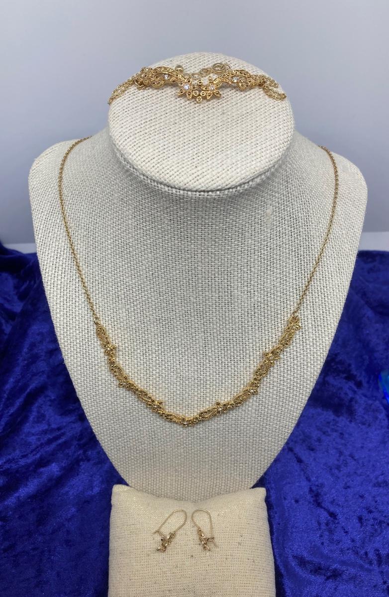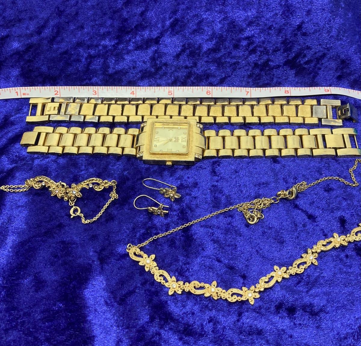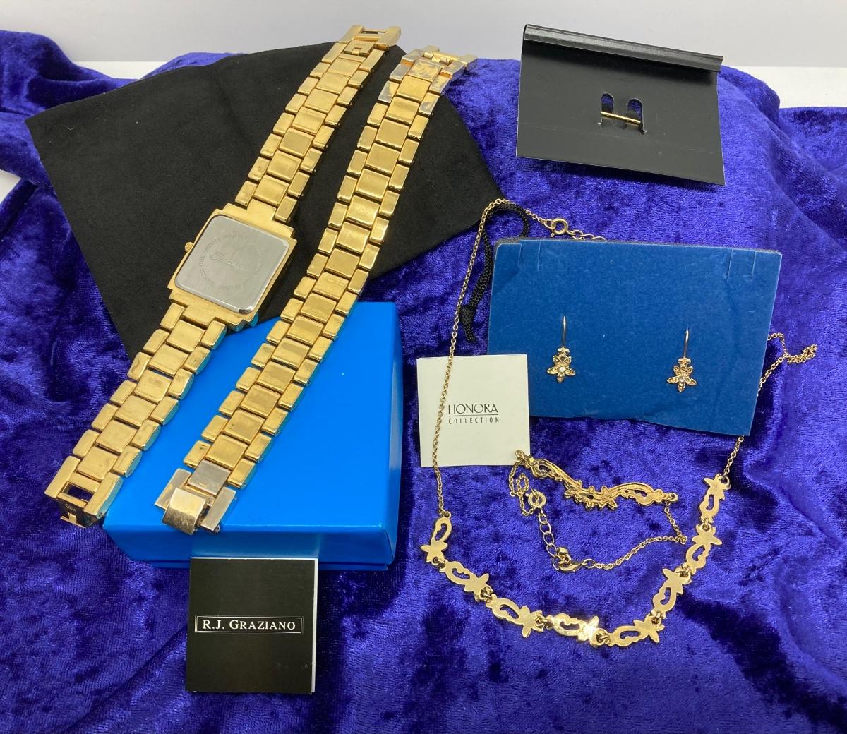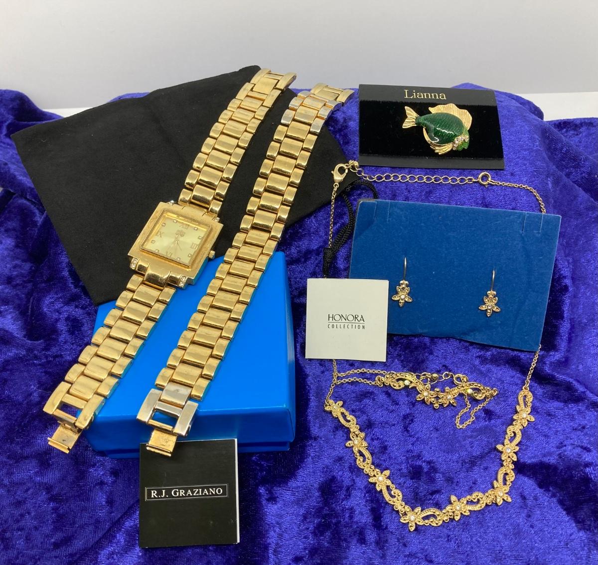 Lot 162: Graziano Curations Watch and Bracelet, Graziano 3 Piece Necklace,Bracelet, Earring Set and Lianna enamel Fish Pin
