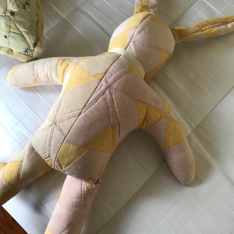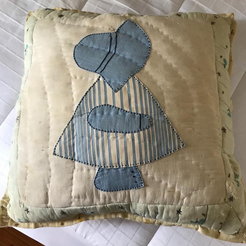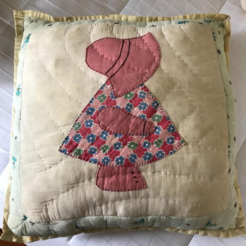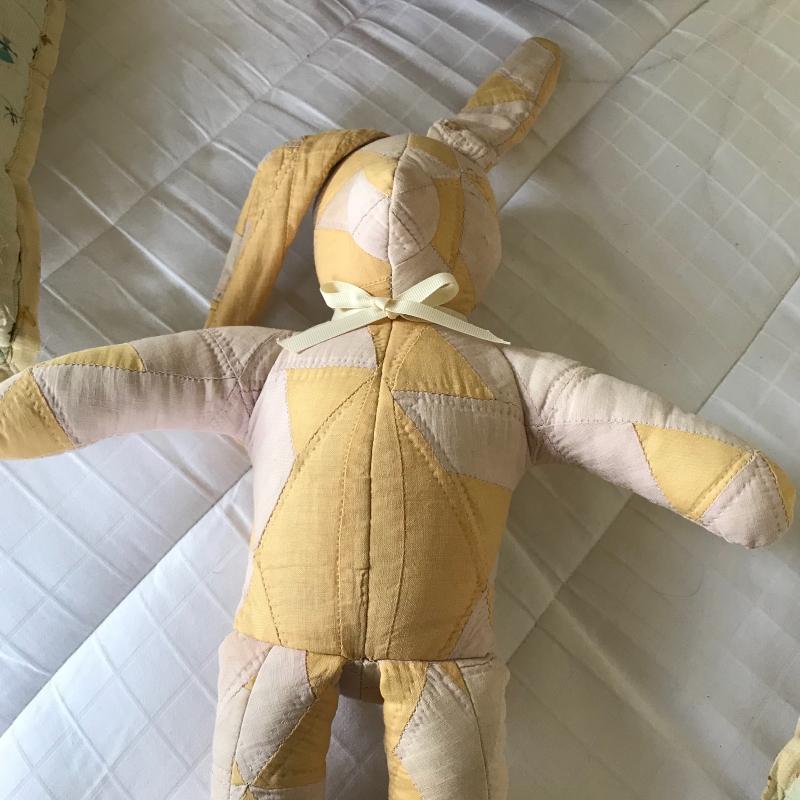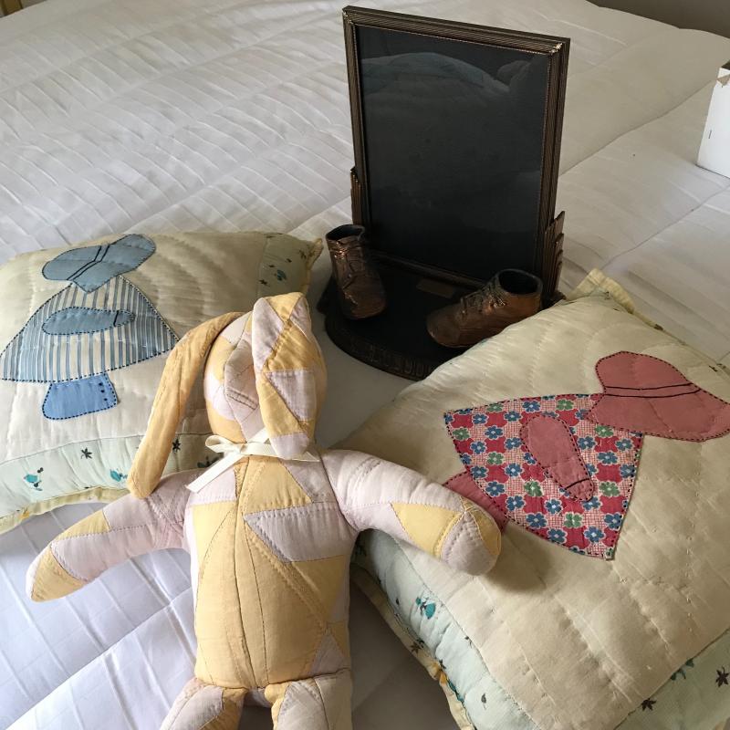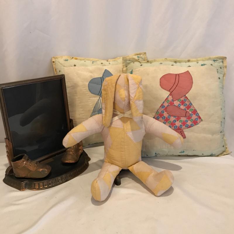 Lot includes an antique picture frame with that reads “Sharon October 14, 1946”. Also includes two hand sewn pillows and a quilted rabbit. Fabric is worn in some places. See pics for details. Shipping available or local pickup in Asheville, NC.