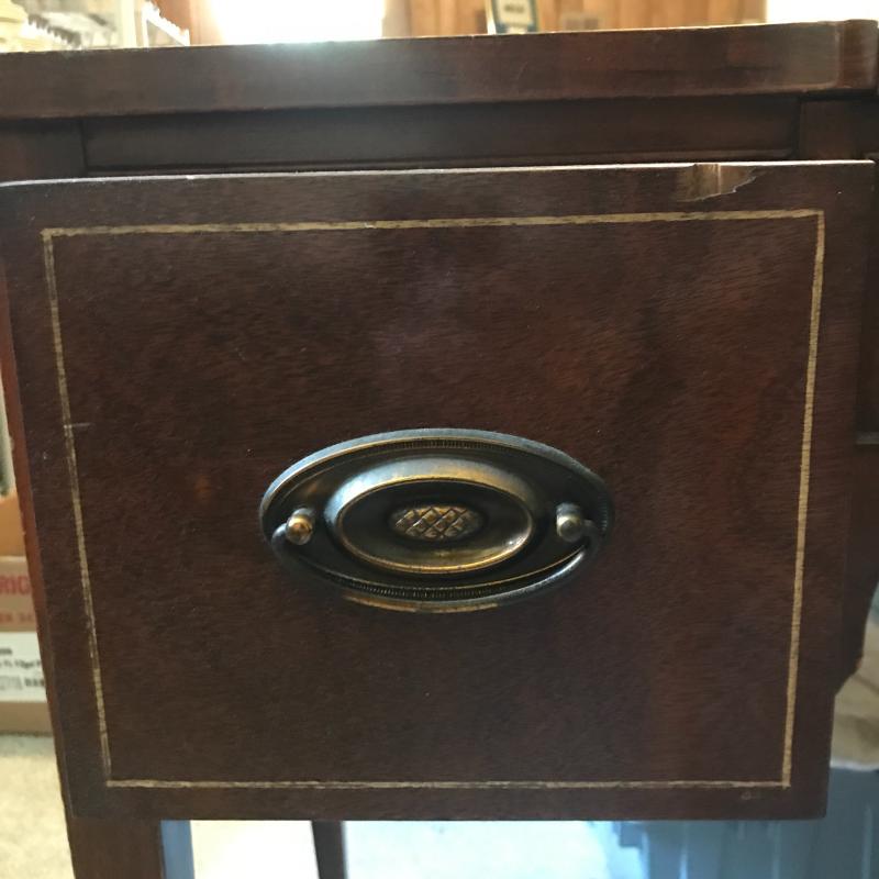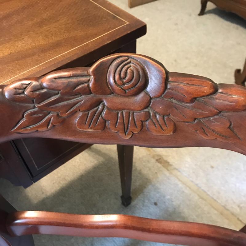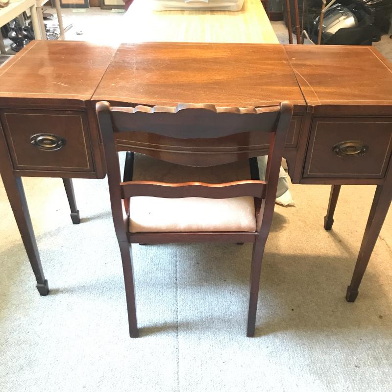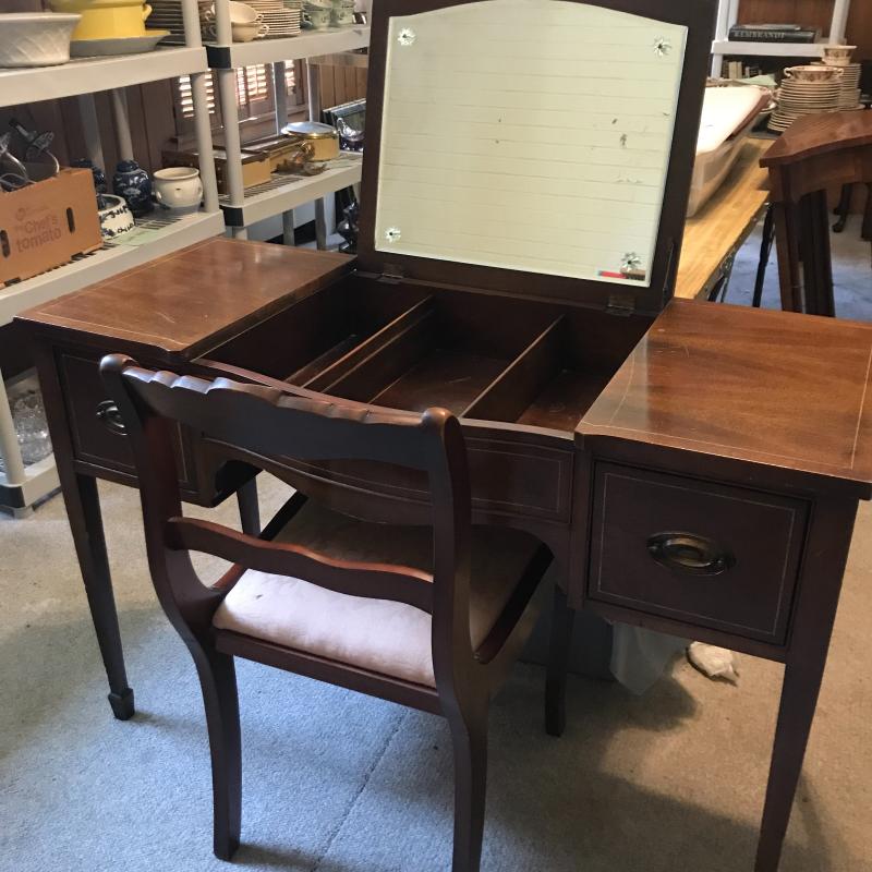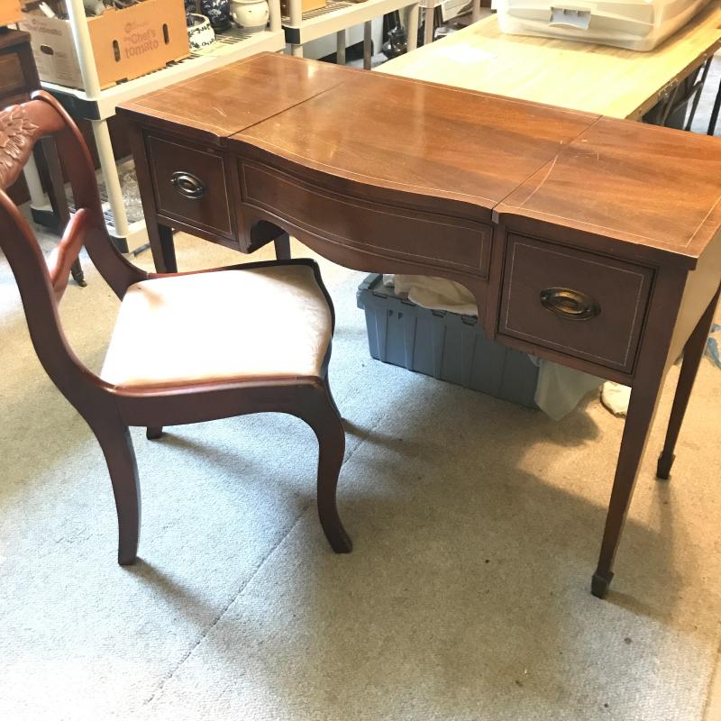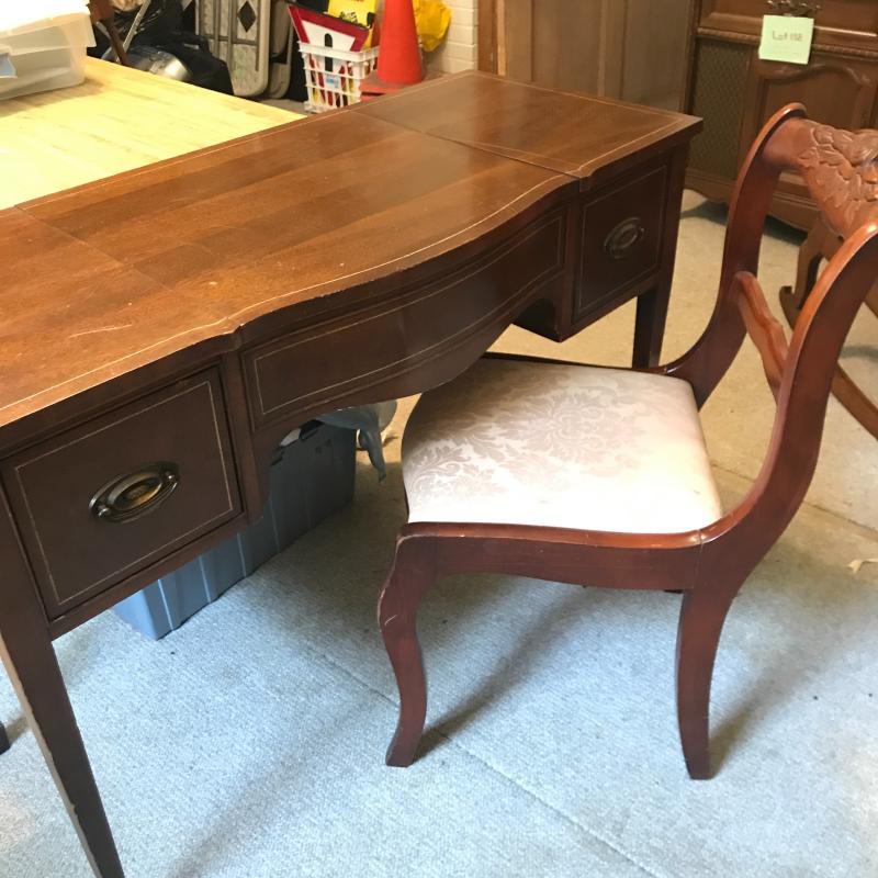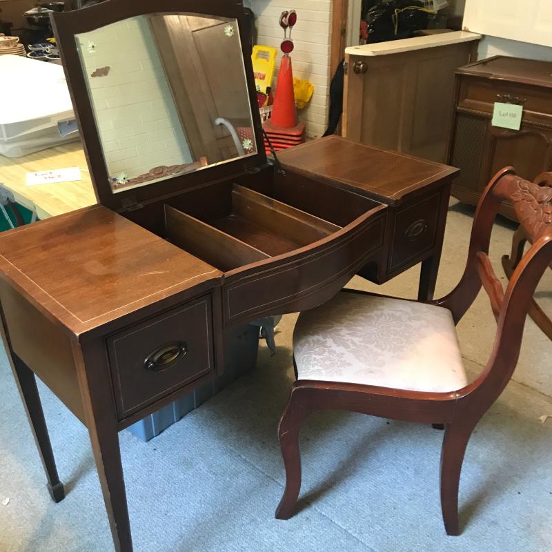 Beautiful antique vanity with top that lifts up to expose mirror and storage. Put down to hide the mess! Two drawers on sides. Some wear on the wood but is sturdy and opens and closes easily. Lot also includes a cute antique chair with carved back and light pink fabric seat. Desk measures 44” x 19” x 29”. No Shipping