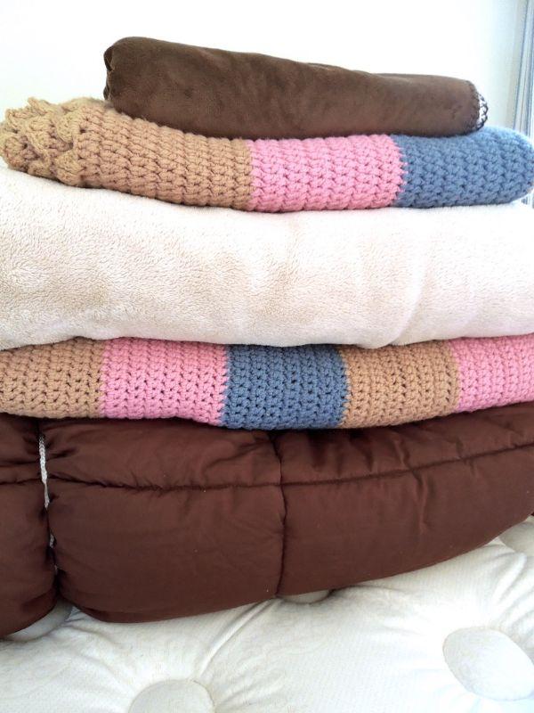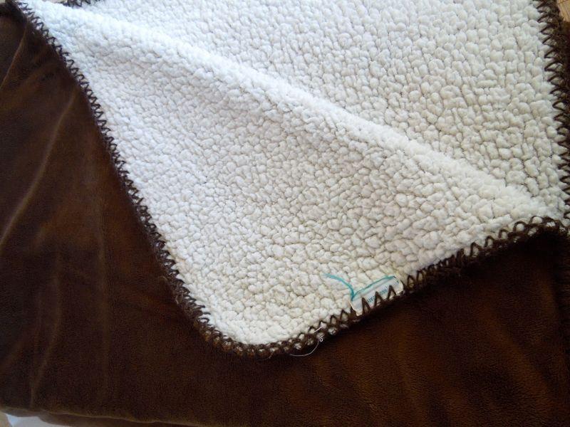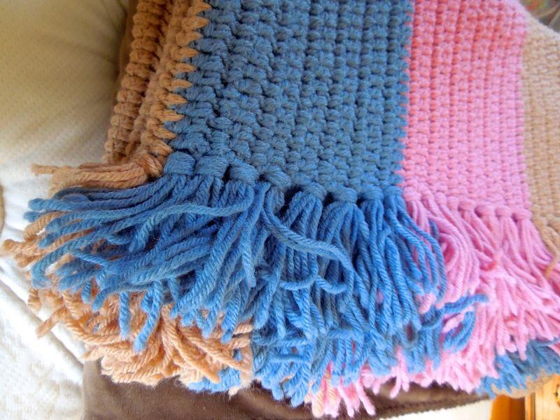 Two tri-colored hand crochet fringed afghans full size; a twin size brown throw; a full size quilted polyester spread; and a beige full/queen fleece blanket.