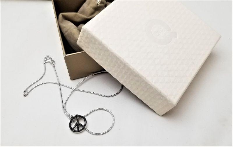 Bronze Milor - Small 60's peace sign studded with tiny black diamonds on a "liquid" silvertone 17" chain.