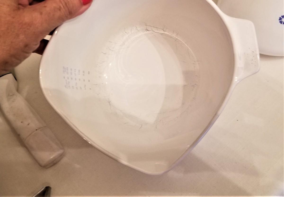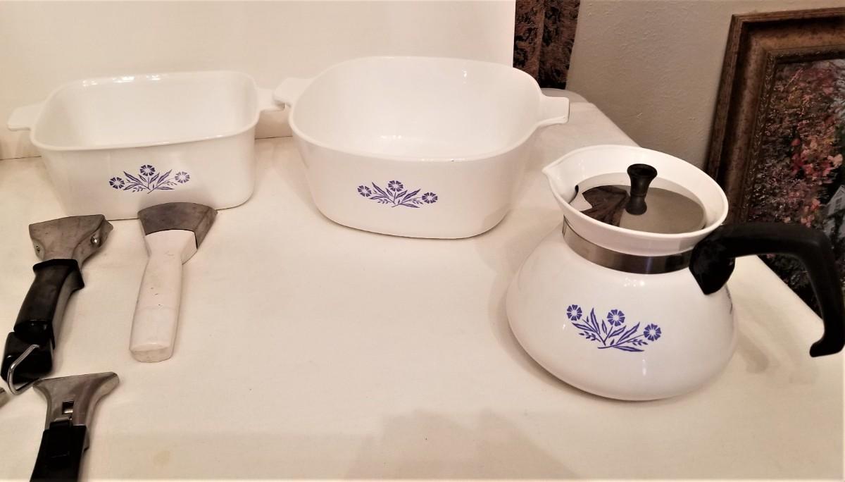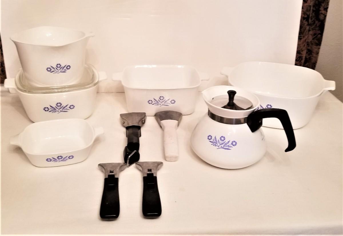 Nice lot of vintage Cornflower Corning Ware with some handles - you get all you see here: 6 pieces - 2.5 quart casserole with no lid, 1.5 quart casserole with no lid, Petite Pan, Sauce maker (hard to find - note some scratching to the interior), 1 3/4 quart casserole WITH lid, 6 cup coffee pot - you also get four handles. All in good usable condition.