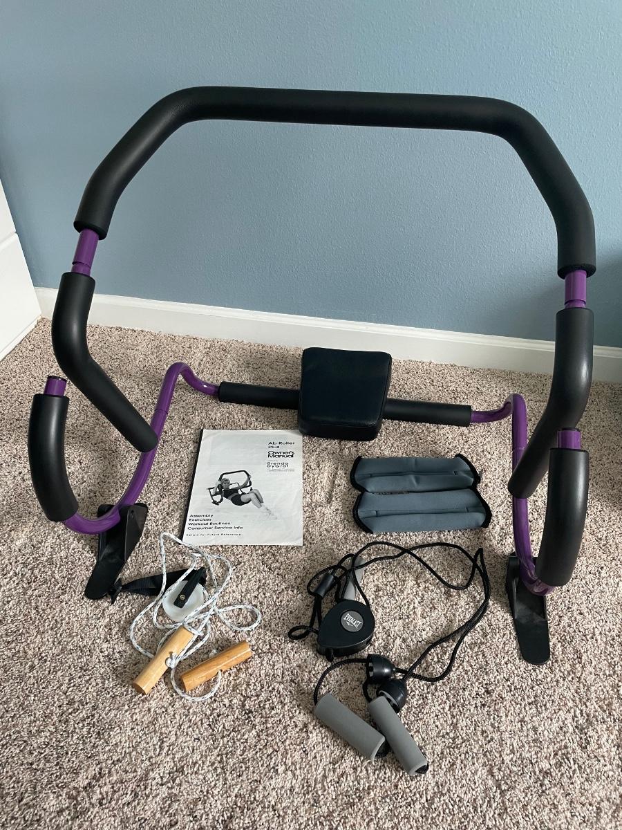 Ab Roller Plus, ankle weights, pulley exercise piece and a jump rope