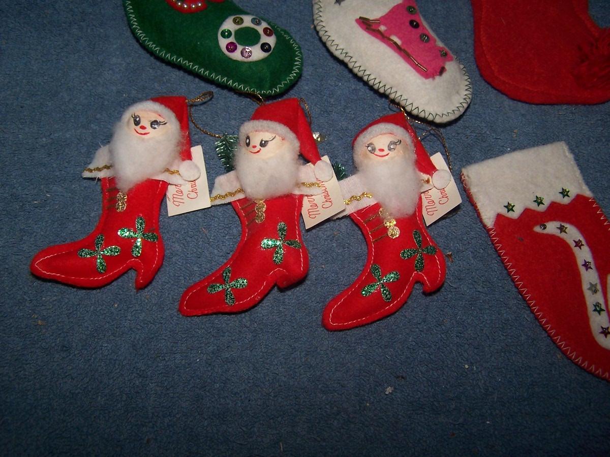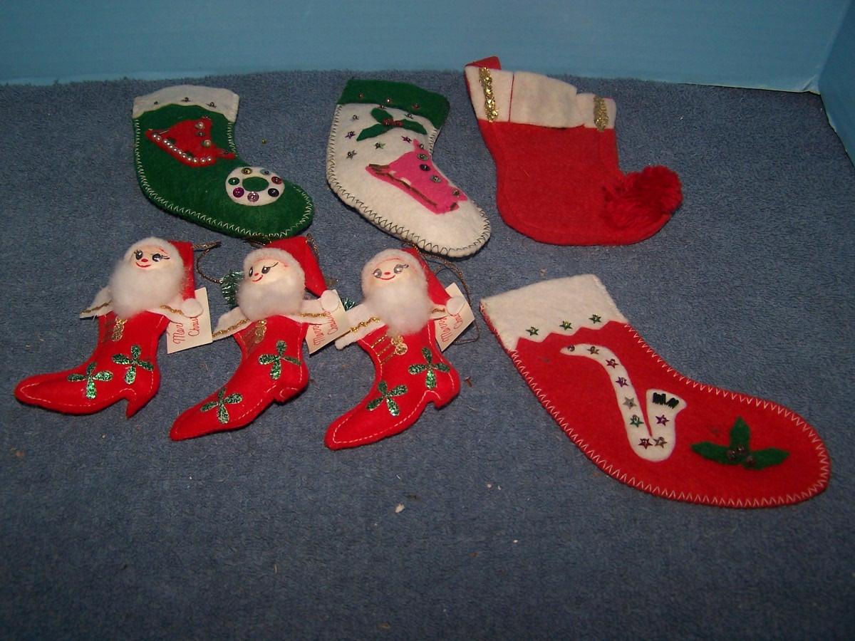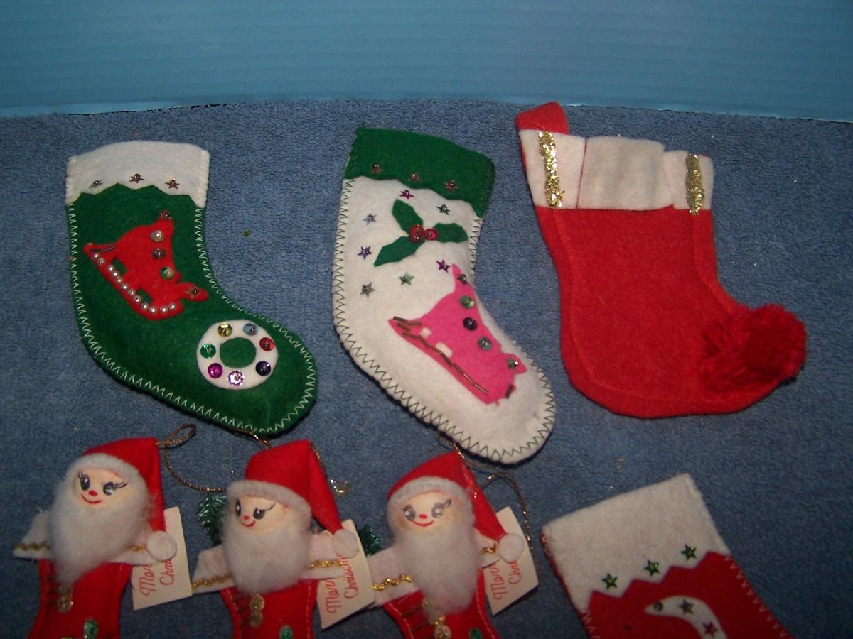 THESE ARE WONDERFUL VINTAGE MCM CHRISTMAS DECORATIONS-MINI FELT STOCKINGS!!! UNMARKED.. LARGEST-5''.. LIGHT WEAR..