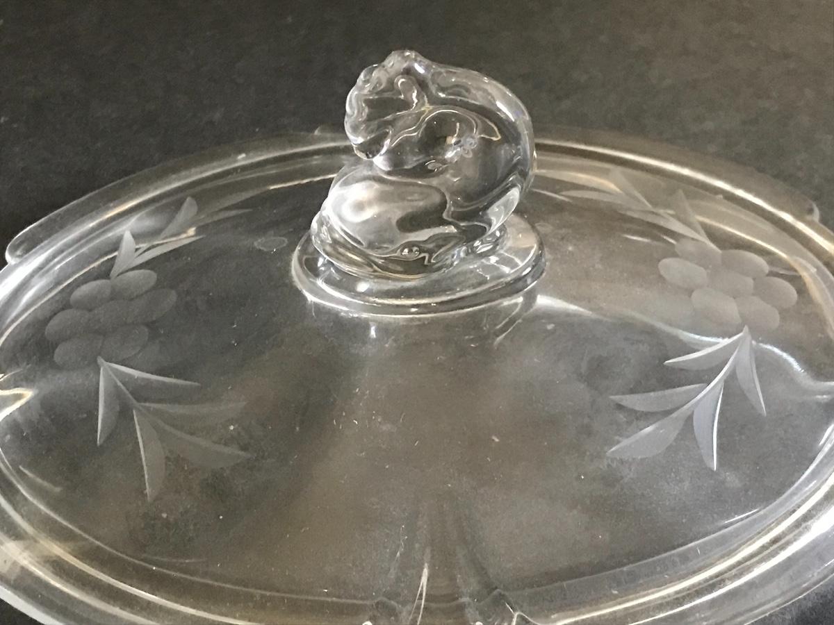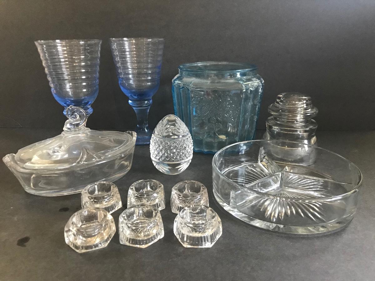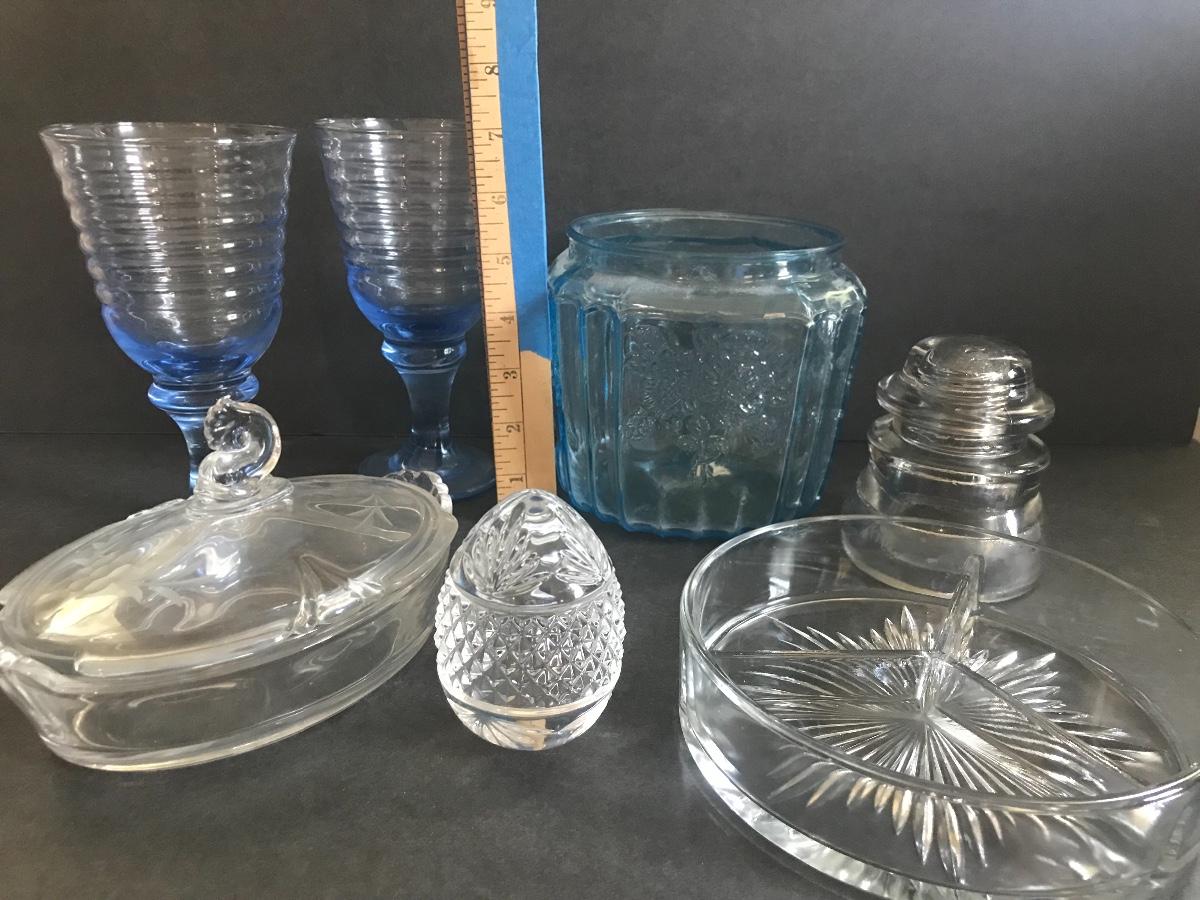 Salts, divided candy dish, cookie jar, blue stemware, crystal egg from France, a covered candy dish by Heisey and more. Please see all pictures as they are the best representation of the items. The pictures show condition, measurements if taken, and what is included in the lot. Due to the large amount that we photograph and the time frame, we are not always able to take measurements. All items unless noted, are pre-owned and have been used. If you purchased furniture, you must bring help. We do not allow one person to carry large furniture out on their own. Bring help, tools and a truck for the safety of our client’s homes, and your personal safety. Company policy. Thank you.