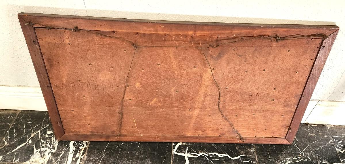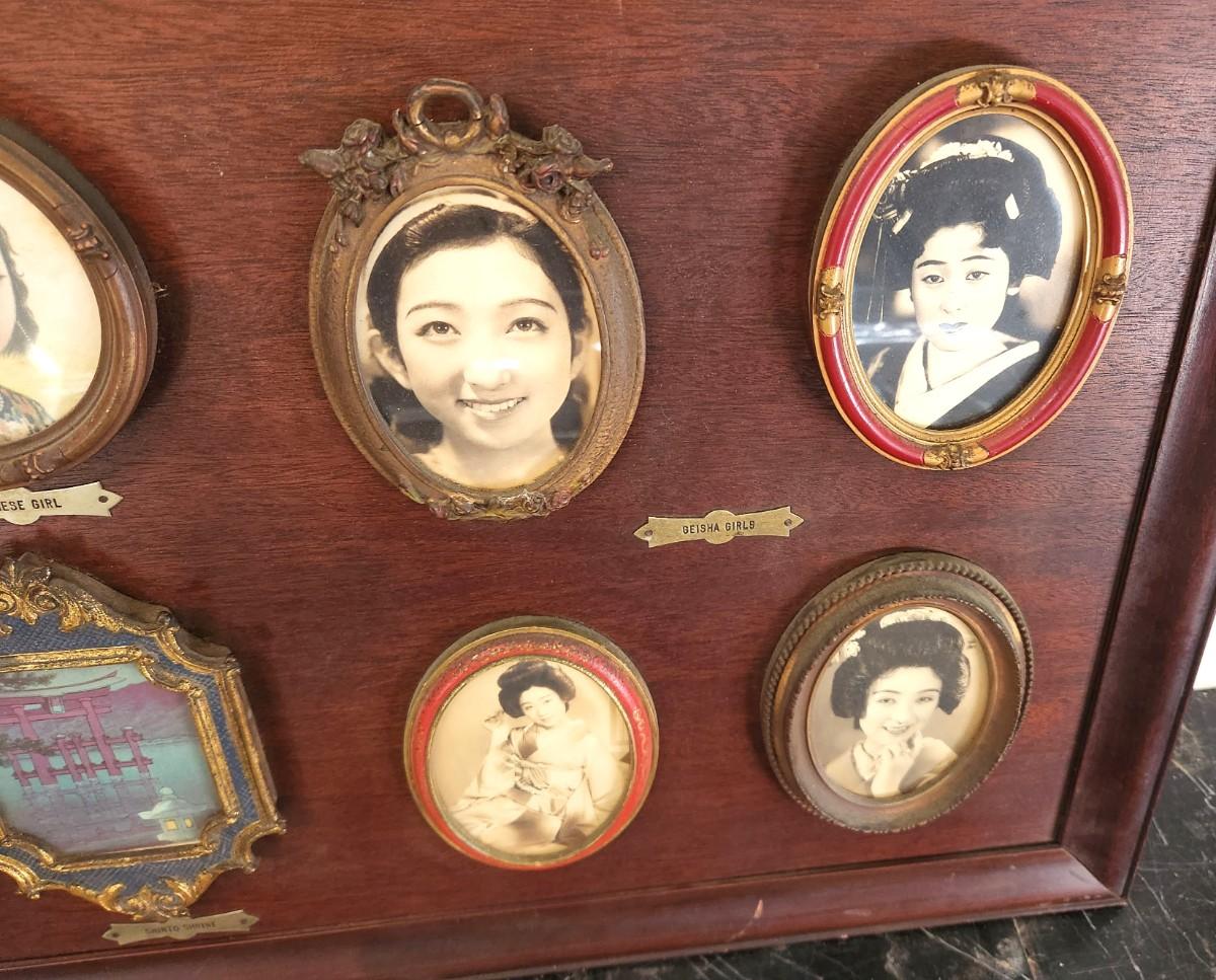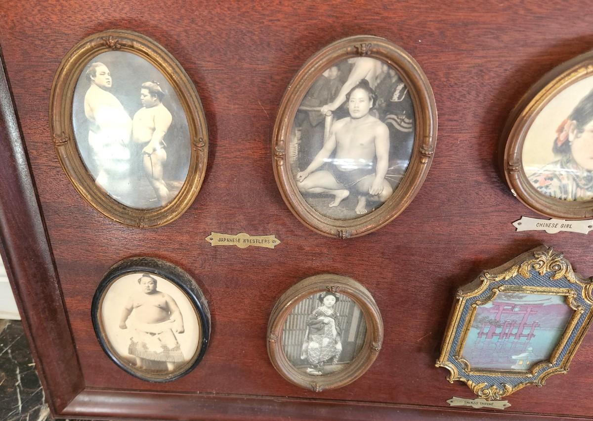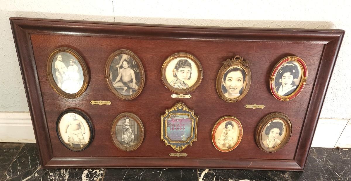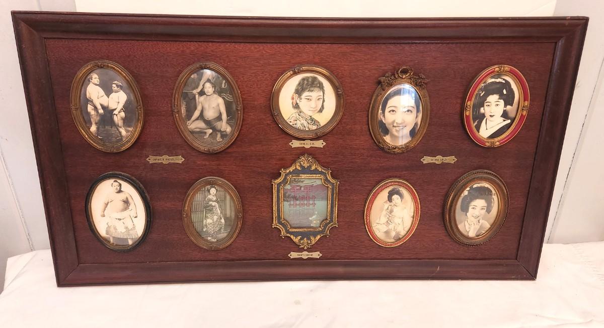 This piece has some age to it - very interesting collection of 10 pictures depicting Geisha Girls, Sumo Wrestlers, Shinto Shrine, etc. I think this is WWII era - likely something a service man brought back. 34.5" across, 18" tall. Good vintage condition.