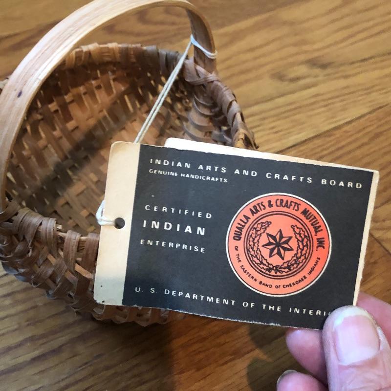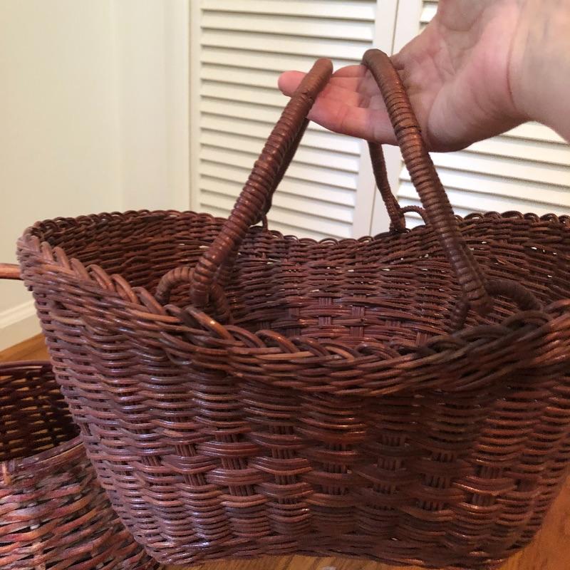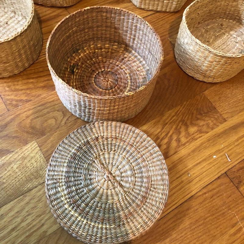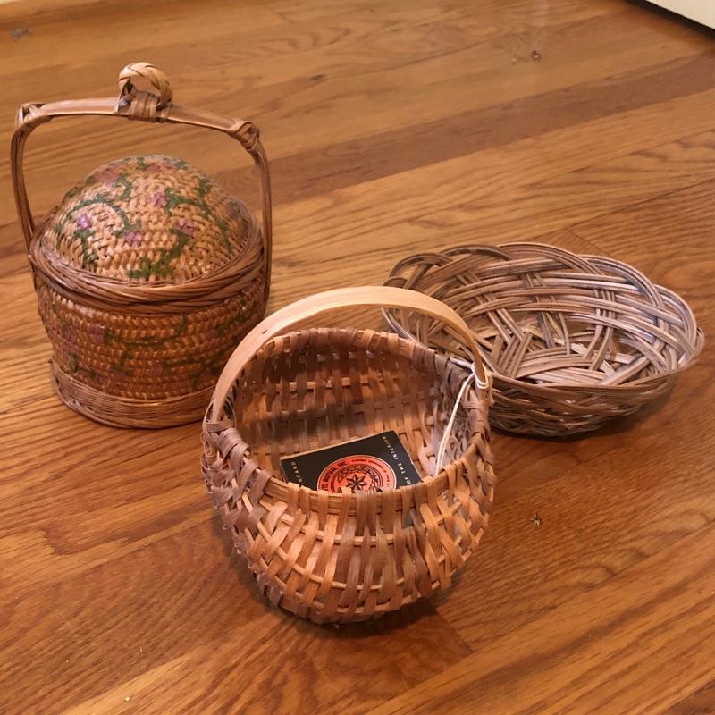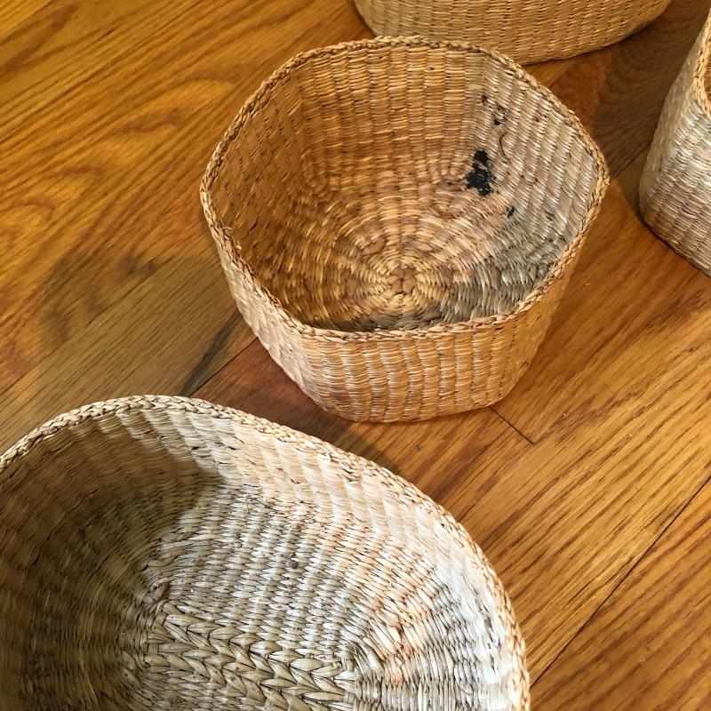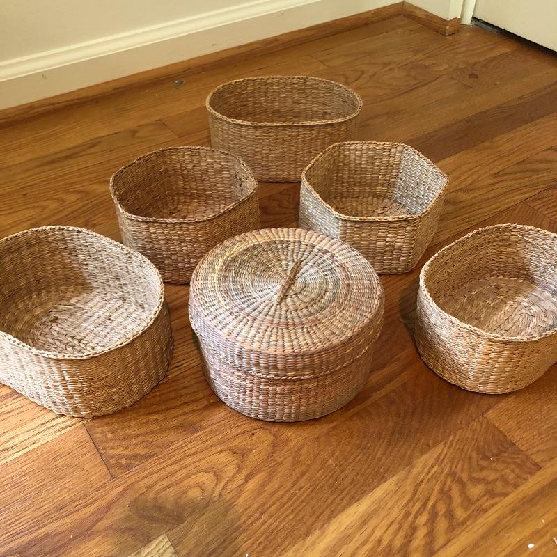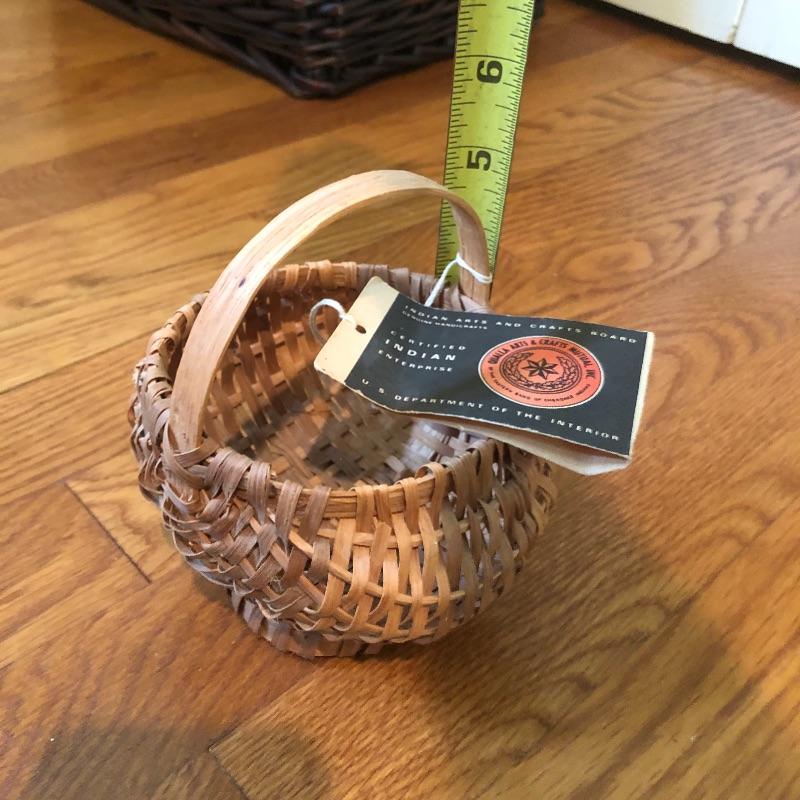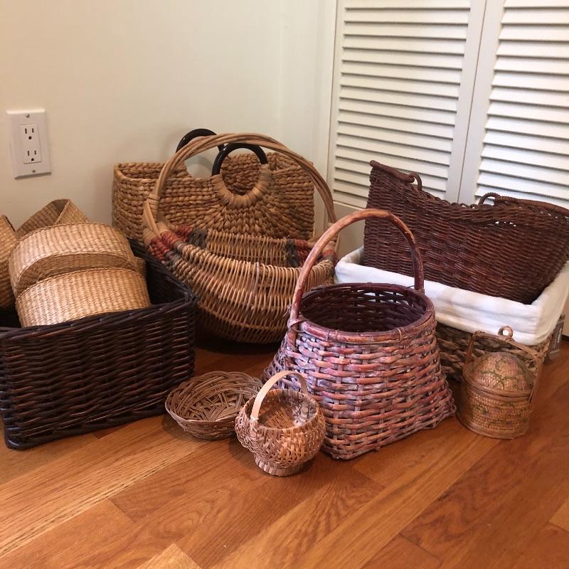 From small to large, baskets of all shapes and sizes in this lot that also includes a basket weaved tote bag that measures 16” x 6” x 12”. Last basket pictured is a certified Indian Enterprise handcrafted piece.