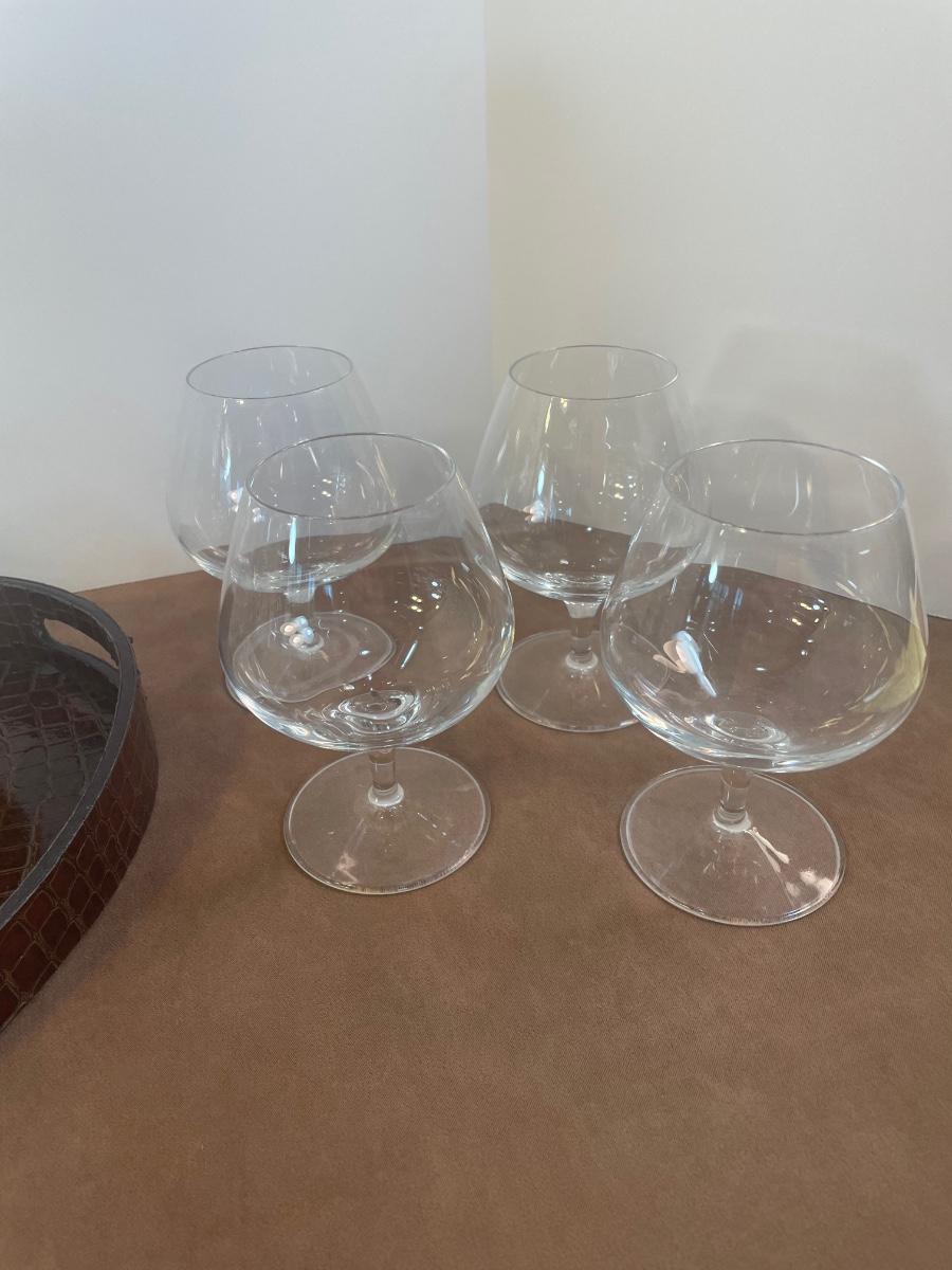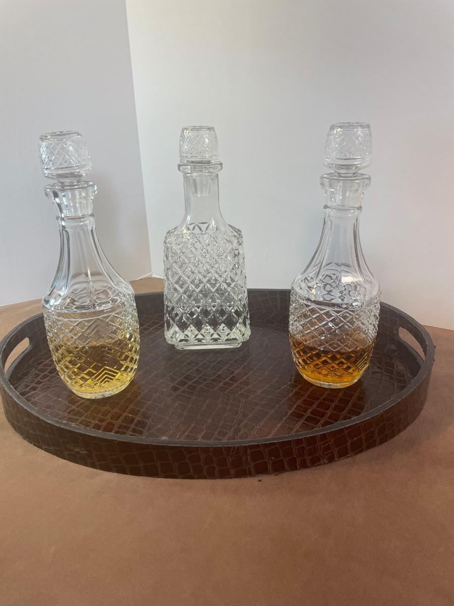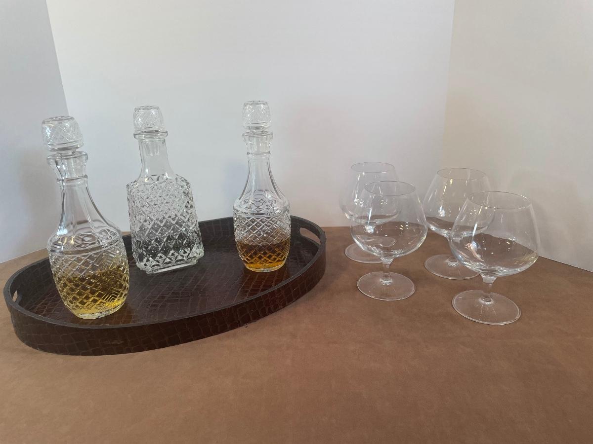 Three pressed glass decanters, faux croc oval tray and 4 brandy snifter glasses