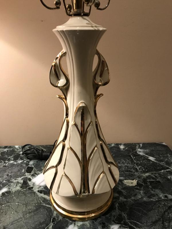 Great MCM 1950's cream ceramic lamp with gold accents featuring prominent cala lilly leaves and flowers. Accented with brass curls at top of ceramic center. No shade. 8" D x 20 1/2" to socket.