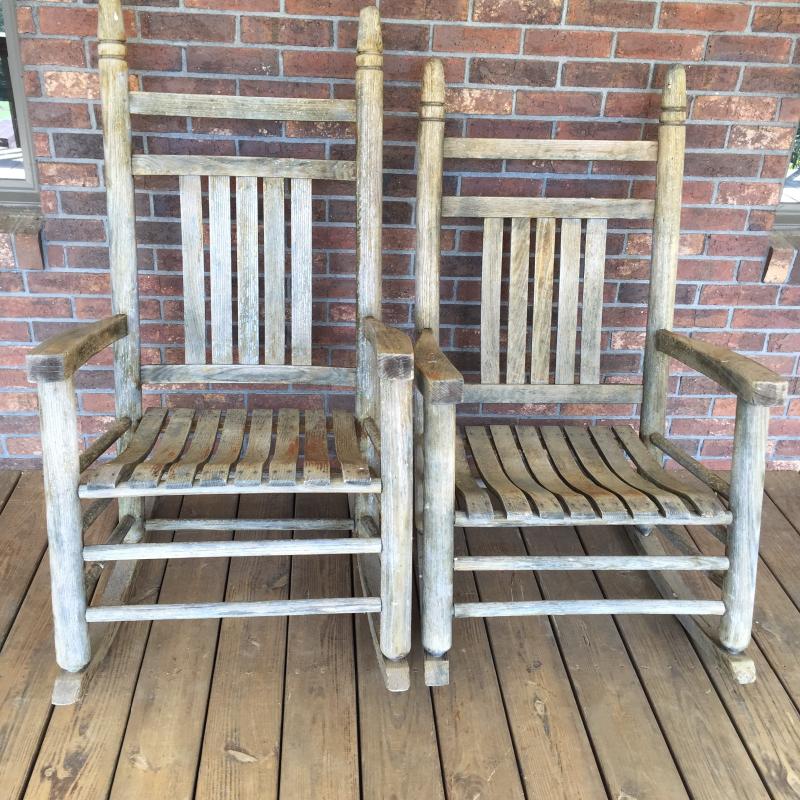 Graceful pair of Rockers. Enjoy the view from these Rockers. Rockers are Weathered but still very solid. Largest Rocker Measures 35” x 26” x 47.5”.