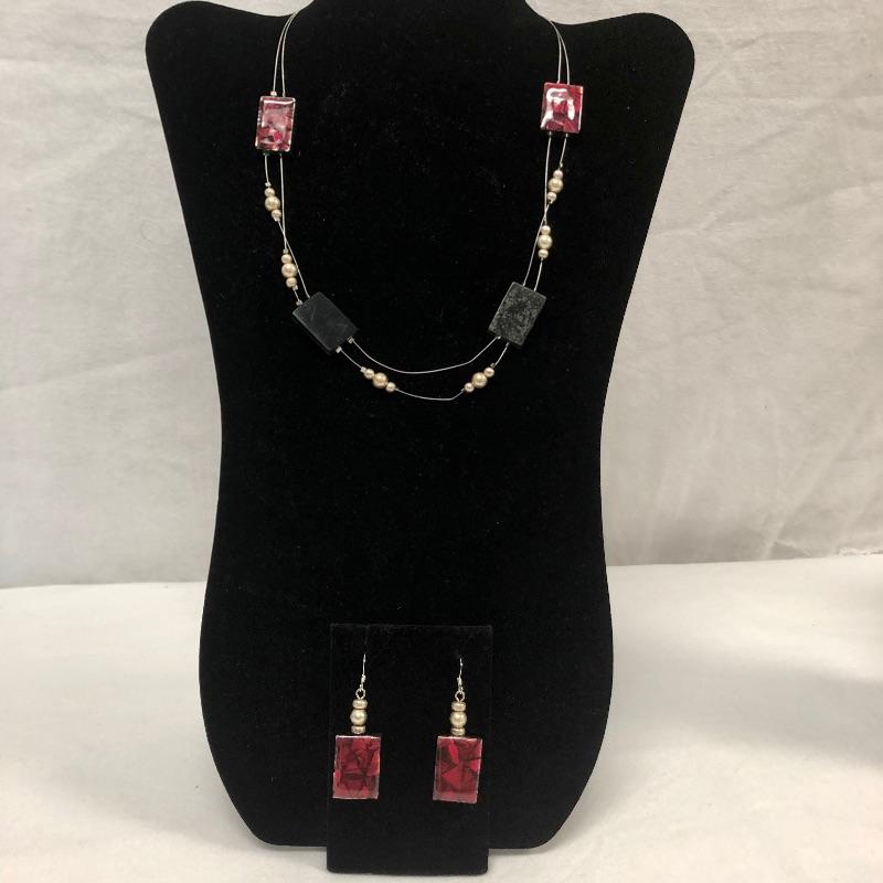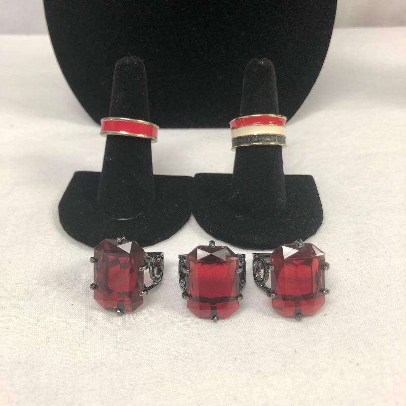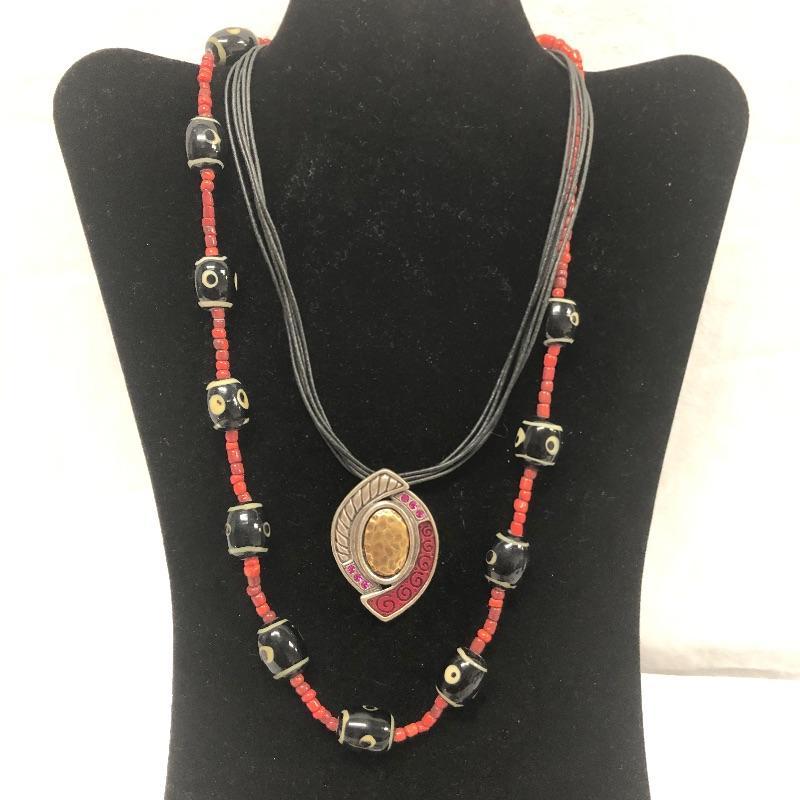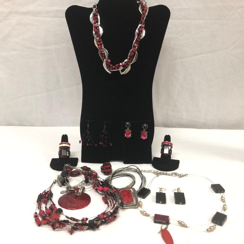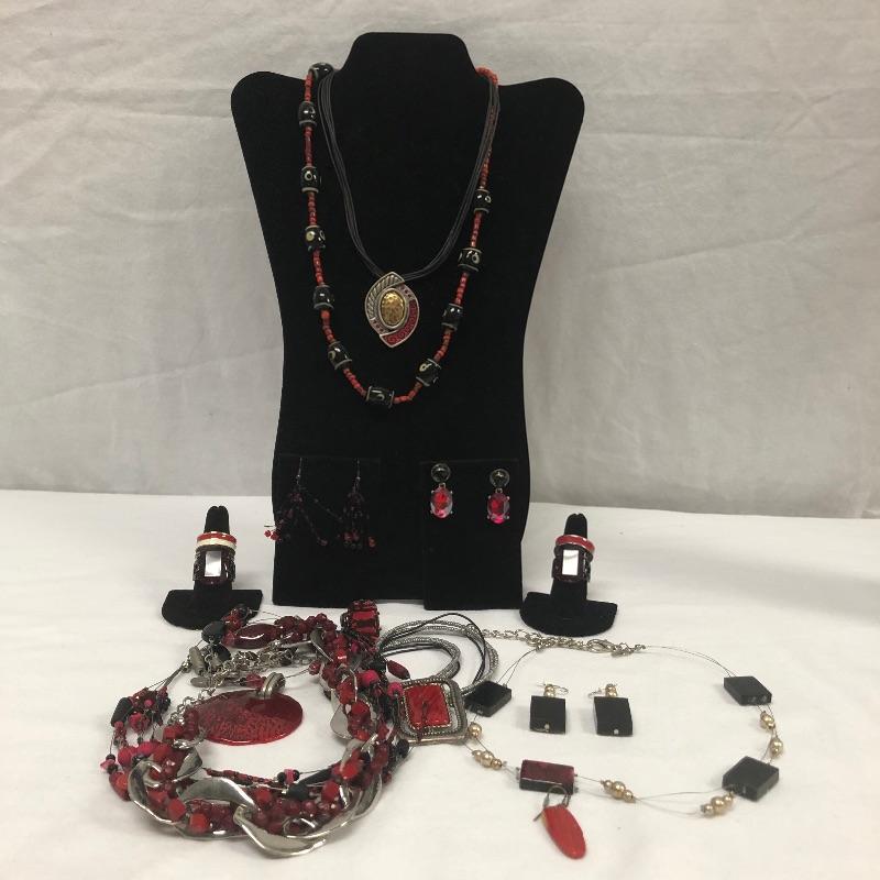 Large assortment of predominantly red and black pieces that includes some matching necklace and earring sets including a Chico necklace and lots more, see images.