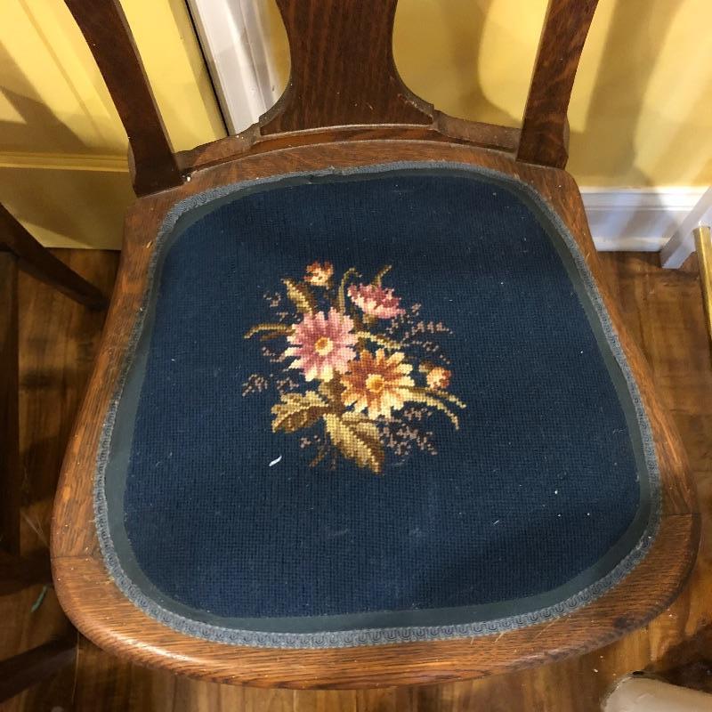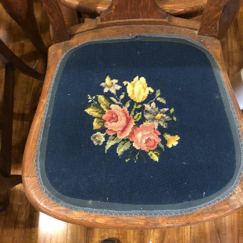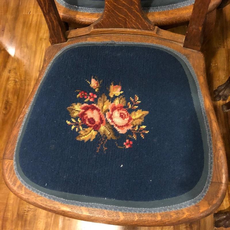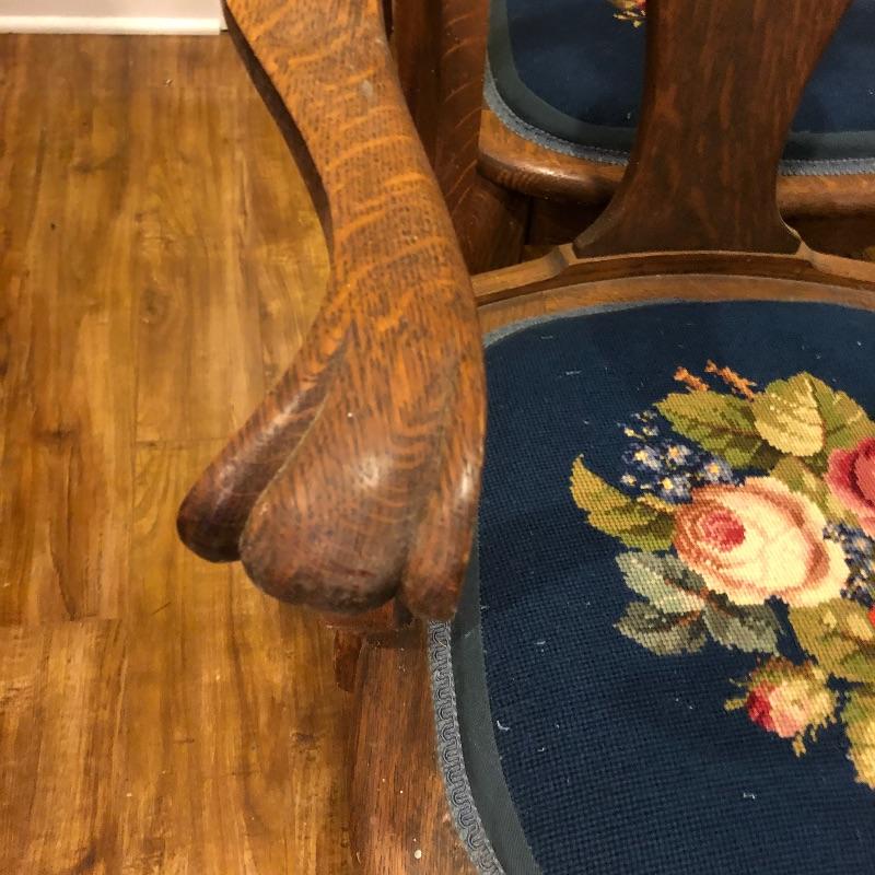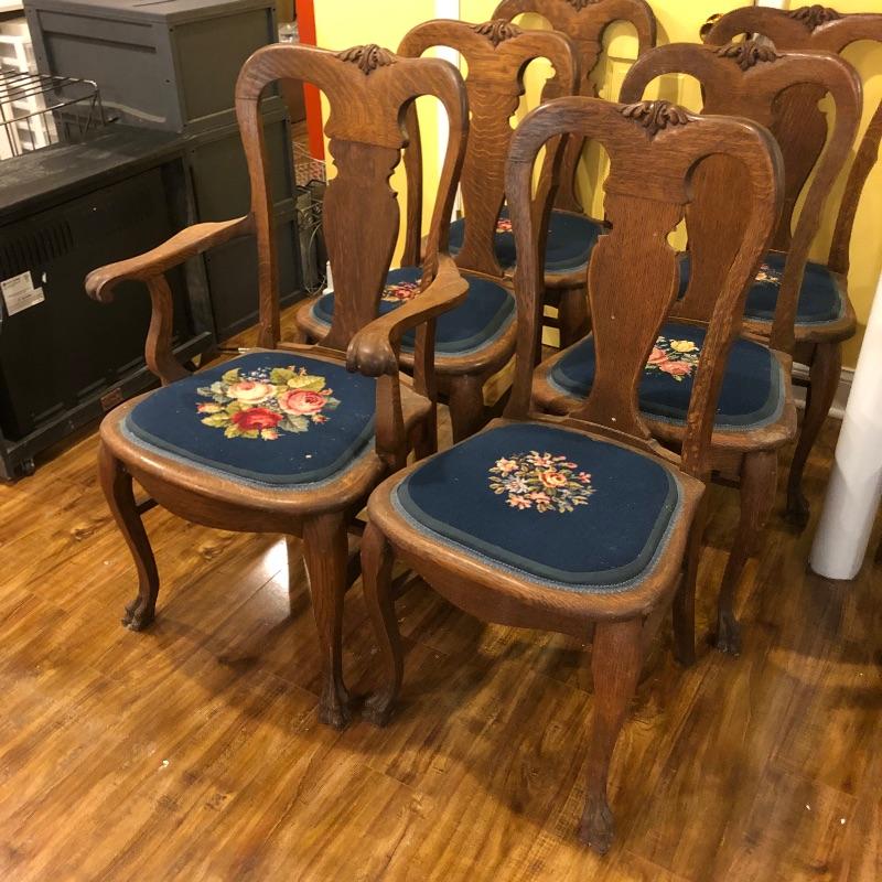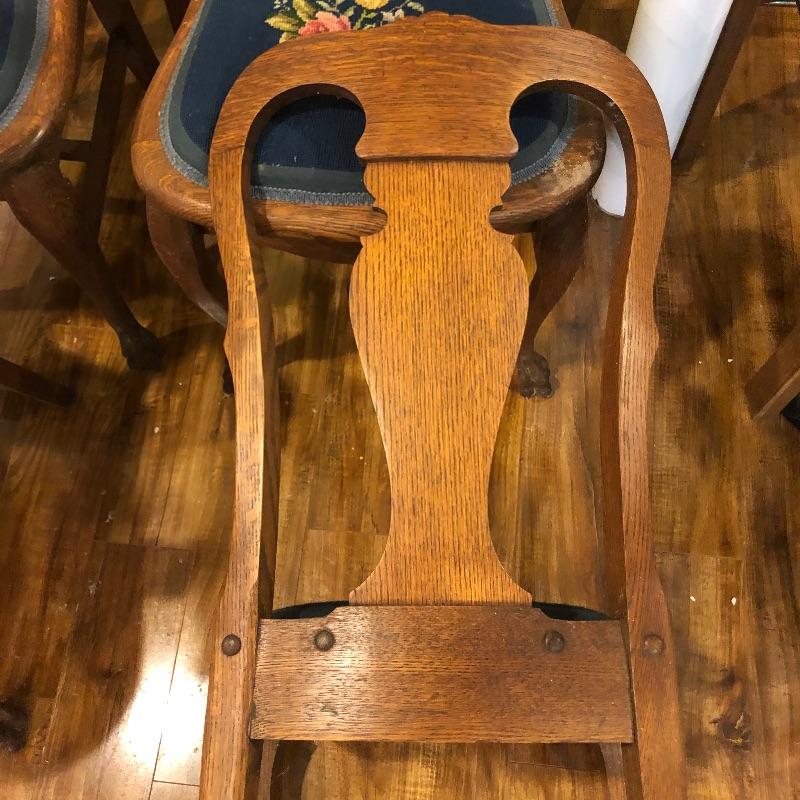These six antique dining chairs have padded tapestry seats; with the exception of two that have the same floral design, the rest all have a different one. The padding makes them extremely comfortable. They appear to be oak and go very well with the dining table in lot 159. There is one arm chair out of the six and this chair has one small hole in the seat that is shown in images. This is the largest chair and measures 17” deep x 24” wide x 40” tall.