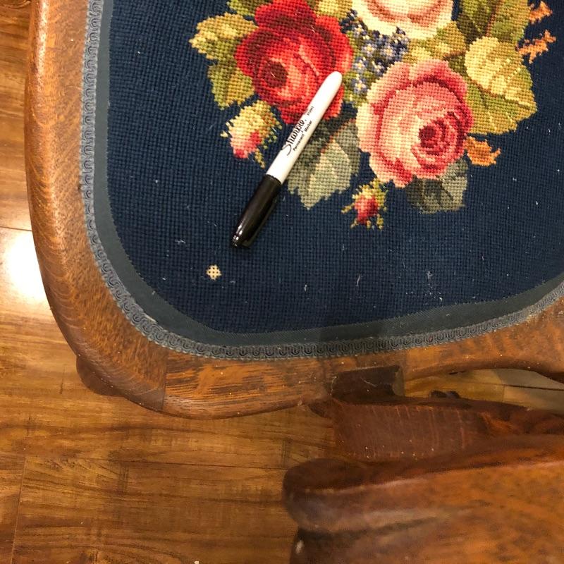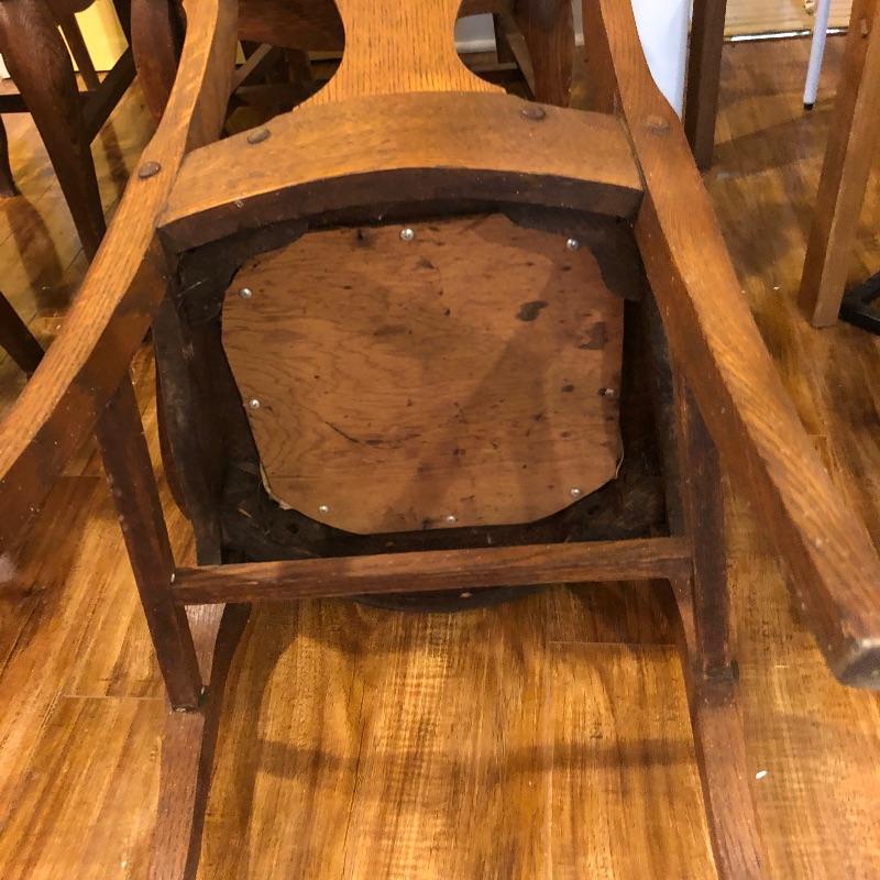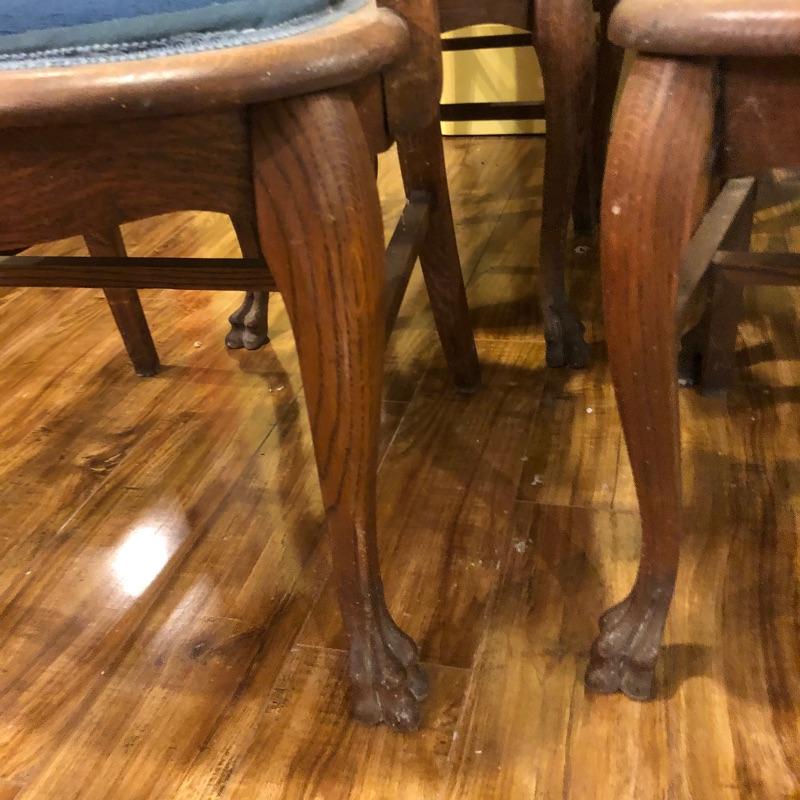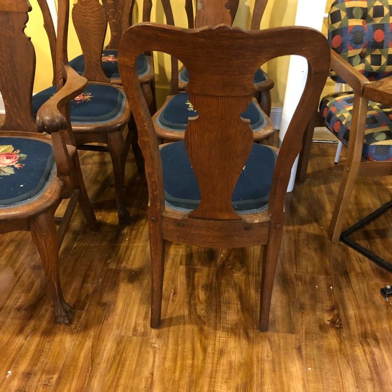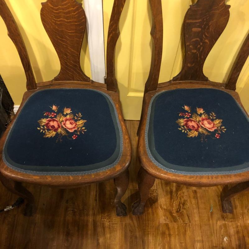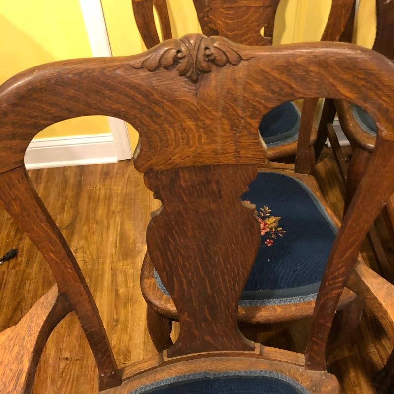 These six antique dining chairs have padded tapestry seats; with the exception of two that have the same floral design, the rest all have a different one. The padding makes them extremely comfortable. They appear to be oak and go very well with the dining table in lot 159. There is one arm chair out of the six and this chair has one small hole in the seat that is shown in images. This is the largest chair and measures 17” deep x 24” wide x 40” tall.