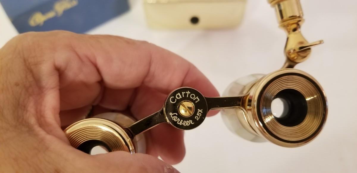 These are absolutely stunning - vintage, yet in brand new, unused condition. 25x magnification. Glasses are 3.75" across, lorgnette is 4.5" tall. One of the nicest things in the sale. Comes with original box and case.