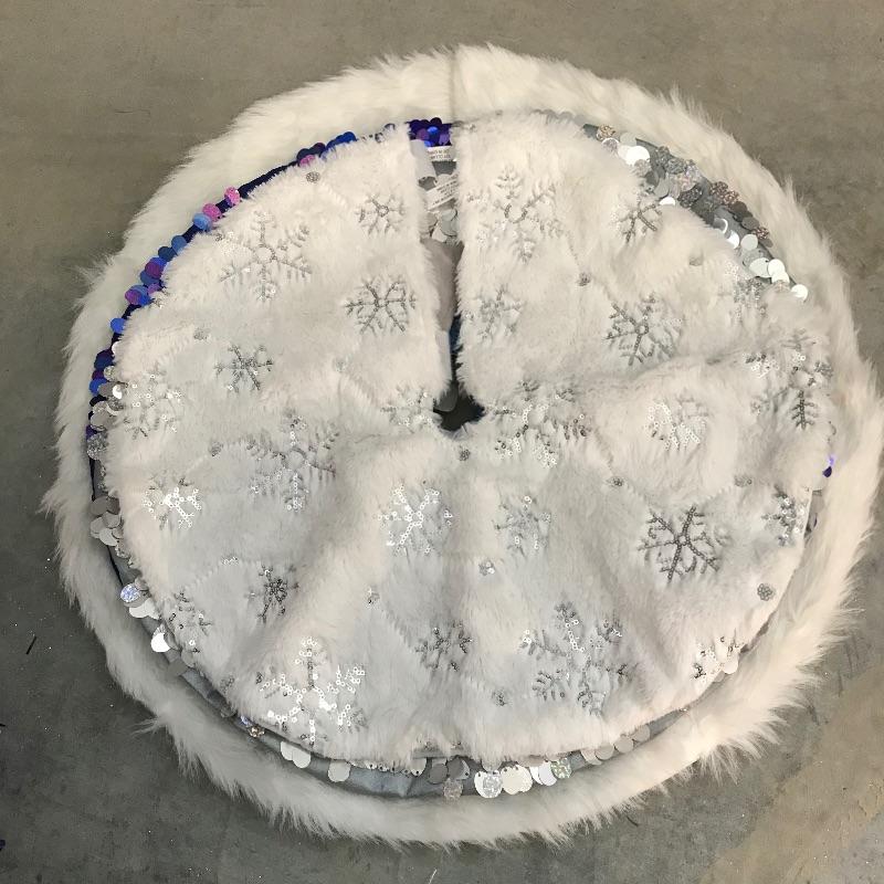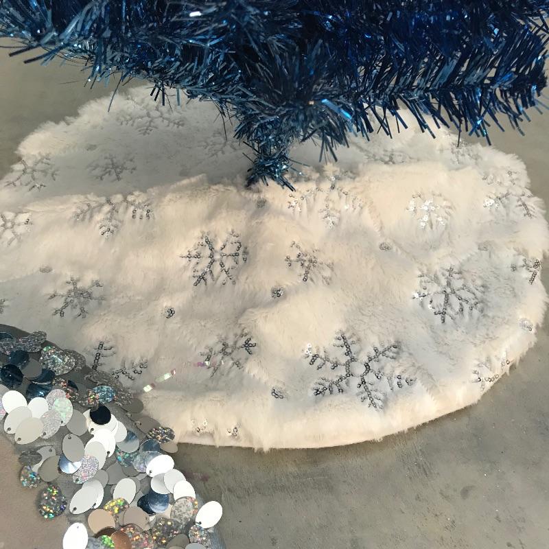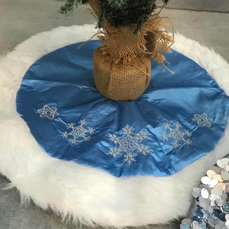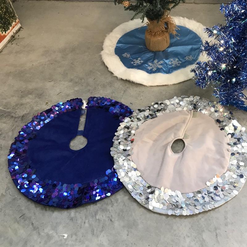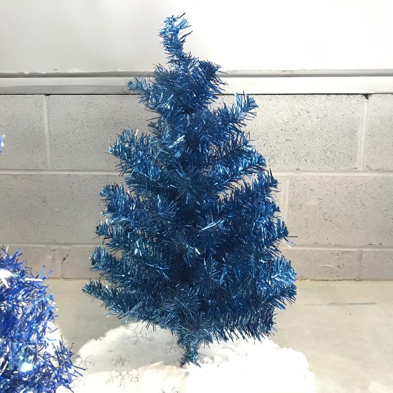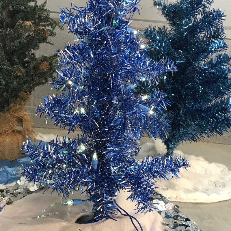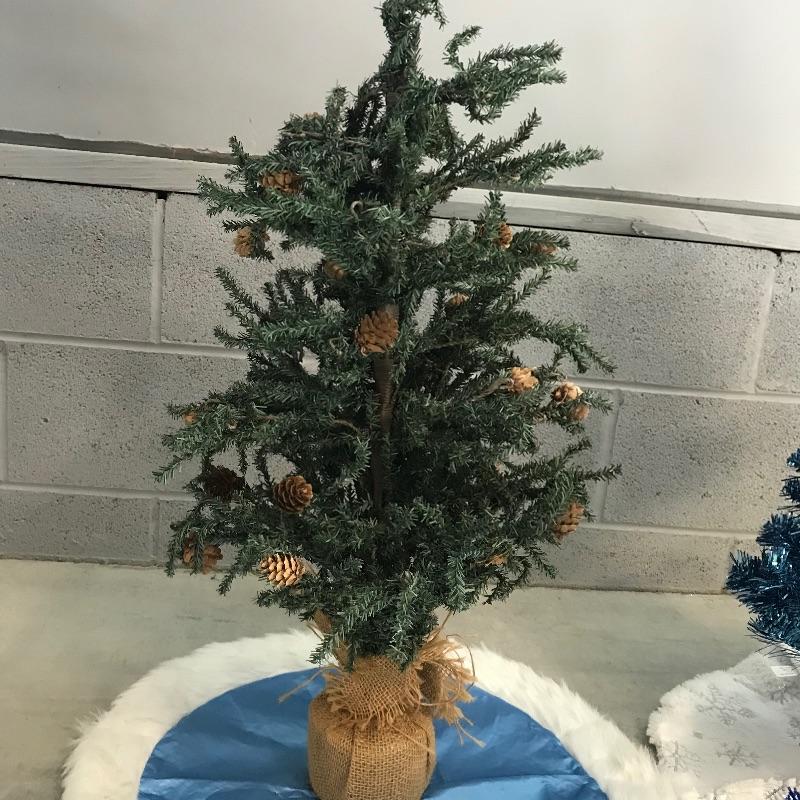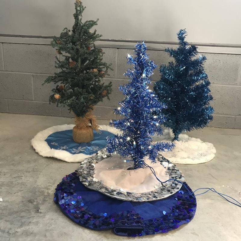 Three happy little trees here for festive fun. One icy blue tree with attached lights, one full blue and one traditional fir with tiny pine cones. This fir is the tallest at 30” and has a burlap style sack. Four teeny tree skirts included, all close in size with the biggest at 22”. See photos. No shipping.