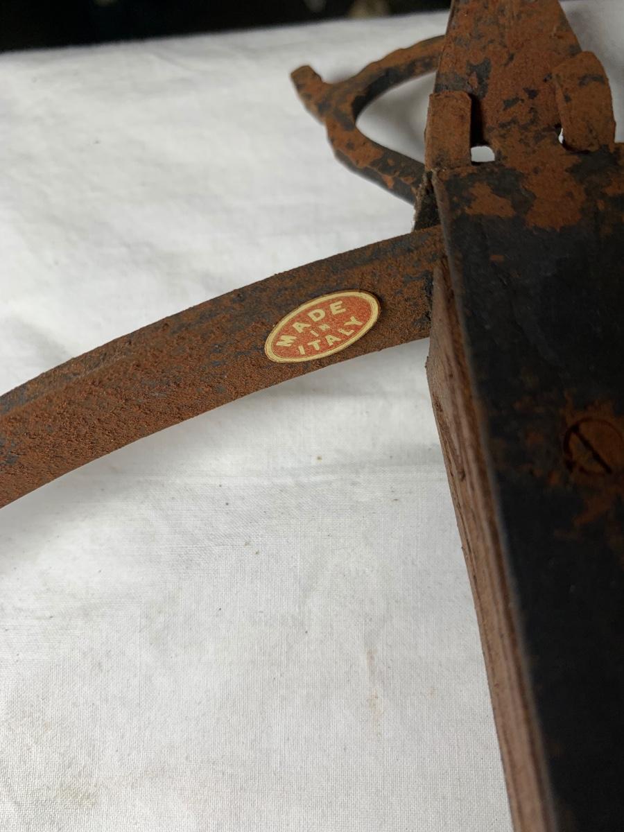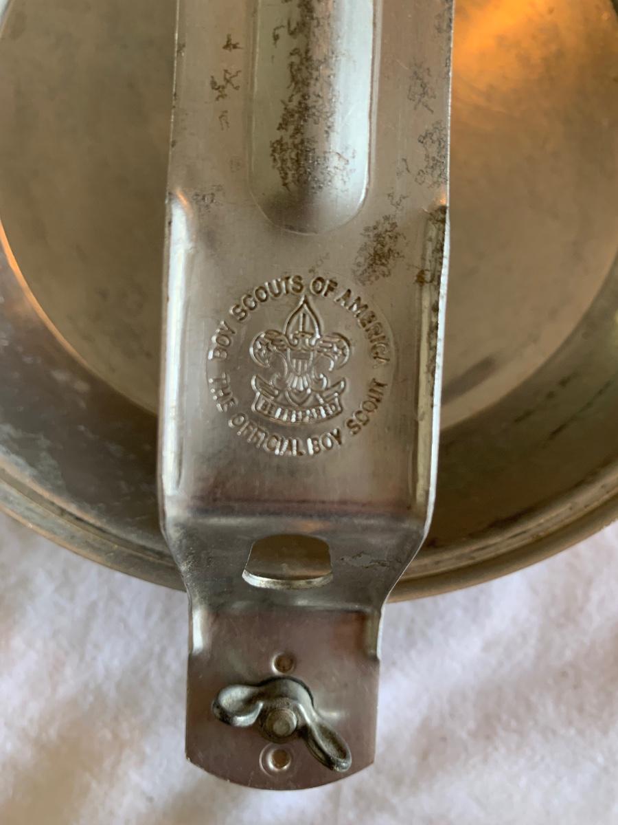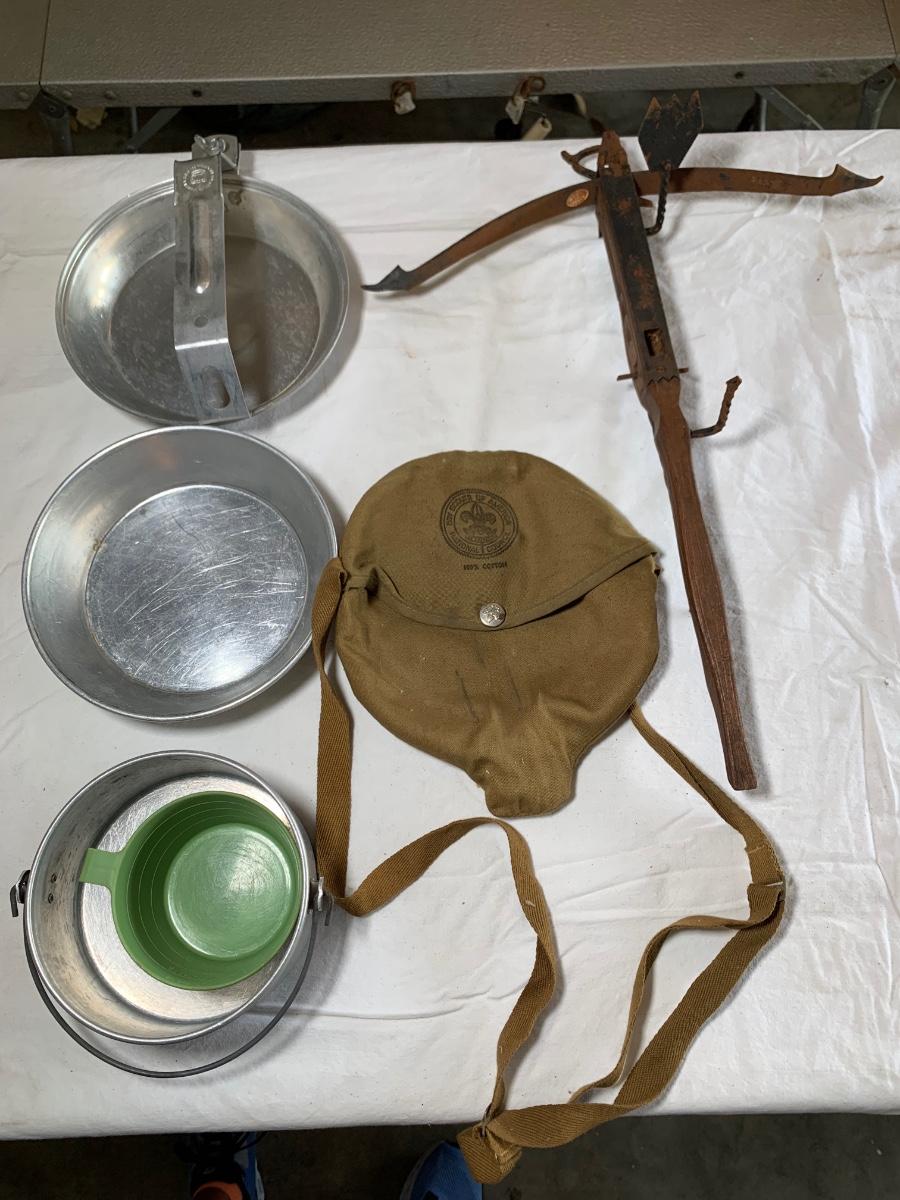 Boy Scouts of America camping dish set with bowl, pan and cup. And an antique miniature wood crossbow, made in Italy