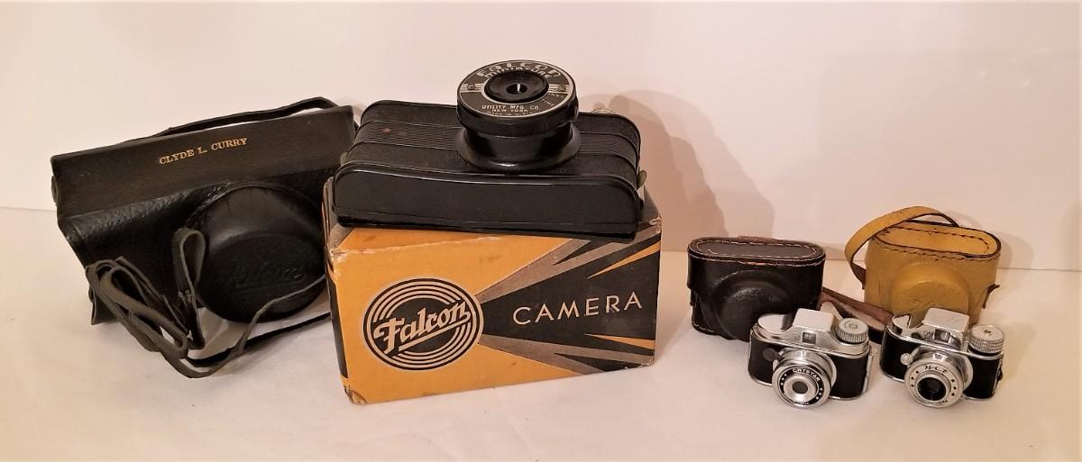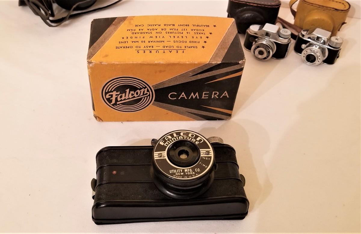 Vintage Falcon camera in original box - has instructions. Also 2 miniature cameras - HIT Camera and one marked Crystar - both with cases. These are being sold purely as decorative or collector's items. We have no way of knowing if they work, or if you can get film for them.
