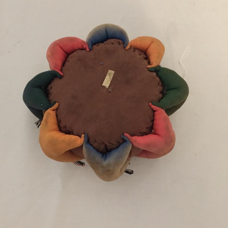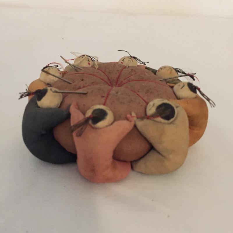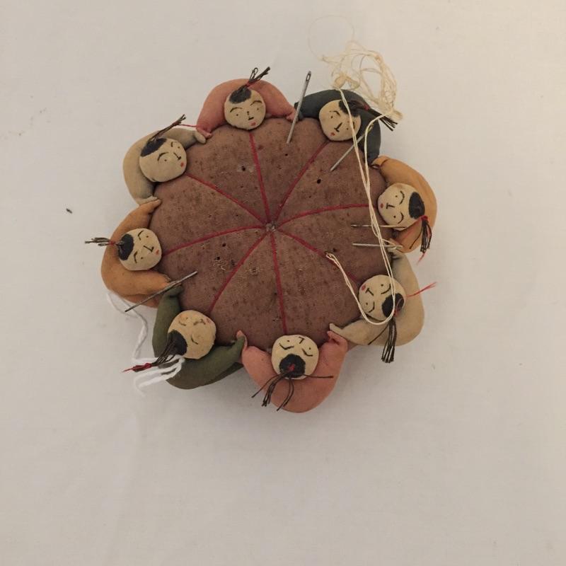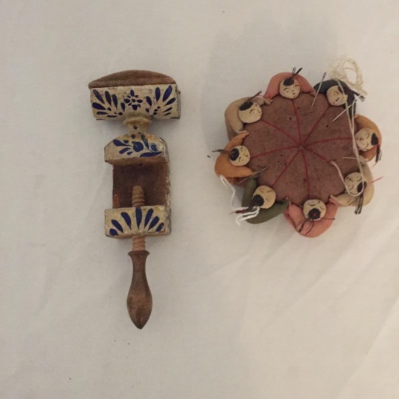 Delightful pair of vintage pin cushions. One sits on table and one clamps on table. Great for your sewing room or to put on display. Round pin cushion measures 4.25” D.
