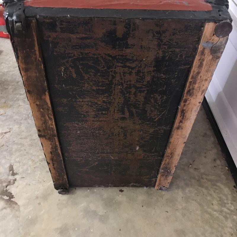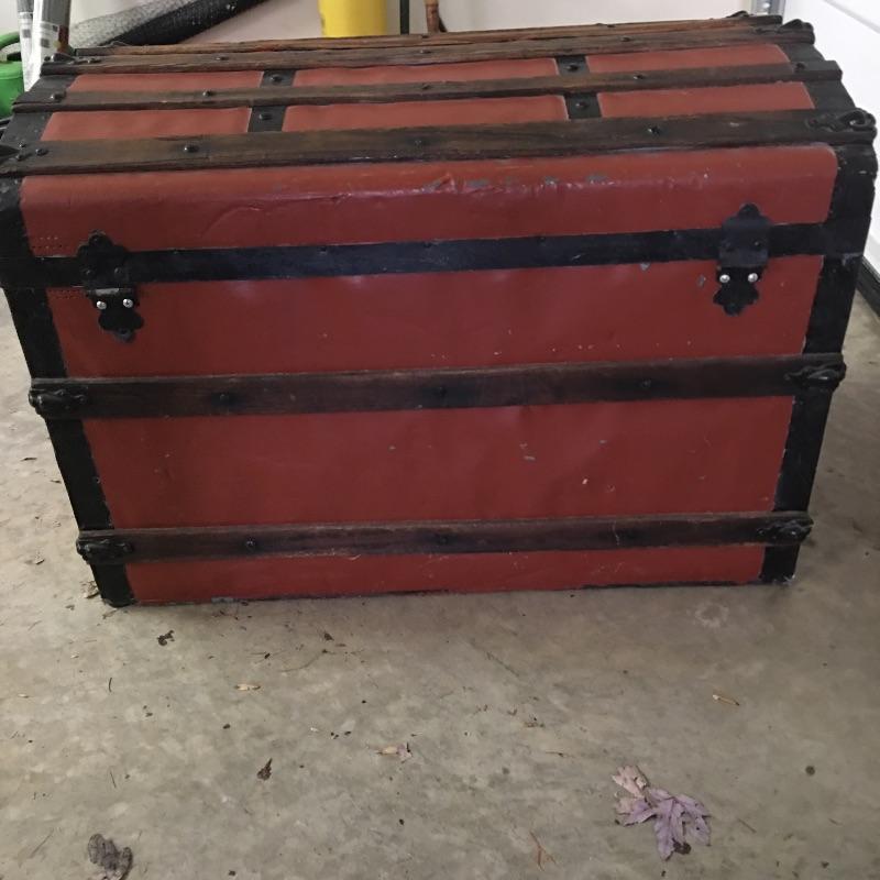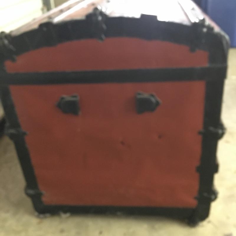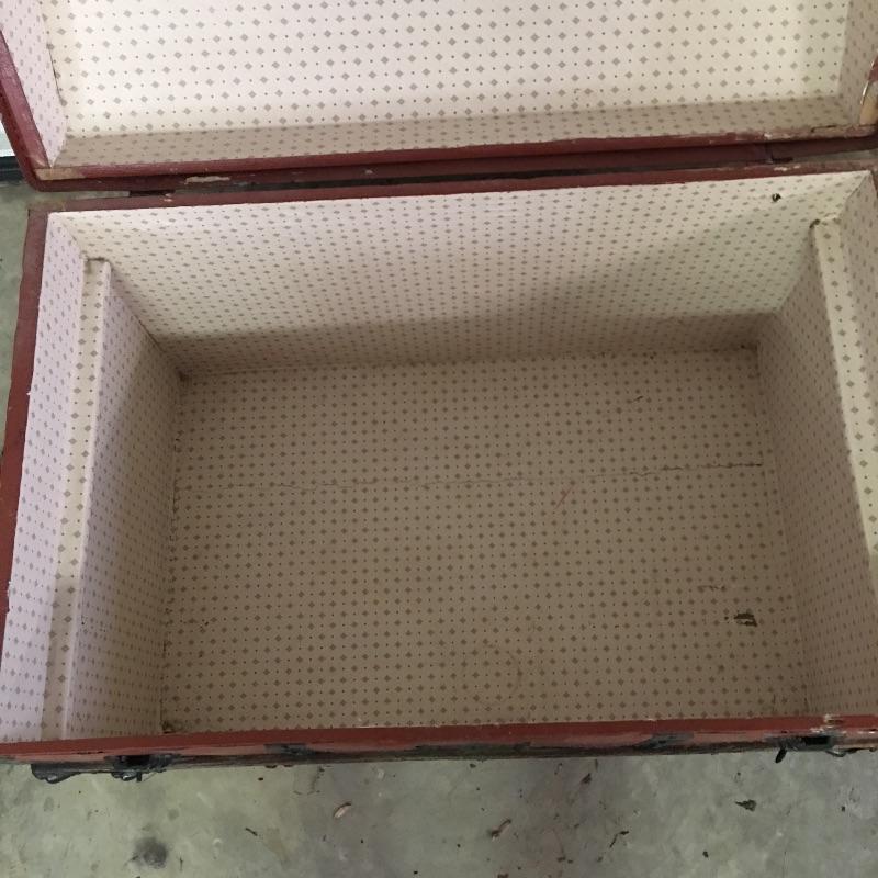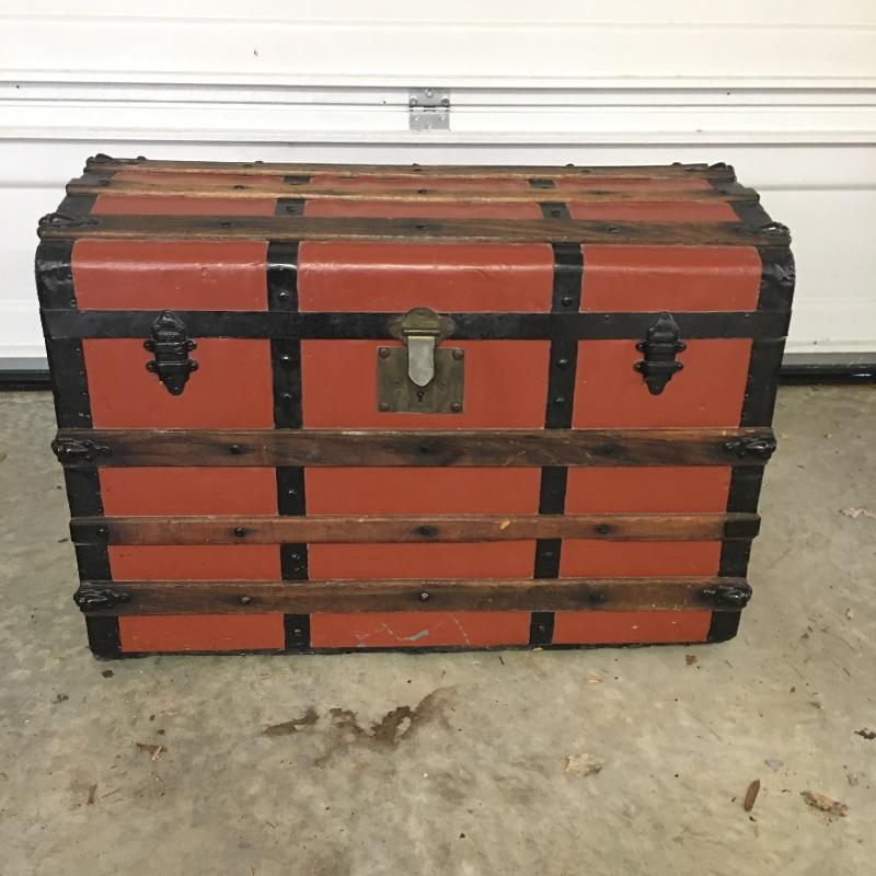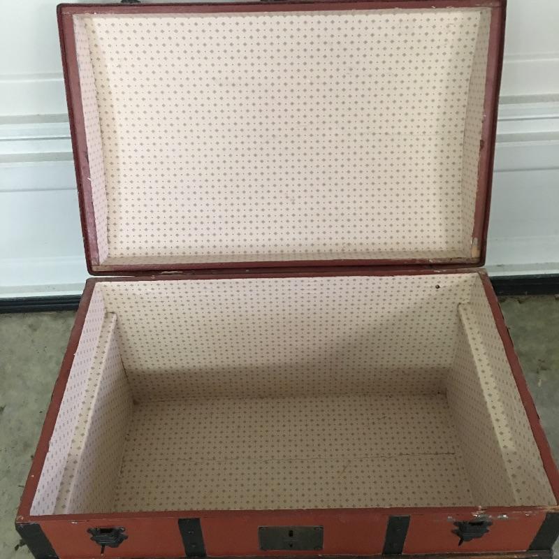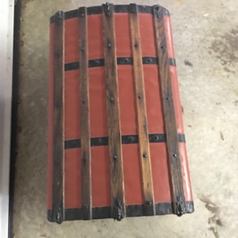 Vintage Steamer trunk that is metal with wooden slats. Inside of trunk in great shape but missing the organizer insert. Outside is missing handles and wheels on bottom. Trunk measures 20” x 33” x 23”.