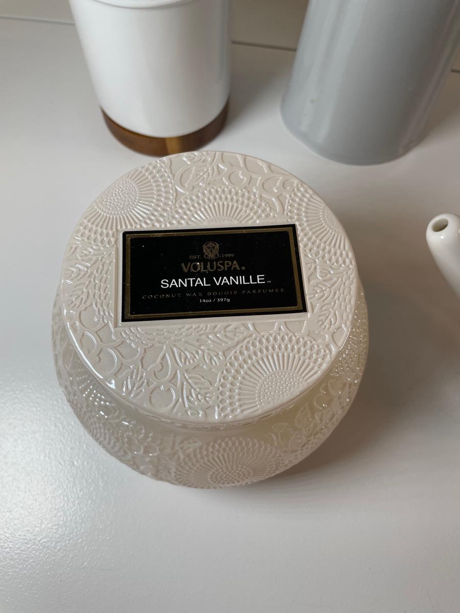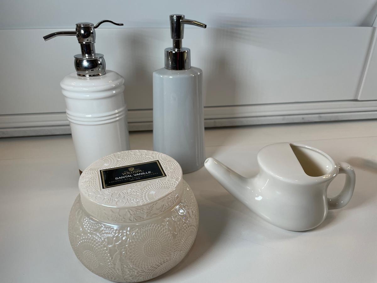 Santal Vanille scent, two ceramic soap dispensers and a ceramic Betty pot