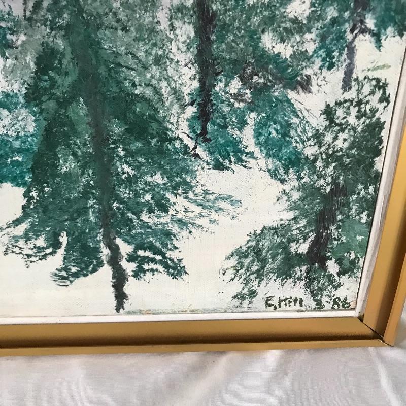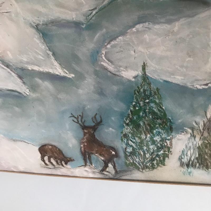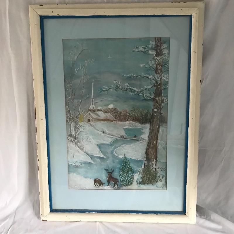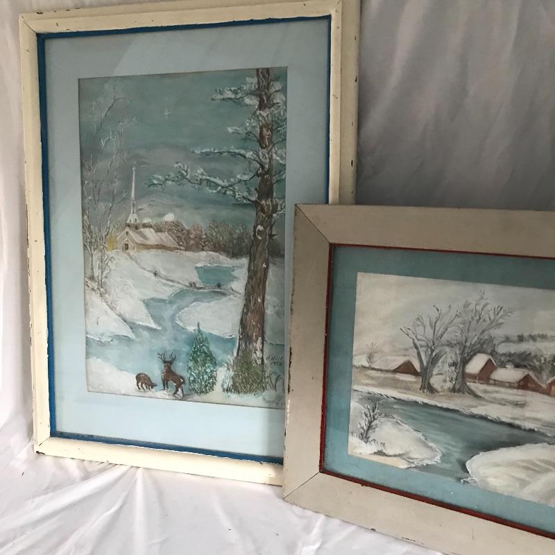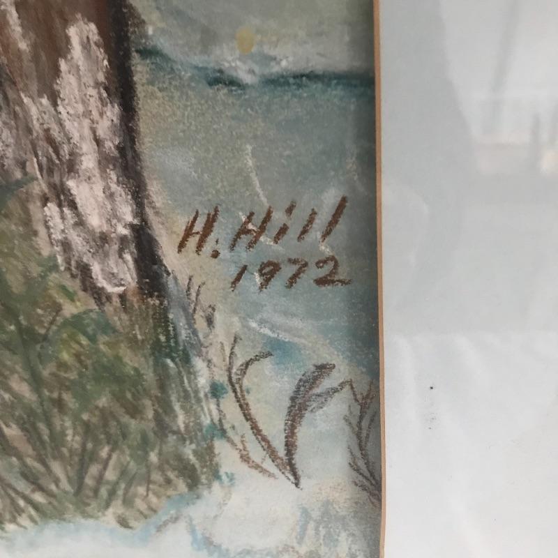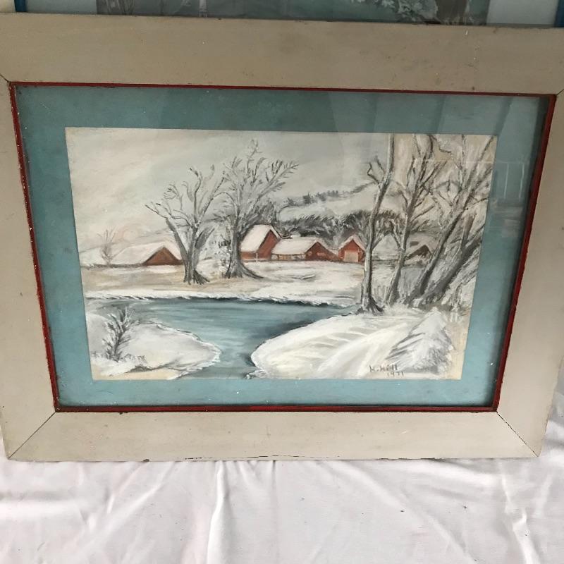 Lot includes three winter landscapes by Helen Hill. One is an oil, the other two are chalk or oil pastels. Largest measures approx. 33.5” x 25”, medium sized piece measures approx. 26.5” x 20” and the smallest one measures approx. 22” x 18”. Local pickup only.