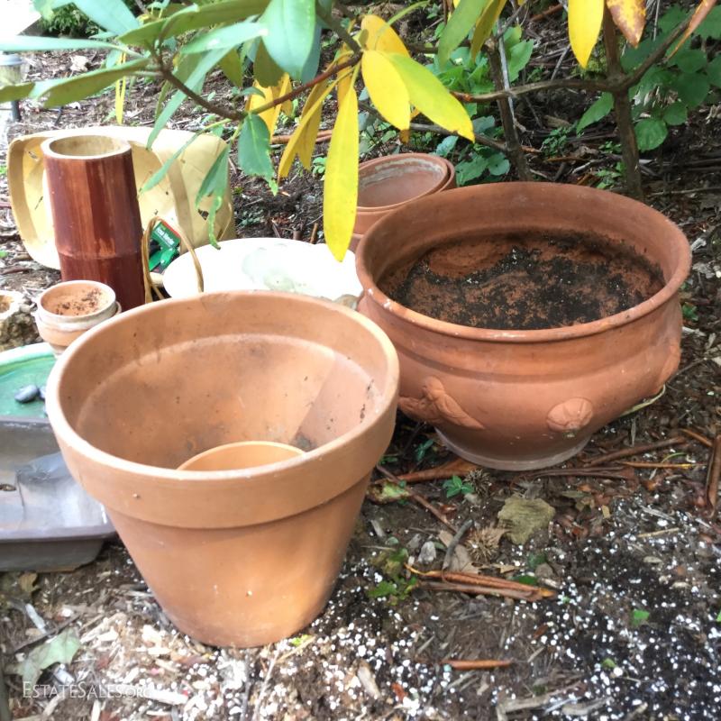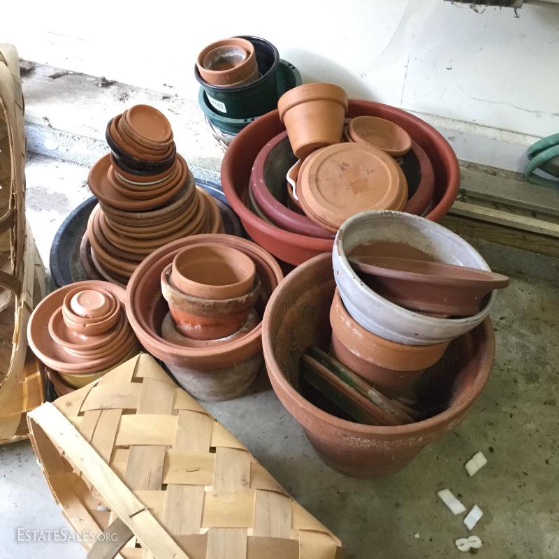 Large lot of clay planters, pots and saucers in various sizes. A few ceramic planters and four baskets also included. See photos. No Shipping. Only local pick up in Flat Rock, NC.