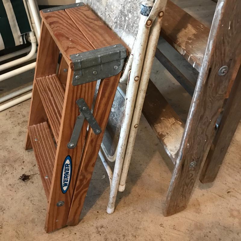 20’ aluminum extender ladder, 10” wood ladder, metal step stool and wooden Werner step ladder. Also an extender arm for 20’. This lot is available for local pick up in Flat Rock, NC only.