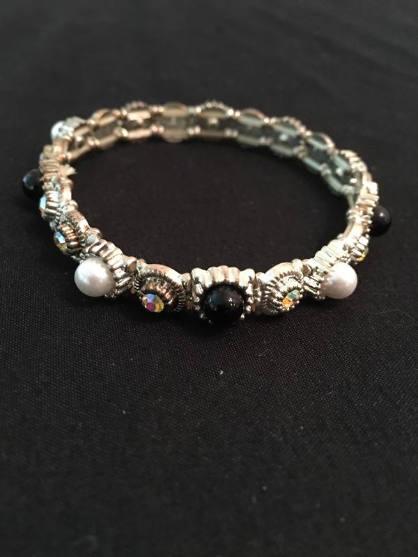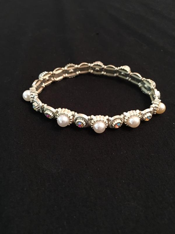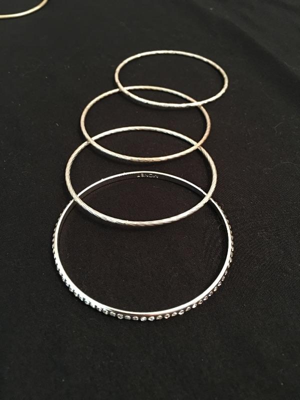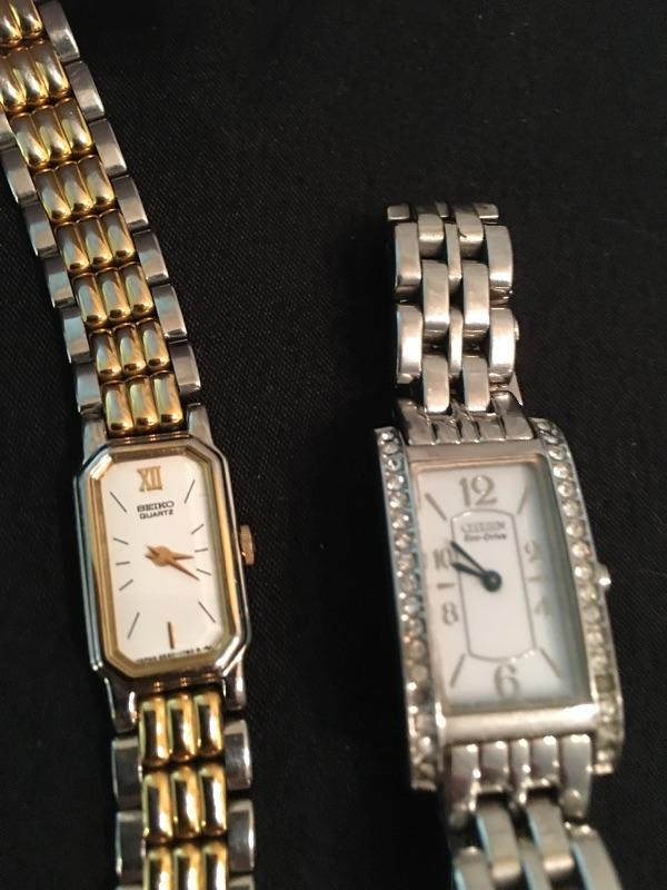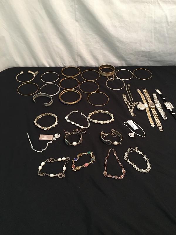 A large selection of bracelets and watches includes a Citizen watch, Seiko watch, unmarked pocket and wrist watch and a Stamper watch. Also includes twelve bangles, two stretchy bracelets, two hinged bracelets, cuff bracelet and more. Watches were not tested as they appear to need batteries.