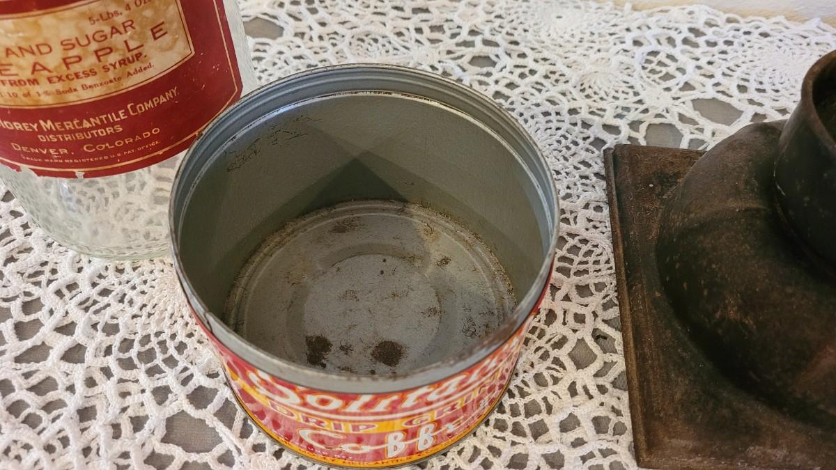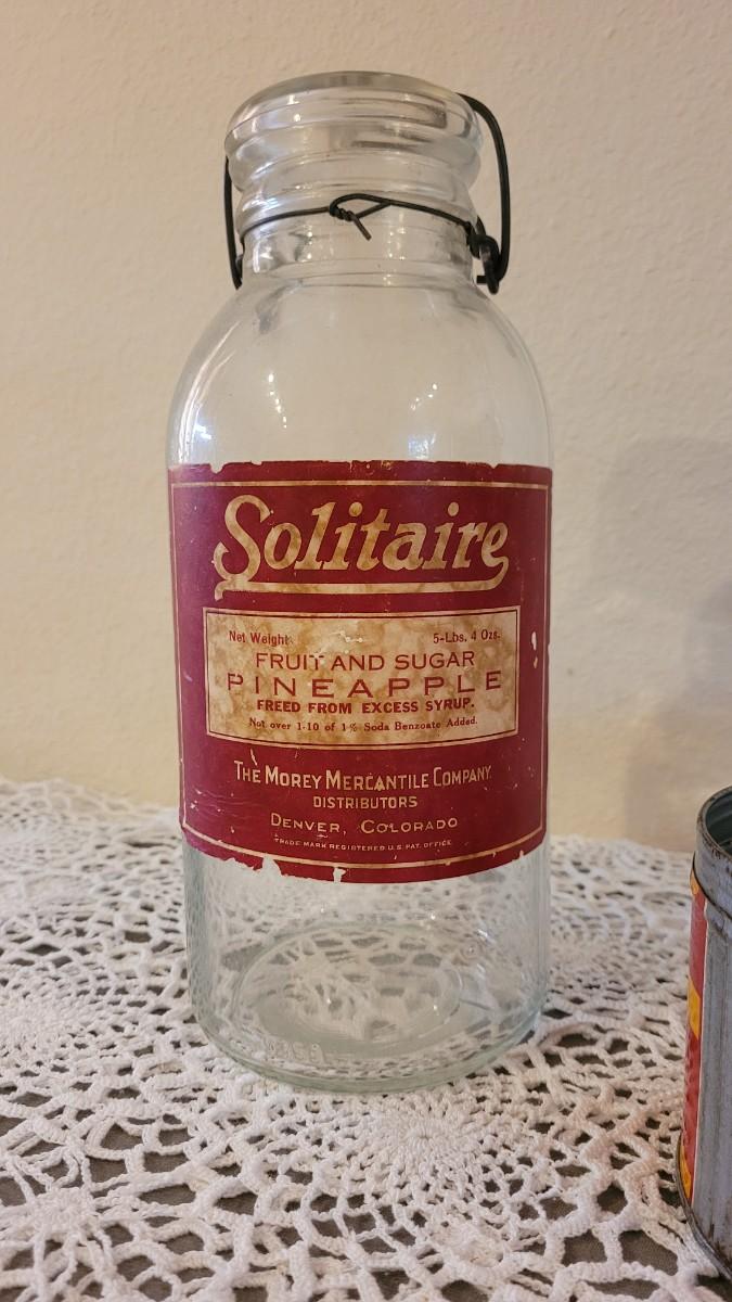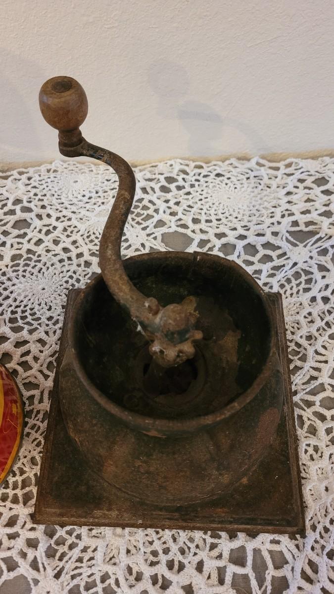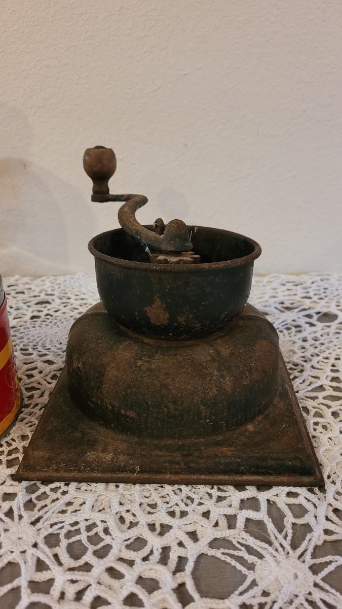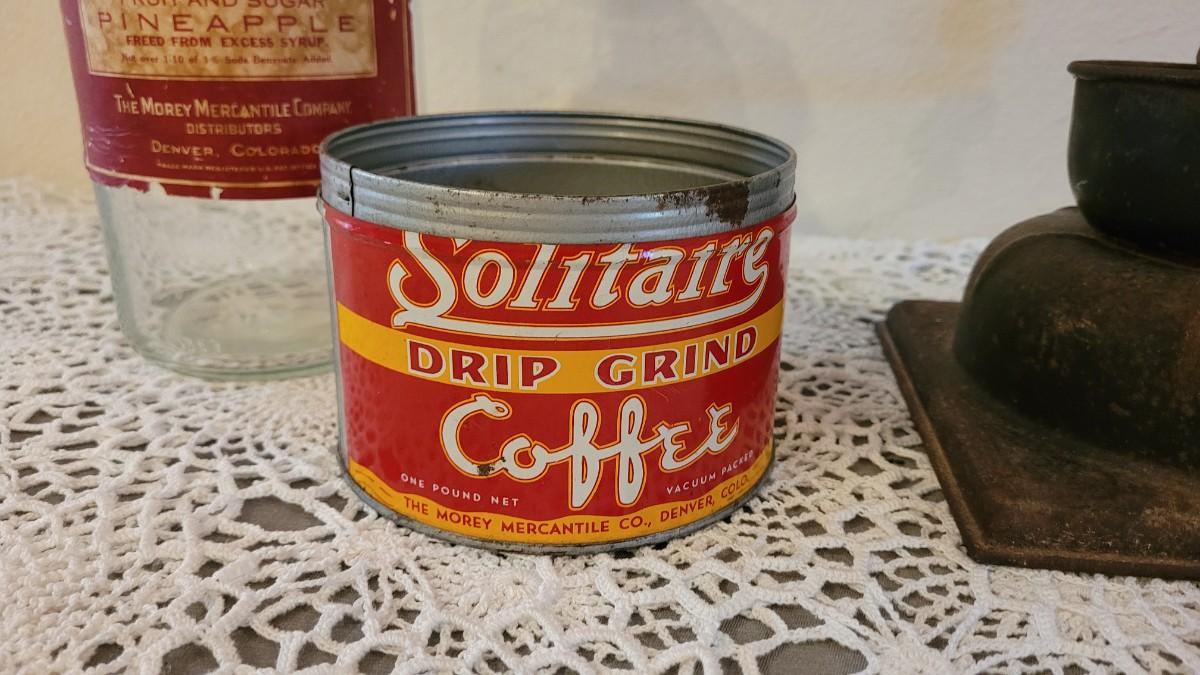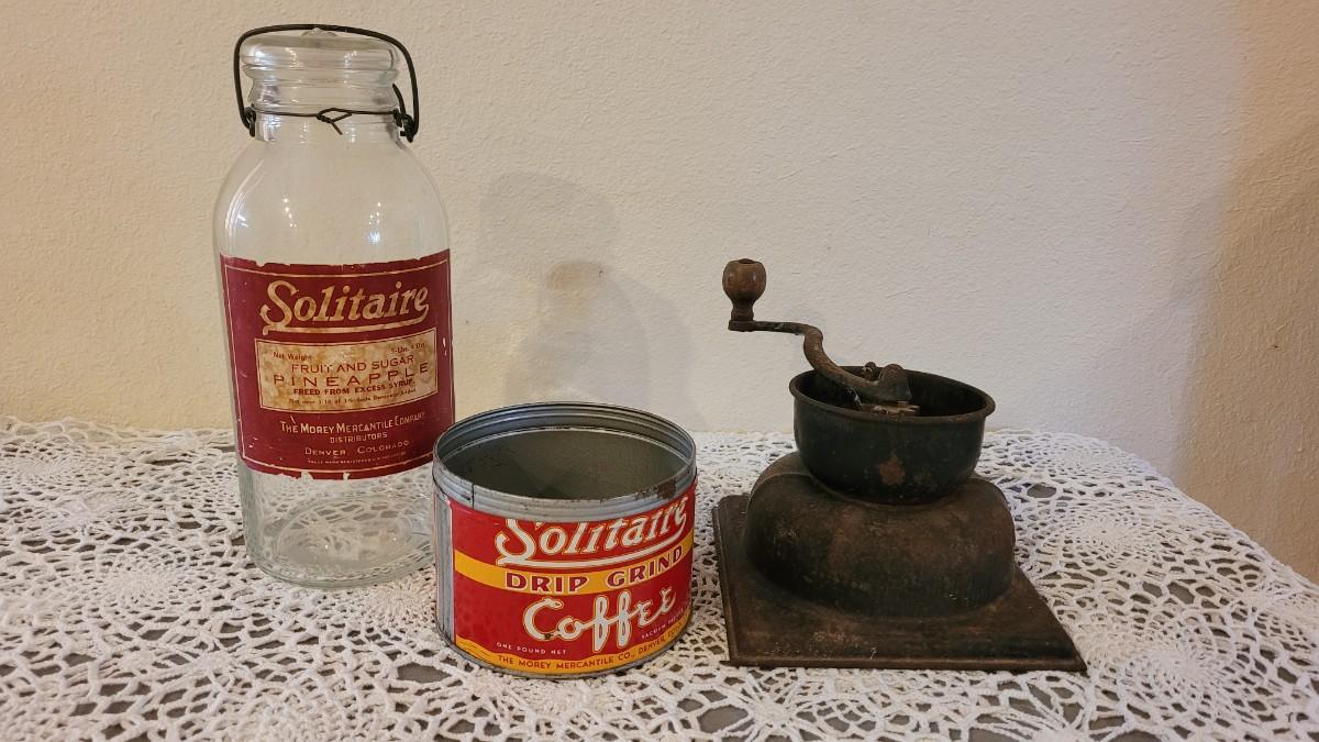 Lot 163: Antique Coffee Grinder, Solitaire Coffee Tin and Fruit & Sugar Pineapple Glass Jar