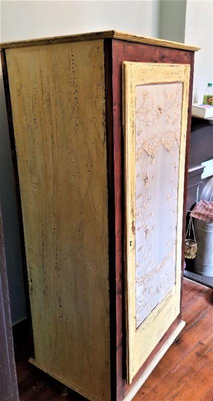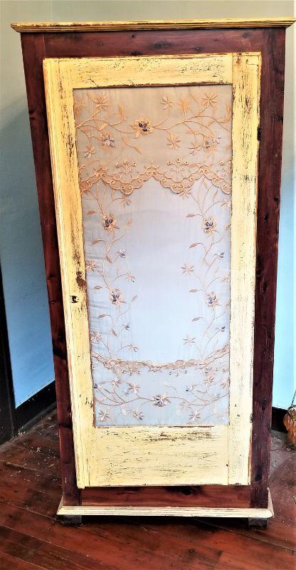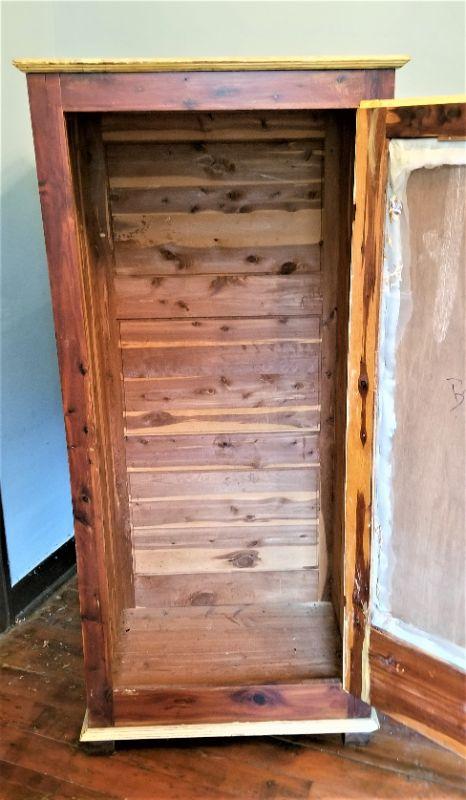 This piece has been "dolled up a bit" by the previous owner, but the bones are still there. Antique Cedar robe - inside has a rod for hanging clothes and the cedar in in good shape. Solid wood - heavy. Repaint/replace the fabric on the front and you are good to go. 30" across, 64" tall, 21.5" deep.
