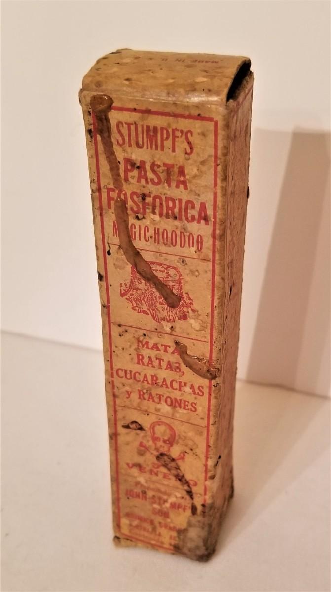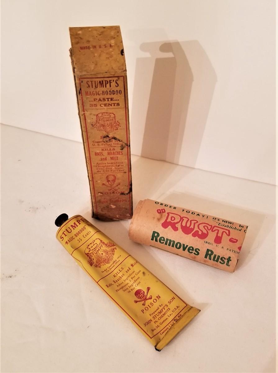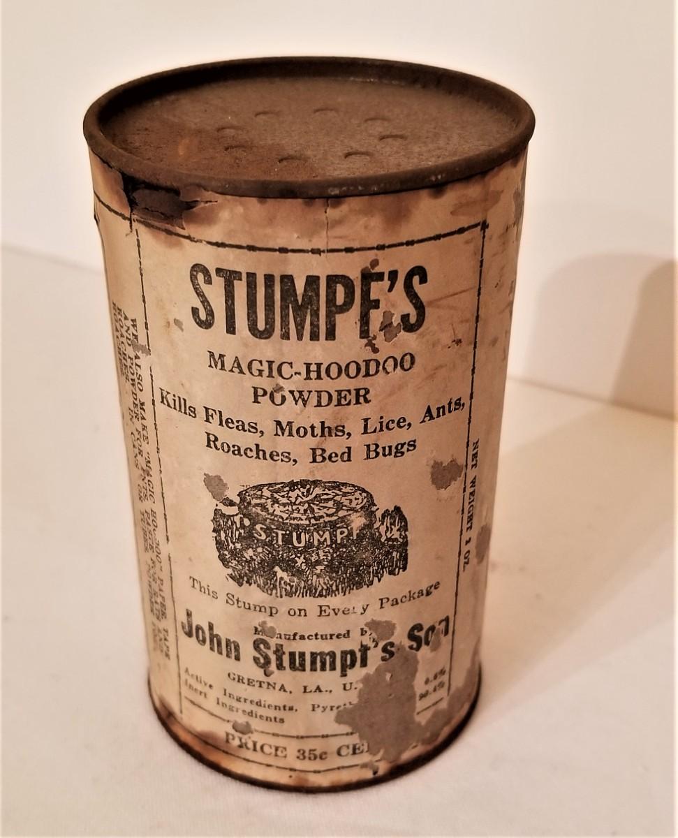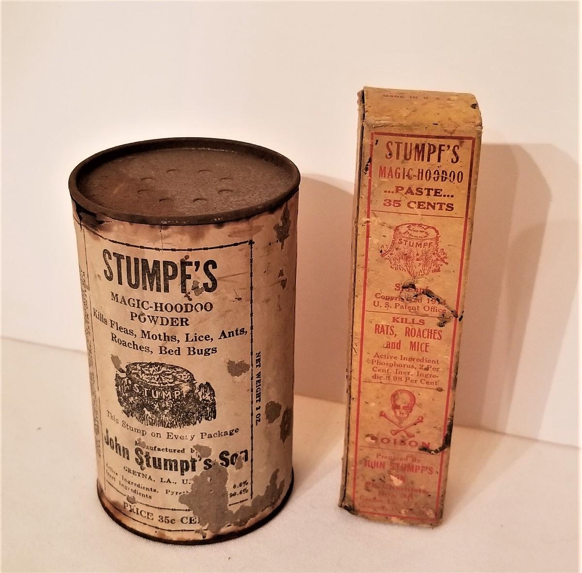 VERY cool lot here - antique tin of Stumph's "Magic Hoo-Doo Powder" and tube of "Magic Hoo-Doo Paste" - manufactured in Gretna, LA (turn of the century). Guaranteed to get rid of fleas, moths, Lice, Ants, Roaches, and Bedbugs - instructions on label in both English AND Spanish (a real rarity for those times). Antique condition, as found. Where are you ever going to see another one?