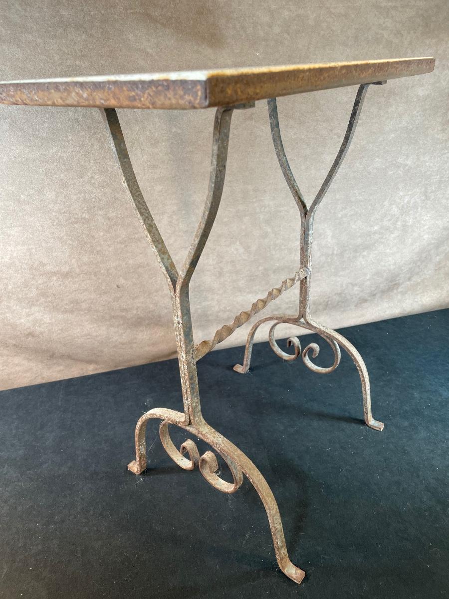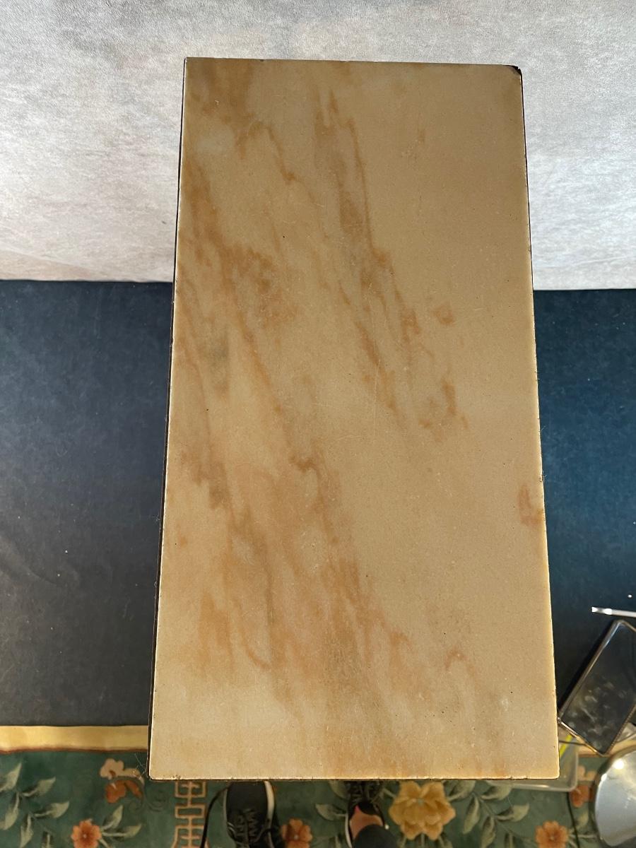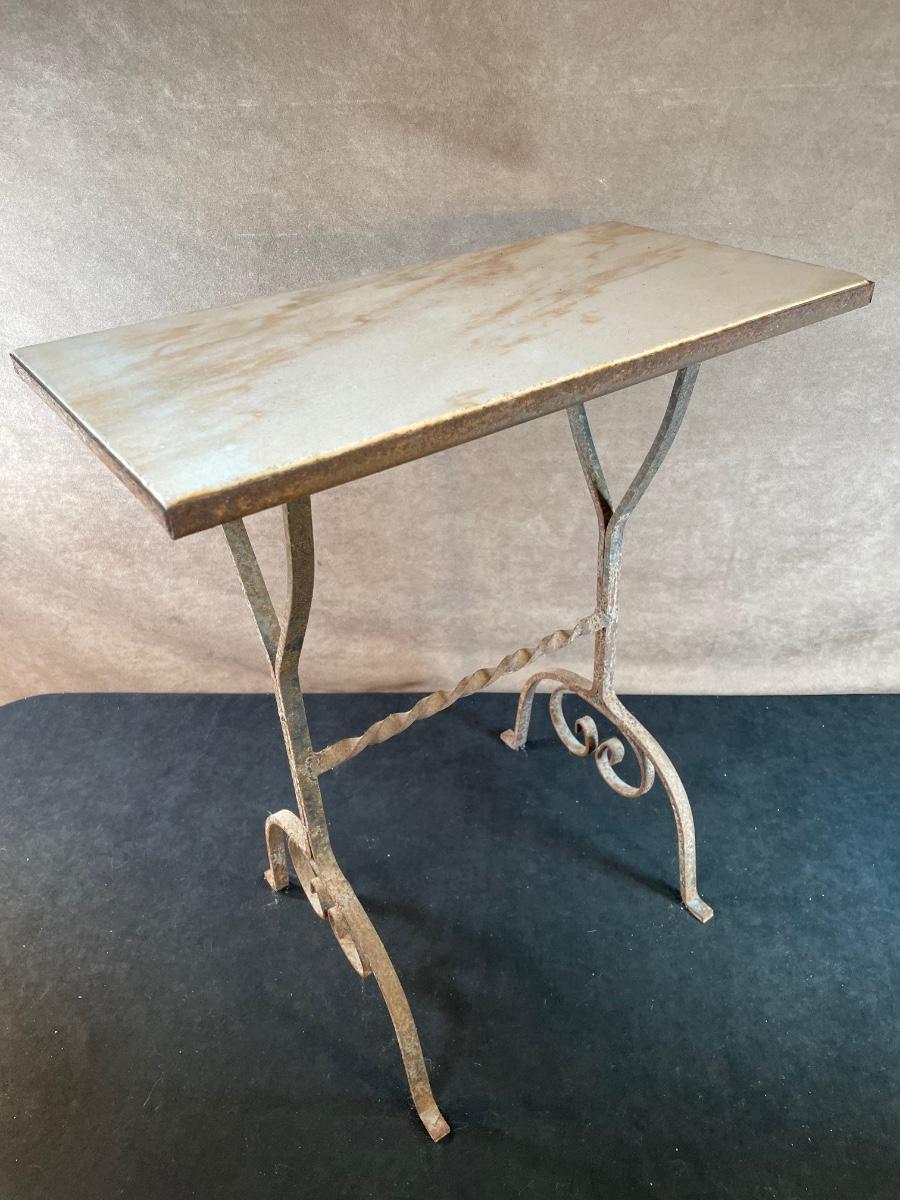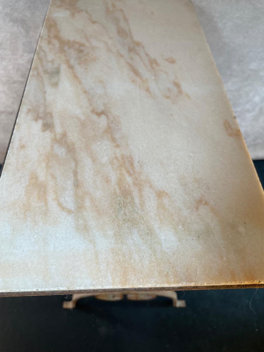 18" x 9" x 20.5". Marble slab inset into top of iron table base